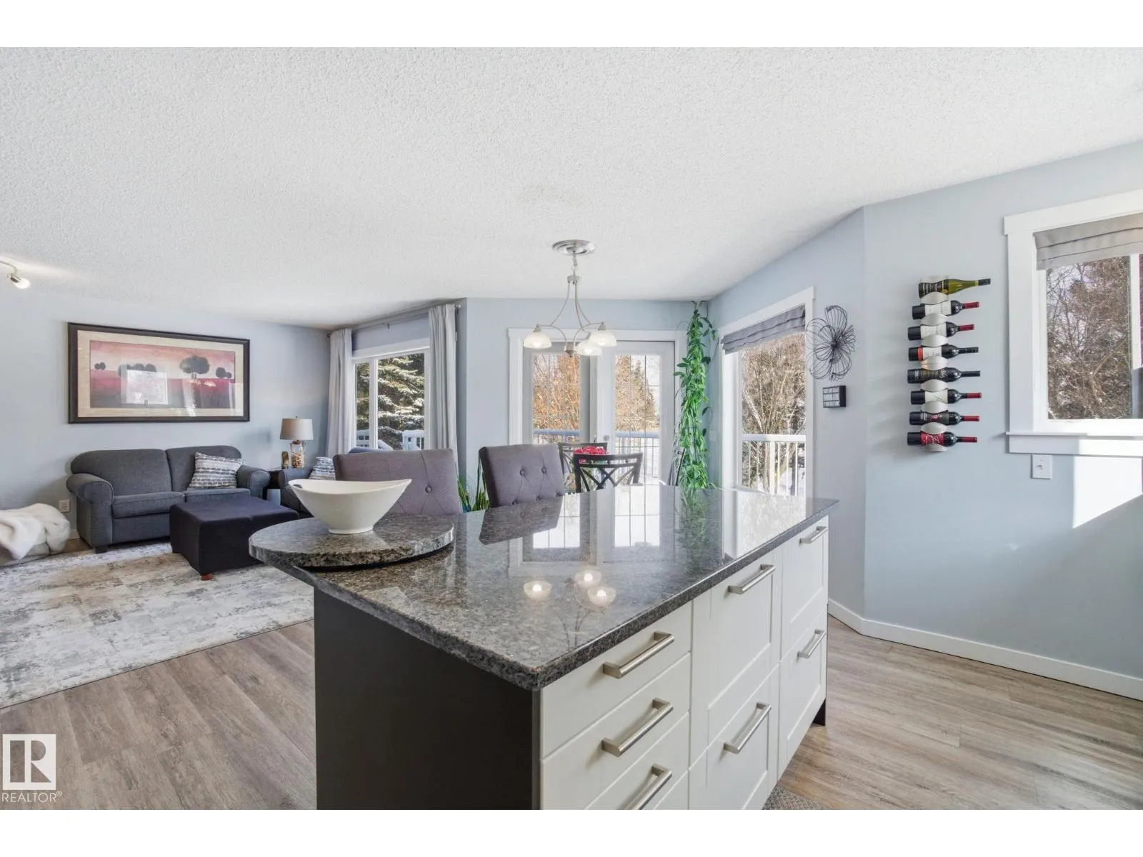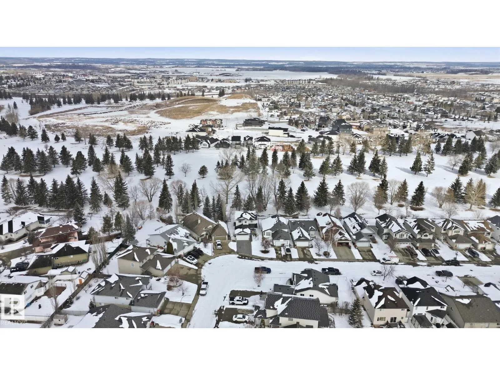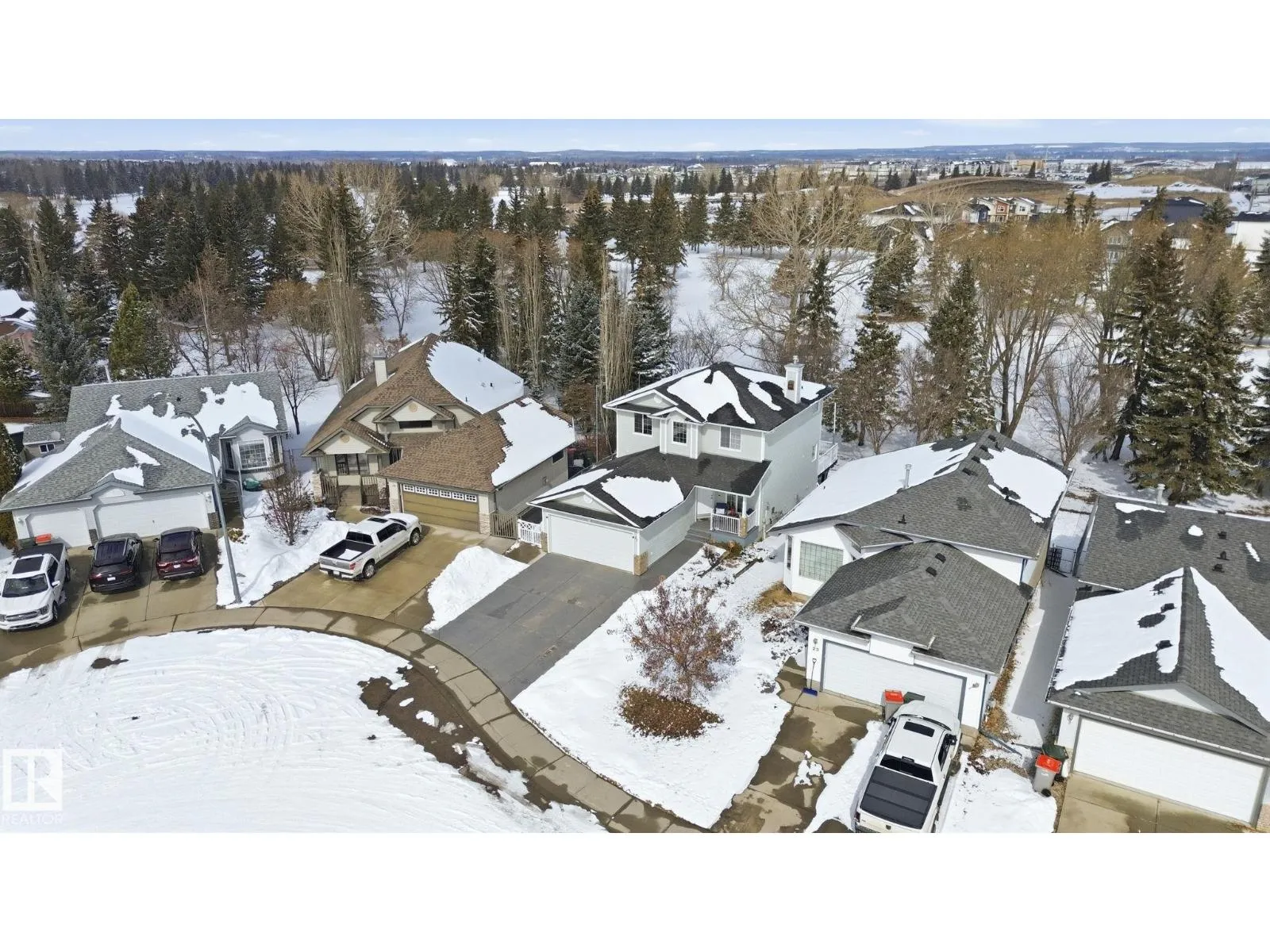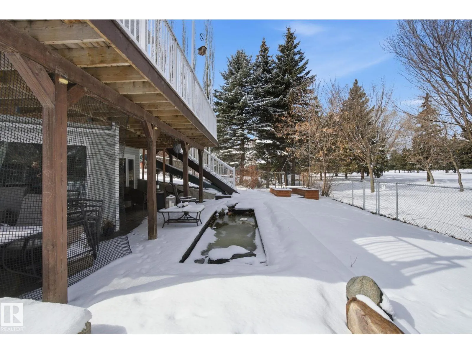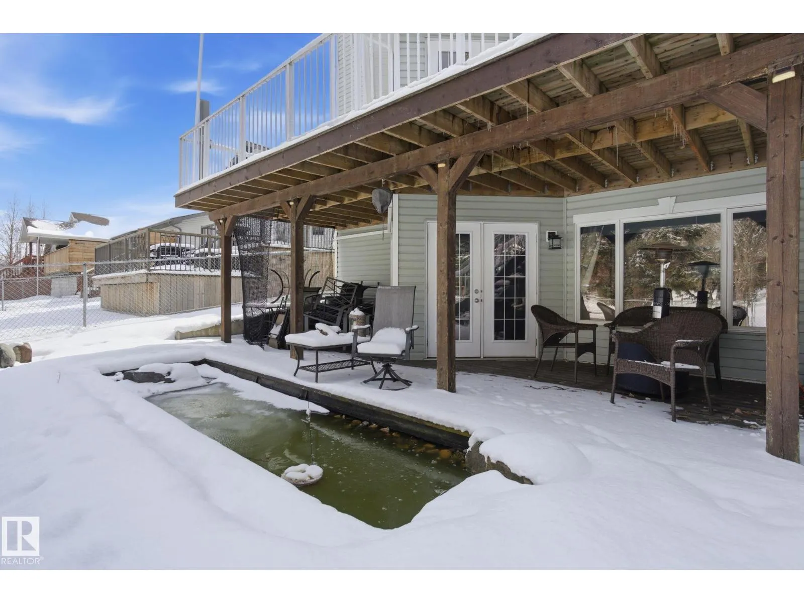 Beautiful WALKOUT 2-storey BACKING the GOLF COURSE in Stony Plain! Over 1500 sq ft PLUS fully finished basement. 18' ceilings greet you as you enter. Front flex room could be a great dining space, home office or formal living room. NEW kitchen is gorgeous with beautiful white cabinets, quartz countertops, corner pantry & updated appliances! Great breakfast nook with room to expand for guests! Large living room for more entertaining with gas fireplace. Tons of natural light through the windows looking onto the mature trees of the golf course. MAIN FLOOR LAUNDRY! Upstairs the master suite is a great size with large walk in closet and newly renovated 4pc ensuite. 2 more bedrooms are great for kids, guests or a home office. Walkout basement has large rec room space. It's even fully plumbed for wet bar or future 2nd kitchen. Another bedroom & 4pc bath. Large deck is great to spend a warm summer evening & yard is fully landscaped including picture, perfect Koi pond. It's your own private oasis!!! (id:27476)