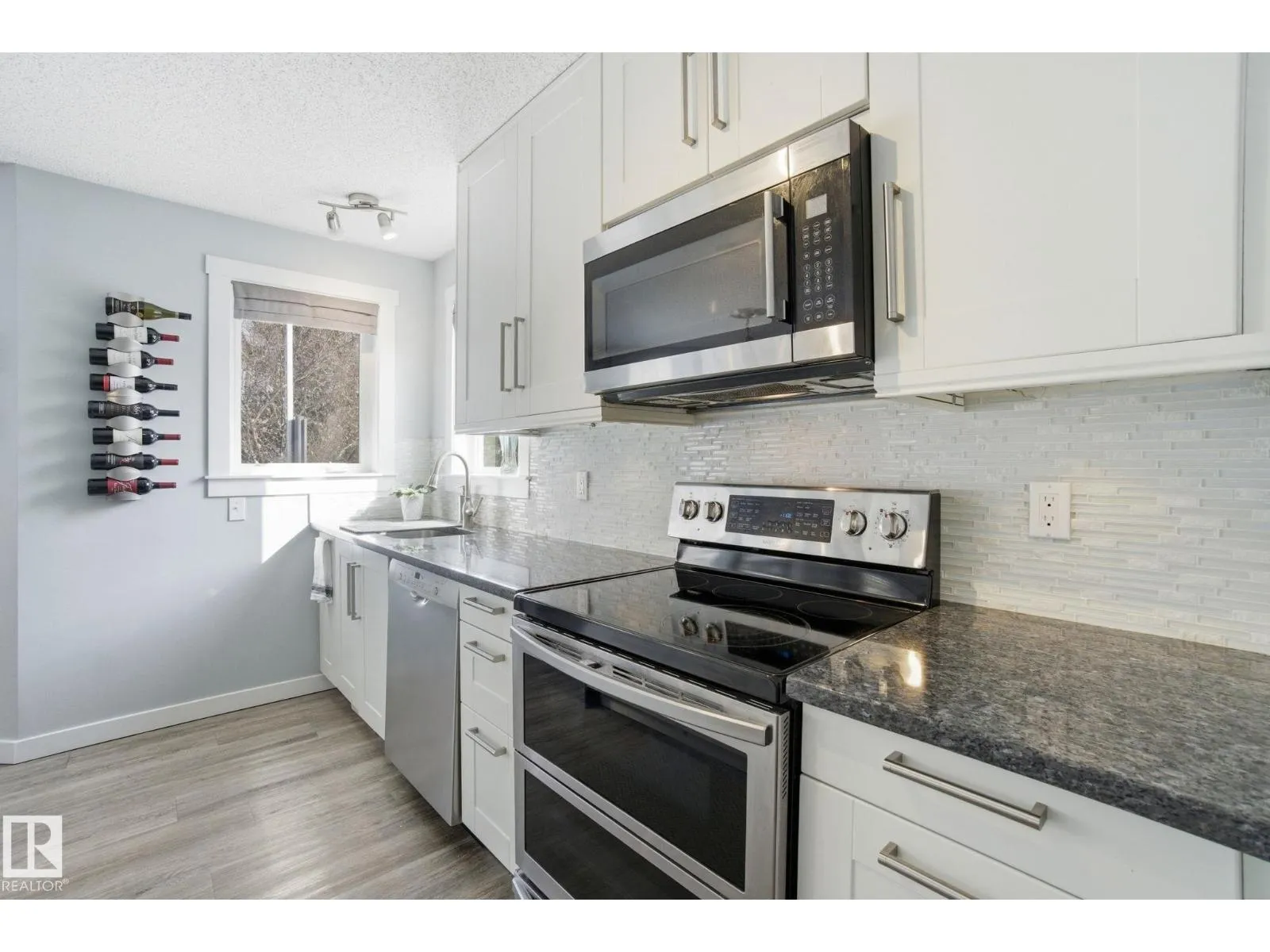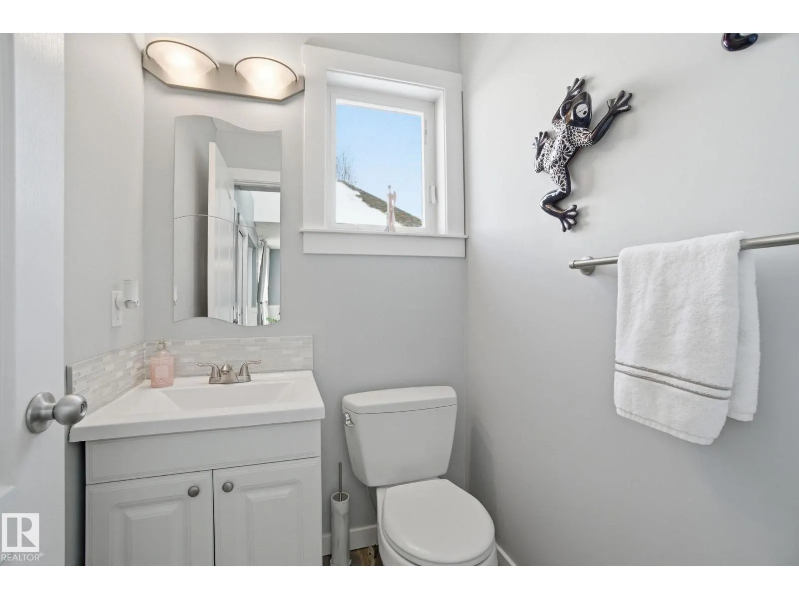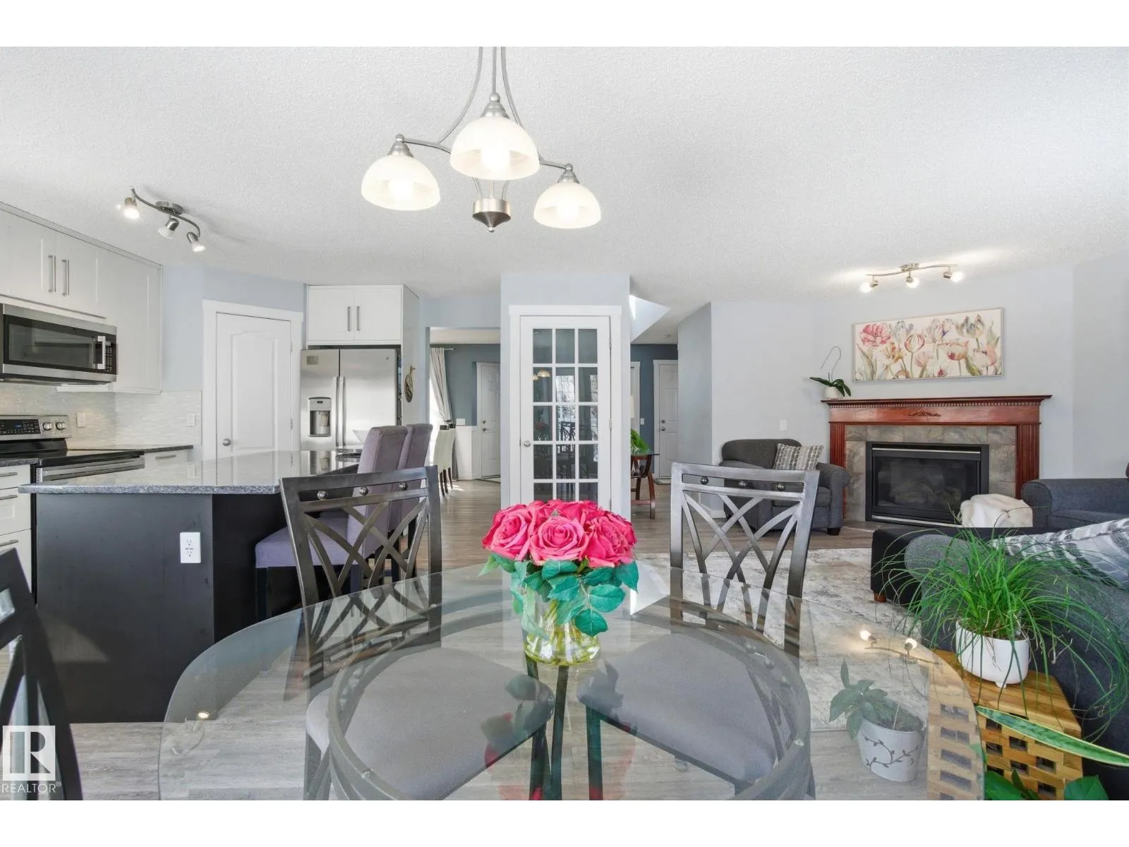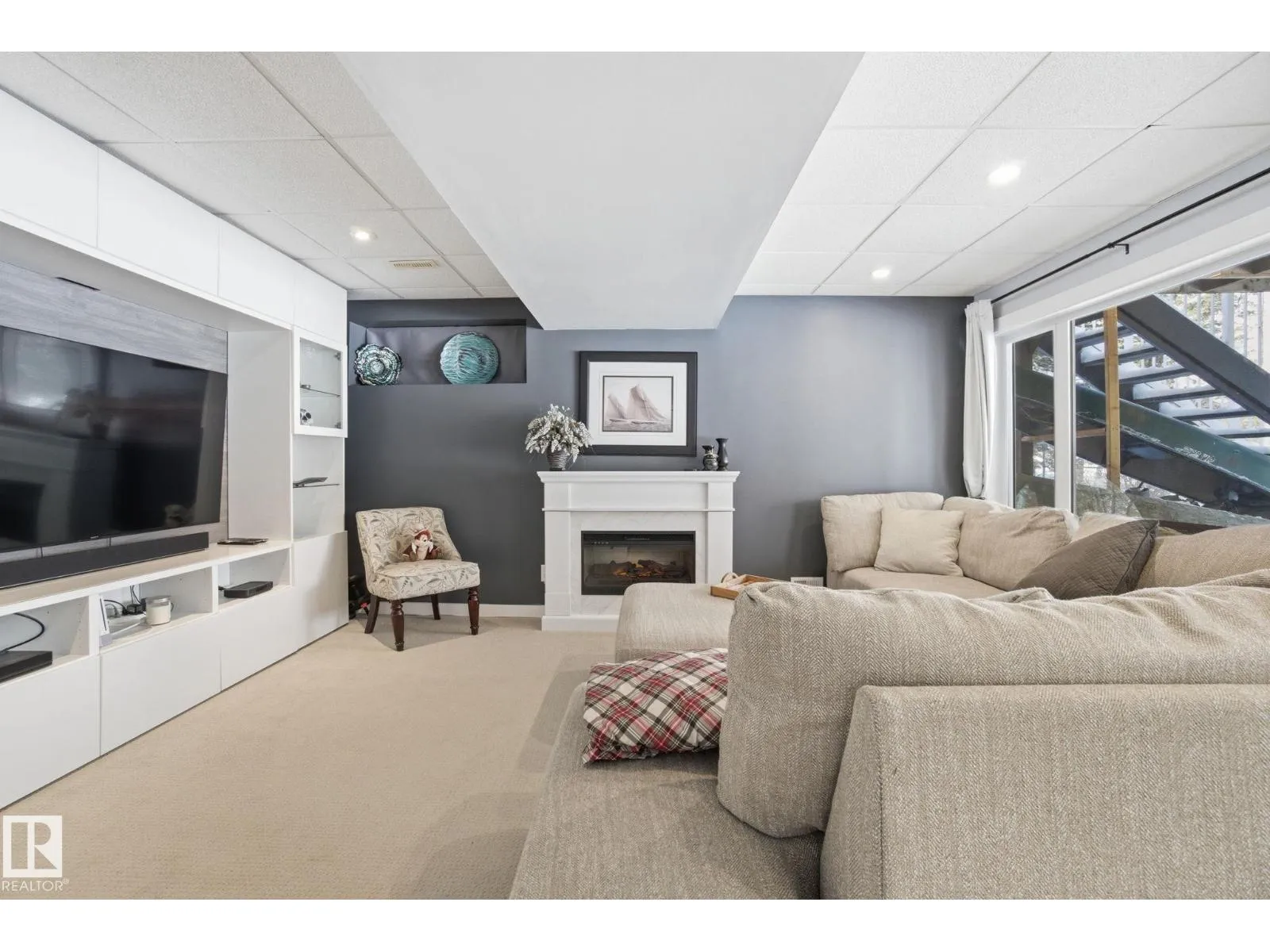 Beautiful WALKOUT 2-storey BACKING the GOLF COURSE in Stony Plain! Over 1500 sq ft PLUS fully finished basement. 18' ceilings greet you as you enter. Front flex room could be a great dining space, home office or formal living room. NEW kitchen is gorgeous with beautiful white cabinets, quartz countertops, corner pantry & updated appliances! Great breakfast nook with room to expand for guests! Large living room for more entertaining with gas fireplace. Tons of natural light through the windows looking onto the mature trees of the golf course. MAIN FLOOR LAUNDRY! Upstairs the master suite is a great size with large walk in closet and newly renovated 4pc ensuite. 2 more bedrooms are great for kids, guests or a home office. Walkout basement has large rec room space. It's even fully plumbed for wet bar or future 2nd kitchen. Another bedroom & 4pc bath. Large deck is great to spend a warm summer evening & yard is fully landscaped including picture, perfect Koi pond. It's your own private oasis!!! (id:27476)