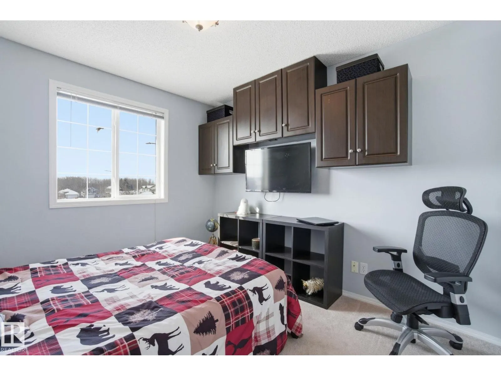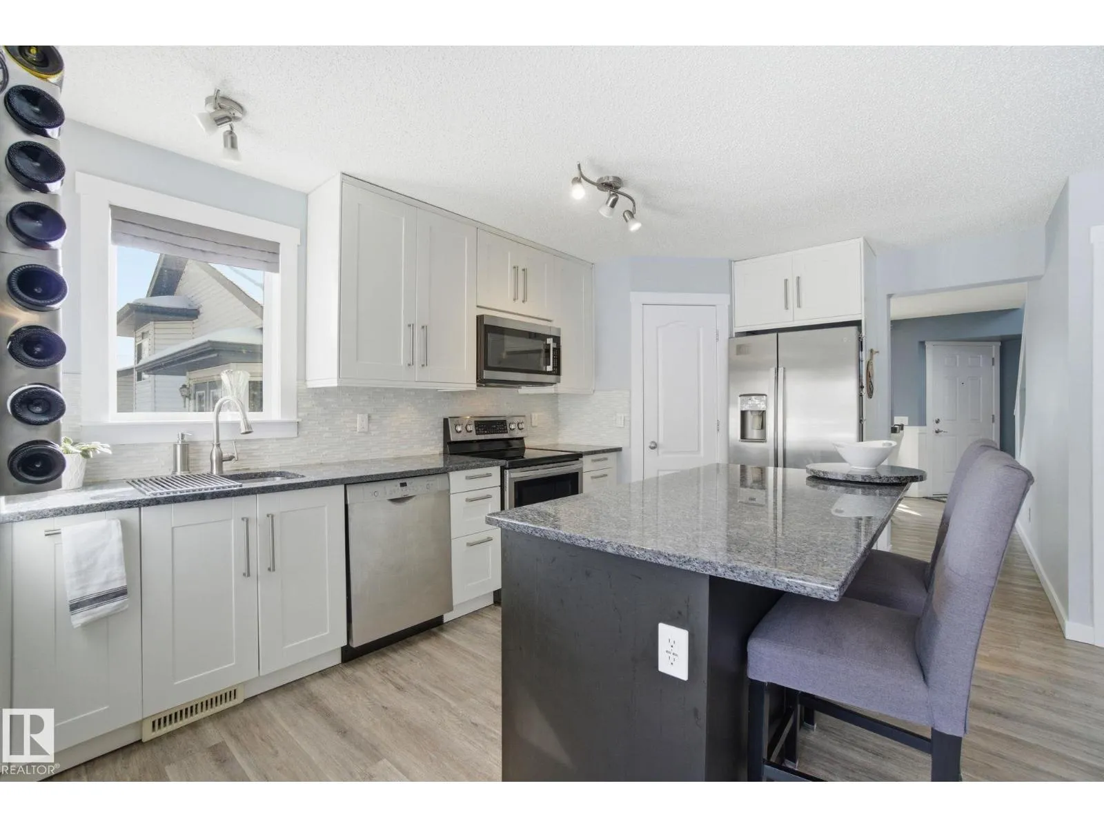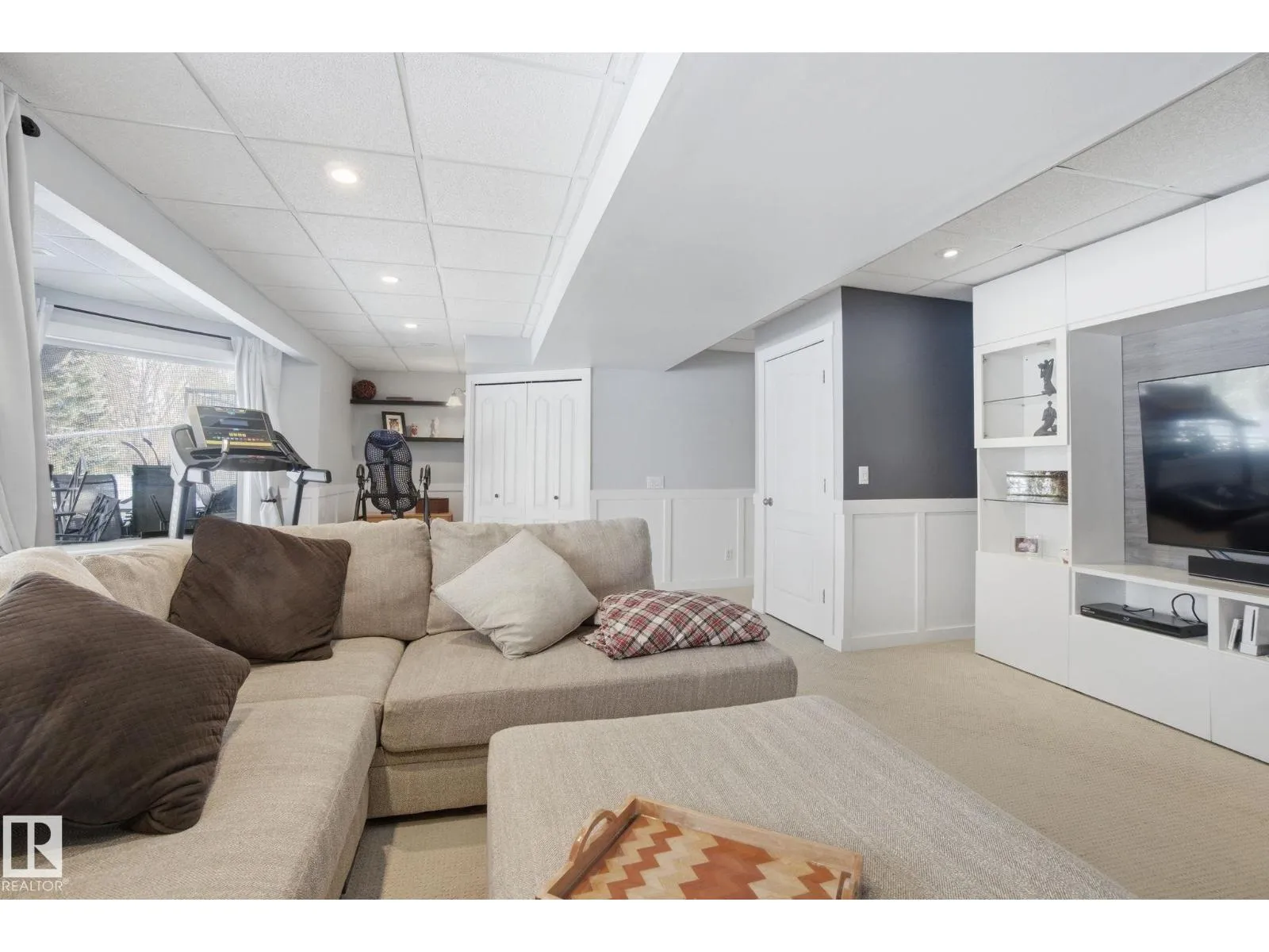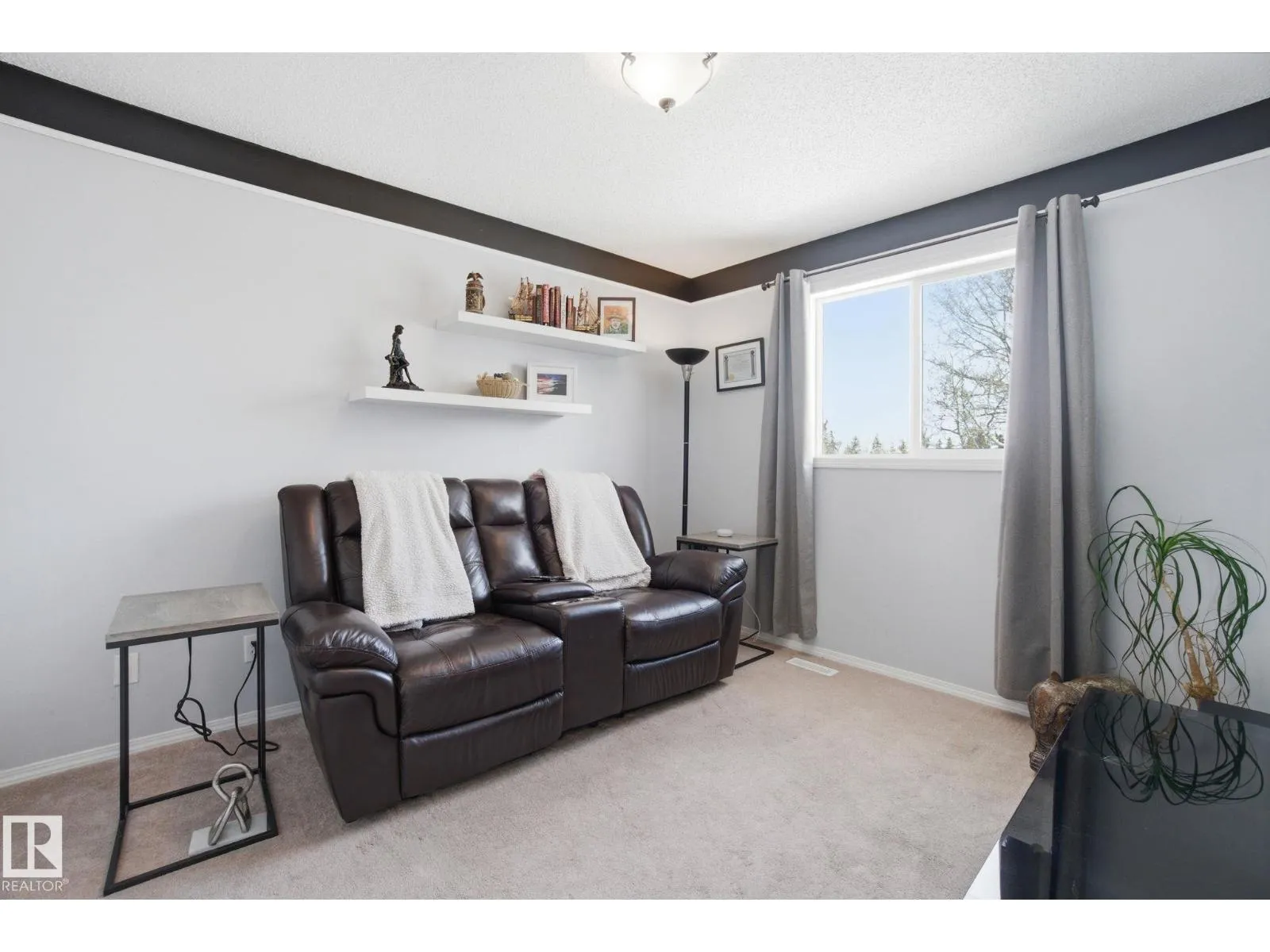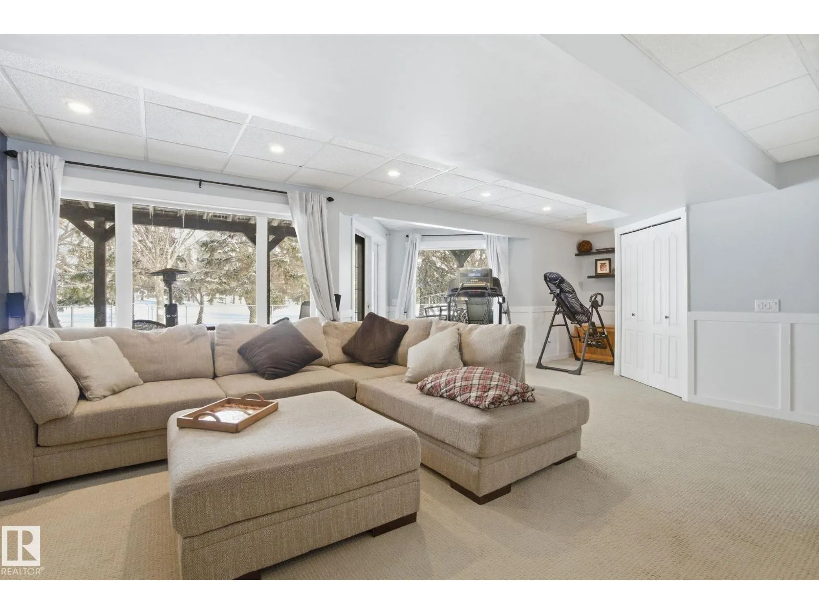 Beautiful WALKOUT 2-storey BACKING the GOLF COURSE in Stony Plain! Over 1500 sq ft PLUS fully finished basement. 18' ceilings greet you as you enter. Front flex room could be a great dining space, home office or formal living room. NEW kitchen is gorgeous with beautiful white cabinets, quartz countertops, corner pantry & updated appliances! Great breakfast nook with room to expand for guests! Large living room for more entertaining with gas fireplace. Tons of natural light through the windows looking onto the mature trees of the golf course. MAIN FLOOR LAUNDRY! Upstairs the master suite is a great size with large walk in closet and newly renovated 4pc ensuite. 2 more bedrooms are great for kids, guests or a home office. Walkout basement has large rec room space. It's even fully plumbed for wet bar or future 2nd kitchen. Another bedroom & 4pc bath. Large deck is great to spend a warm summer evening & yard is fully landscaped including picture, perfect Koi pond. It's your own private oasis!!! (id:27476)