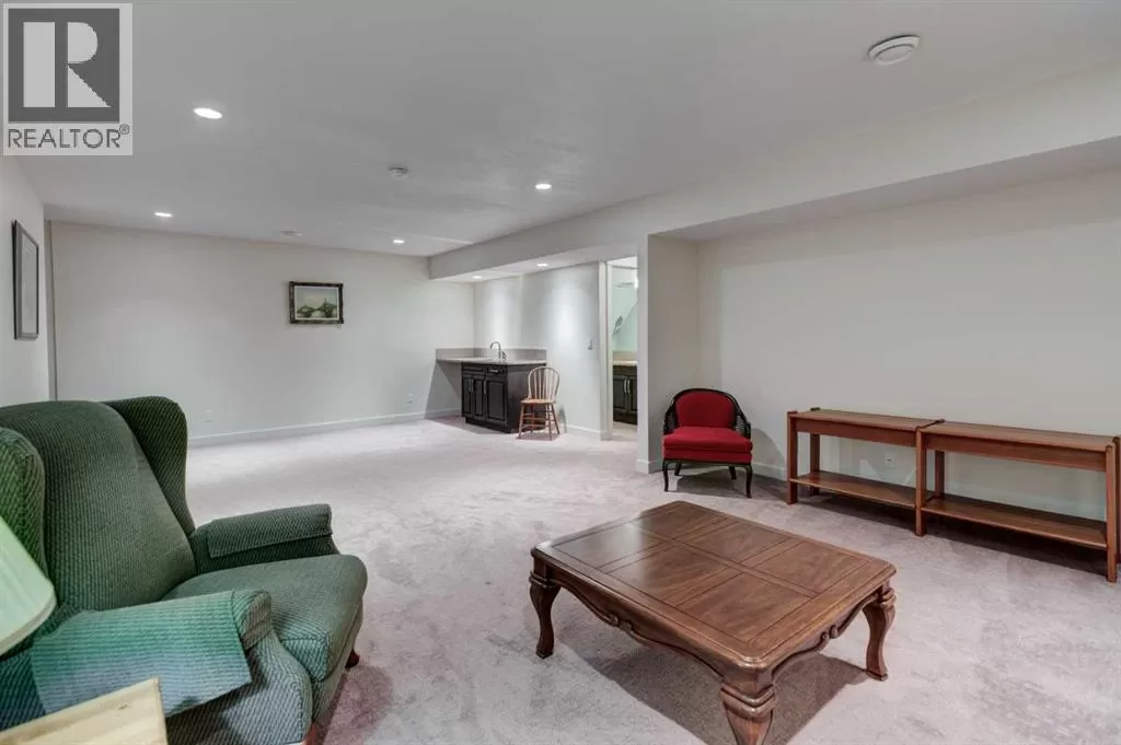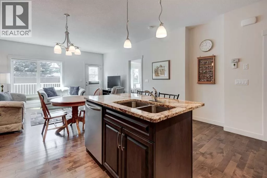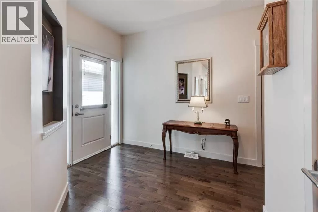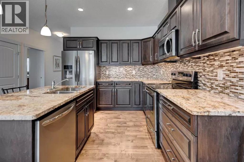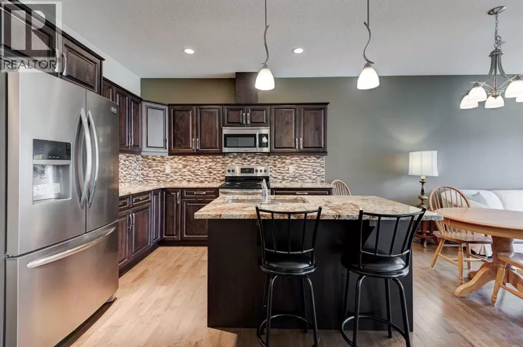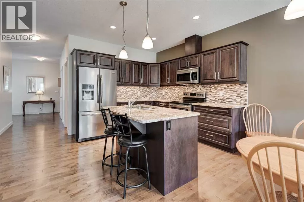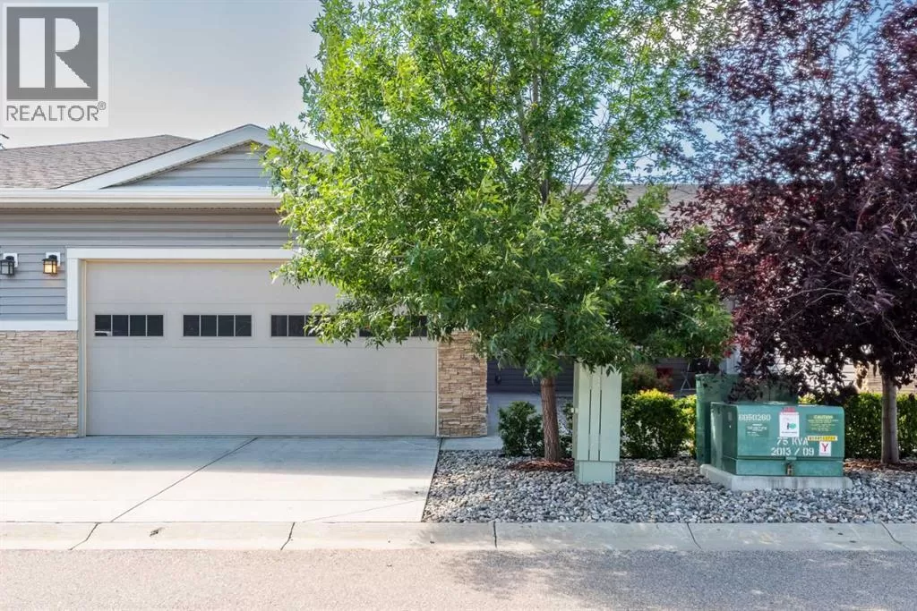 Beautifully maintained fully developed VILLA in Sagewood Adult Living (55+...ask your Realtor® for details) community in Strathmore is now available for a quick possession. This former SHOWHOME is fully upgraded and features 9 ft ceilings, wide hallways, granite countertops, throughout the main level, hardwood floors, copious kitchen cabinetry with soft close cupboards and drawers, under cabinet lighting and stainless steel appliances. The floorplan is open concept with a West exposure from the living room. The primary suite presents luxuriously with a large bay window, enough space for a king size bed and dressers and accompanied by a walk in closet. The en suite has his and her sinks, lots of storage in the vanity and a full sized shower. The main level conveniences extend to include a 3 piece guest bathroom, laundry, and a second bedroom or flex room, as it can also be used as a dining room, den or tv room. The lower level contains another bedroom, additional full bathroom, spacious family room with games table area and a wet bar. Storage? There is more than ample storage! Find space here to add a hobby room! There is parking for you in the double attached garage and guest parking a few doors down. The neighbors are wonderful and welcome social gatherings. There are ample walking paths, pickle ball courts, indoor swimming, shopping, hospital, volunteer opportunities and many community activities in the Town of Strathmore. Many families rely on extended members to help with childcare. Perhaps your grandchildren attend one of the schools that are in walking distance... Call your Realtor® to view this luxury villa! (id:27476)