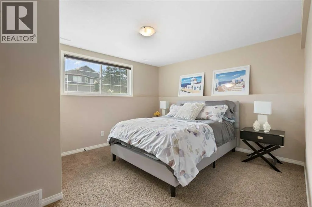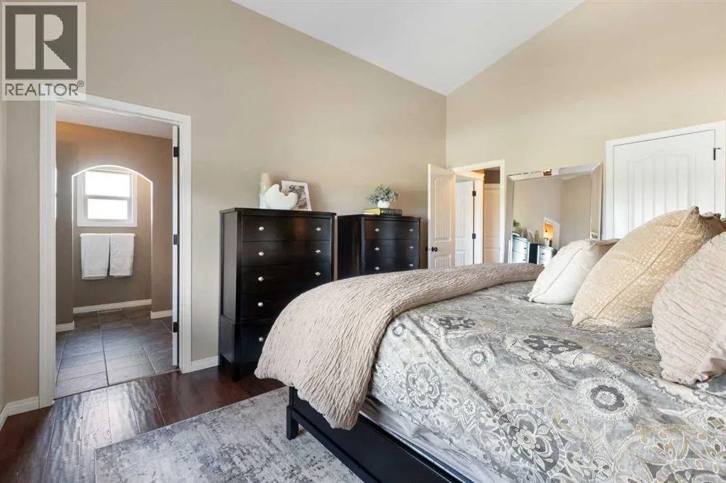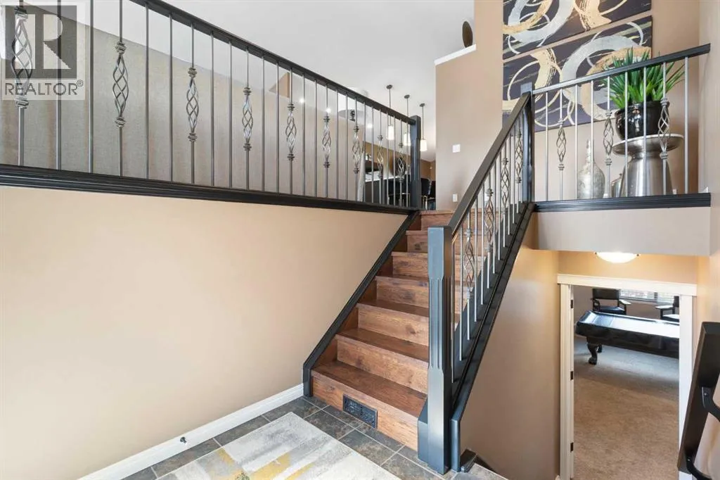 Exquisite 5-bedroom, three bathroom walkout! Welcome to a home where elegance meets comfort, and every detail has been thoughtfully curated. Perfectly positioned with no neighbors behind, this stunning bi-level offers a serene backdrop of wide open space and a long list of luxurious upgrades. From the moment you arrive, youâll be charmed by the freshly landscaped yard, the new roof and eavestroughs, the new modern garage door and the oversized garage. Inside, natural light floods the open-concept main floor, where rich quartz counters sparkle against stainless steel appliances, and soft-close cabinetry with custom pullout drawers adds both refinement and function. Gather by the sleek electric fireplace or step onto the raised composite deck, adorned with glass railings and a gas line, to savor golden summer evenings and uninterrupted views. The primary retreat feels like a sanctuary, crowned with soaring 12 ft vaulted ceilings and a spa-inspired ensuite that invites you to unwind in luxury. Two additional bedrooms and a full bath complete the main level with both warmth and style. The second bedroom has a secret storage area behind the bookcase, designed for a play area, extra bed space or storage. The fully finished walkout basement is designed for both relaxation and celebration. Heated floors, a cozy electric fireplace, and a welcoming rec room with wet bar and pool table set the stage. Step into the luminous three-season sunroom with infrared heating and enjoy the beauty of every season while overlooking your private, fully landscaped backyard. Two spacious bedrooms and full bath complete the lower level. Every comfort has been consideredâcentral A/C, central vac, and a brand-new 75-gallon hot water tank are among the many thoughtful upgrades. With its timeless finishings, gracious flow, and an idyllic setting, this Strathmore home is more than a residenceâitâs a lifestyle. (id:27476)