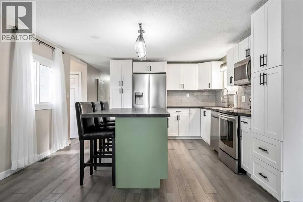 ***Open house November 15, 2025 12-2PM*** Sitting on a huge pie-shaped lot just under 8,000 sqft, this fully redone property is perfect for anyone who loves space, privacy, and the freedom to work on projects. The double detached garage offers plenty of room for vehicles, tools, or hobbies, while the sprawling backyard is ideal for hosting summer BBQs or relaxing around a cozy firepit. With no homes directly behind and backing onto Brentwood Elementary School, this location truly has it all. The roof was also redone within the last two years. Step inside and youâll be amazed by the transformationâthis home has been completely renovated from top to bottom. Featuring new drywall, vinyl plank flooring throughout, upgraded doors, and all-new appliances, no detail has been overlooked. The kitchen has been fully redesigned with ample cupboard space, a moveable island with extra storage, and modern finishes. Itâs truly a chefâs dream, perfect for cooking your favourite meals while entertaining guests. The interior offers a bright, functional layout with two bedrooms plus a versatile den or office, ideal for working from home. Off the den, step onto your newer deckâan inviting spot to enjoy your morning coffee or take a break during the day. The 4-piece bathroom features a soaker tub, walk-in shower, and a stylish vanity with ample storage, all beautifully finished with elegant tile. Down the hall, the spacious laundry room provides plenty of room for organization and everyday convenience. The primary bedroom easily accommodates a king-size bed with additional space for a reading nook or sitting area, while the second bedroom is perfect for a child, guest, or nursery. Outside, the expansive, fully fenced backyard is lined with mature trees, offering privacy and tranquility. The garage includes extra storage, and thereâs an additional shed behind it for even more space. Located close to parks, pathways, the Strathmore Aquatic Centre, sports fields, golf course, shopping, res taurants, and the Strathmore District Health Services, this home combines small-town charm with everyday convenience. Homes like this donât come up oftenâbook your showing today before itâs gone! (id:27476)