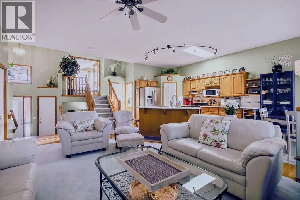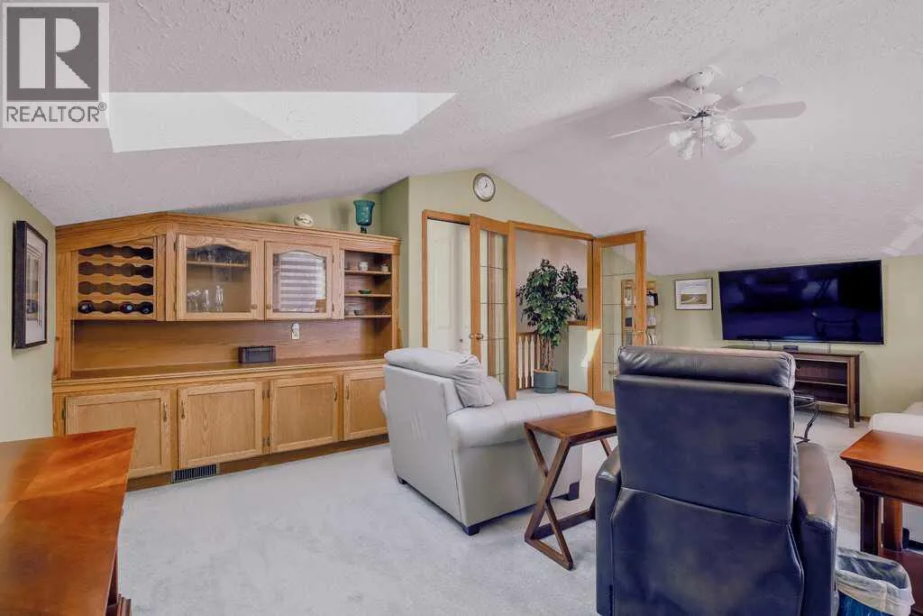 Welcome to your lovingly maintained and updated home located in Cambridge Glen, close to schools and recreational facilities, this home backs onto the bike/walking path system connecting you and your family to several parks including Dinosaur Hill just steps away. The yards are beautifully landscaped with large trees and lush gardens and feature an underground sprinkler system. The home boasts an open concept main floor with kitchen, dining area, living room, and full bathroom. You will immediately notice the soaring 10 foot ceilings with three skylights bringing in incredible natural light throughout the day. The kitchen features loads of cabinets, a large island, and a large corner pantry. The bonus room above the garage is great space for an office, den, or tv room, featuring built in cabinets and bar. The home has three bedrooms, incl the conveniently accessible main floor primary bedroom with en-suite bathroom and walk-in closet. The entry level features a den/office with closet which could also be used as an additional bedroom. The basement features two additional bedrooms, a 4 piece bathroom, and a rec room. The large covered and fully screened-in composite (maintenance free) back deck is a tranquil oasis to enjoy your morning coffee or game night with the family. Head down from your covered deck, through the landscaped back yard and you'll find the heated and finished 14x18 shop, perfect for the hobbyist/tinkerer/gardener/mechanic. At the front of the home you'll find the heated double attached garage and veranda. Recent updates include: new 50 year architectural roof shingles, eavestroughs and facia (2025), new skylights (2025), new A/C (2025), newer high efficiency furnace (2023), newer HWT (2023), Bosh dishawsher (2024). So many more features to mention... convenient main floor laundry, gas fireplaces up and down, water softener, central vac, additional shed for storage, maintenance free vinyl and chain link fencing, gas BBQ outlet, and Telus F ibre internet wiring. This home shows incredibly well with clear pride of ownership throughout. (id:27476)