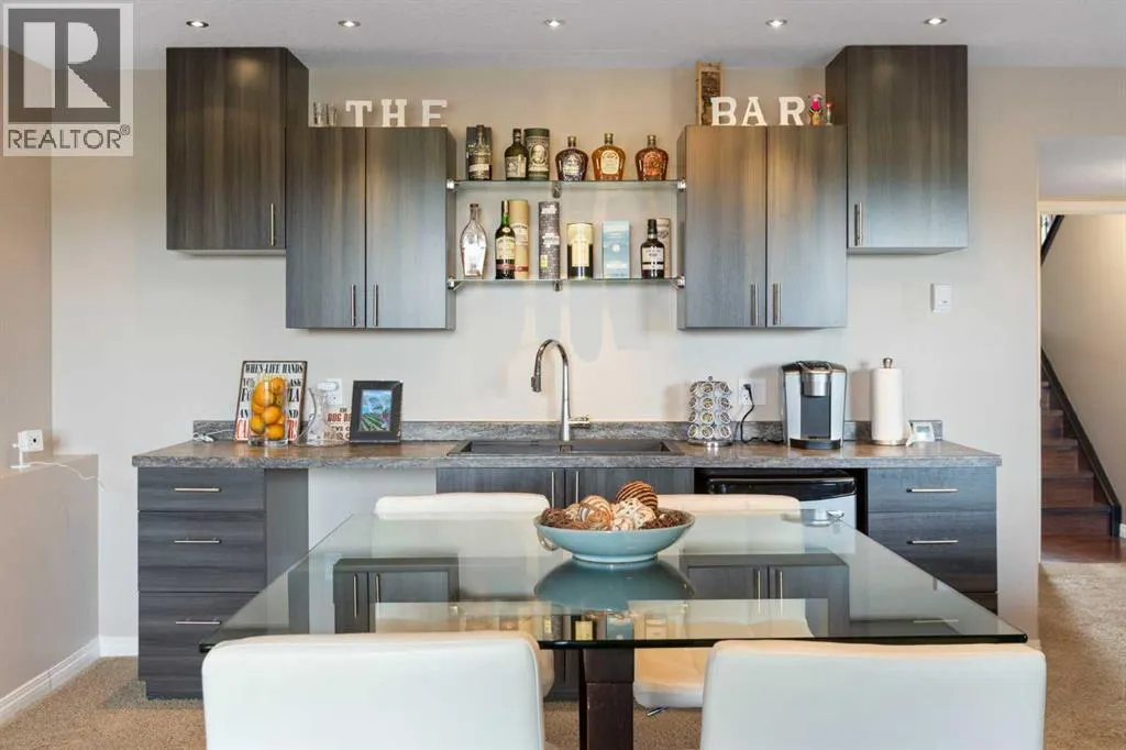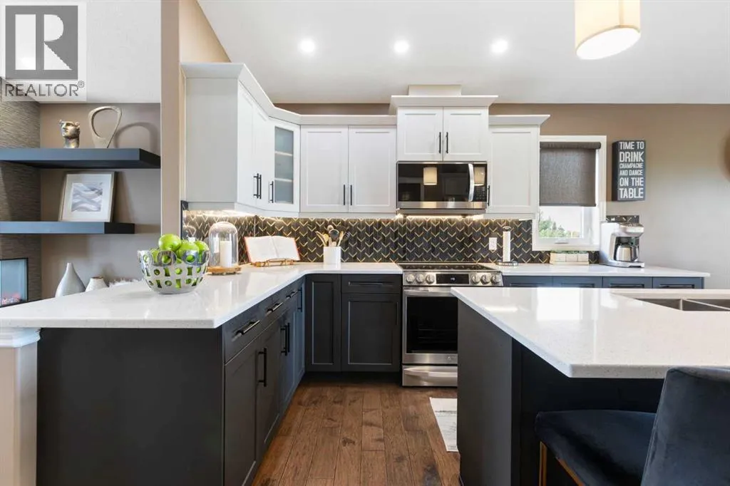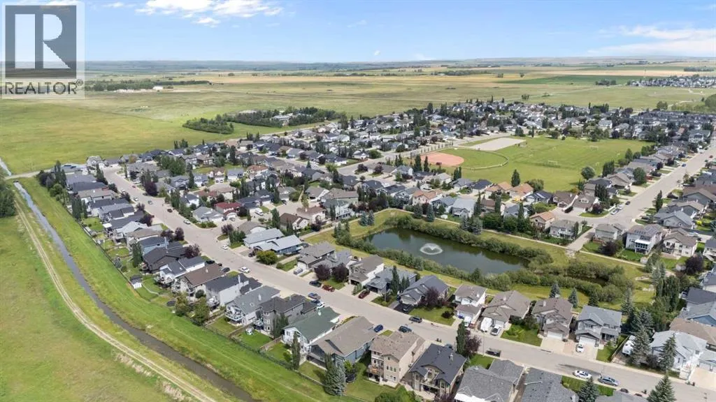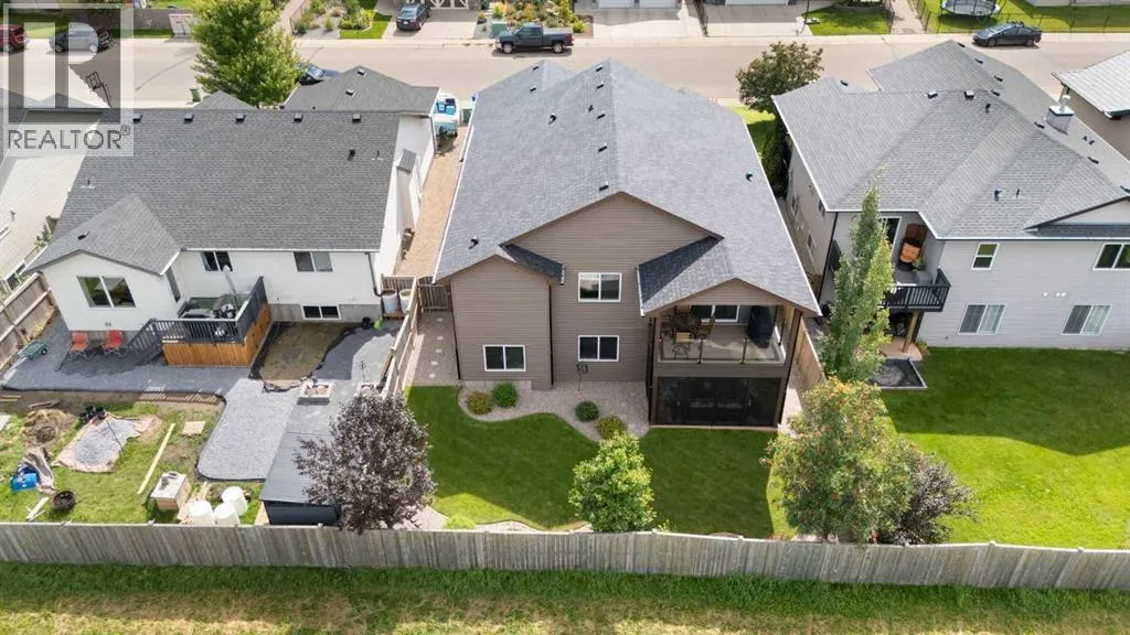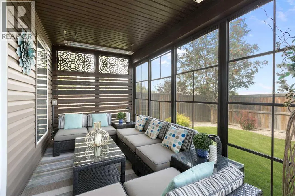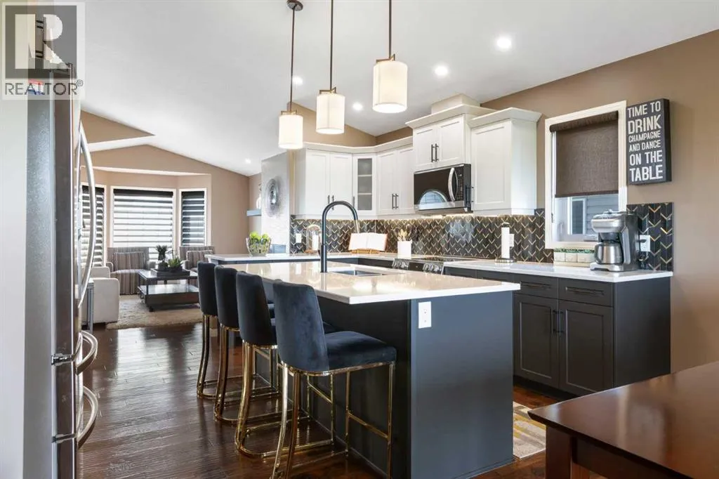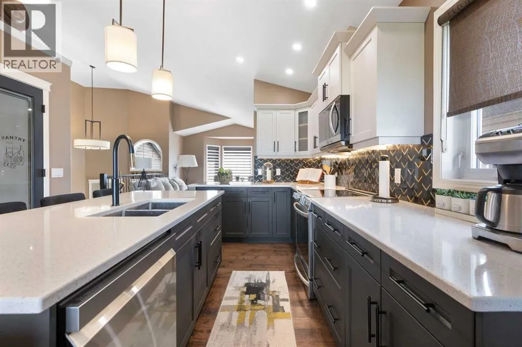 Exquisite 5-bedroom, three bathroom walkout! Welcome to a home where elegance meets comfort, and every detail has been thoughtfully curated. Perfectly positioned with no neighbors behind, this stunning bi-level offers a serene backdrop of wide open space and a long list of luxurious upgrades. From the moment you arrive, youâll be charmed by the freshly landscaped yard, the new roof and eavestroughs, the new modern garage door and the oversized garage. Inside, natural light floods the open-concept main floor, where rich quartz counters sparkle against stainless steel appliances, and soft-close cabinetry with custom pullout drawers adds both refinement and function. Gather by the sleek electric fireplace or step onto the raised composite deck, adorned with glass railings and a gas line, to savor golden summer evenings and uninterrupted views. The primary retreat feels like a sanctuary, crowned with soaring 12 ft vaulted ceilings and a spa-inspired ensuite that invites you to unwind in luxury. Two additional bedrooms and a full bath complete the main level with both warmth and style. The second bedroom has a secret storage area behind the bookcase, designed for a play area, extra bed space or storage. The fully finished walkout basement is designed for both relaxation and celebration. Heated floors, a cozy electric fireplace, and a welcoming rec room with wet bar and pool table set the stage. Step into the luminous three-season sunroom with infrared heating and enjoy the beauty of every season while overlooking your private, fully landscaped backyard. Two spacious bedrooms and full bath complete the lower level. Every comfort has been consideredâcentral A/C, central vac, and a brand-new 75-gallon hot water tank are among the many thoughtful upgrades. With its timeless finishings, gracious flow, and an idyllic setting, this Strathmore home is more than a residenceâitâs a lifestyle. (id:27476)