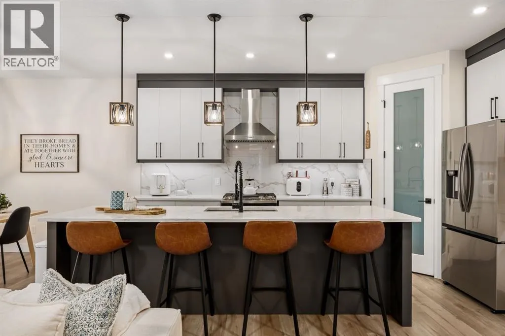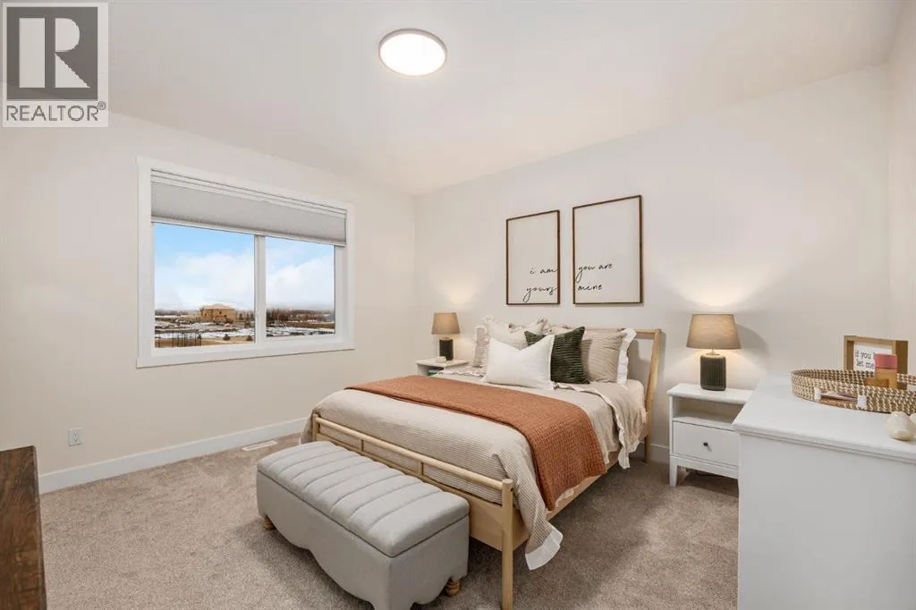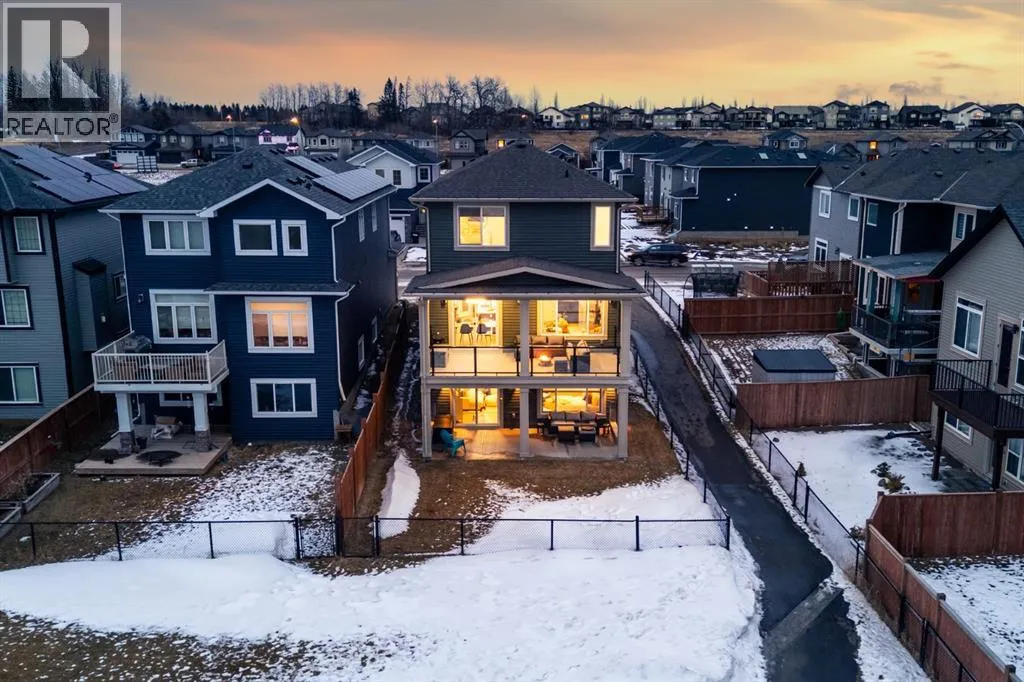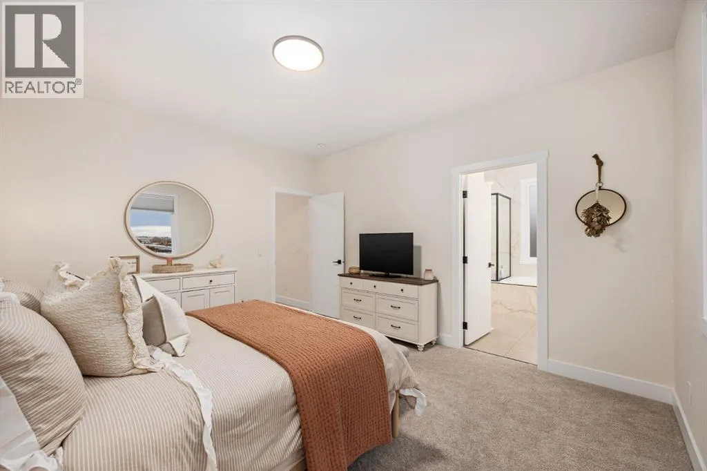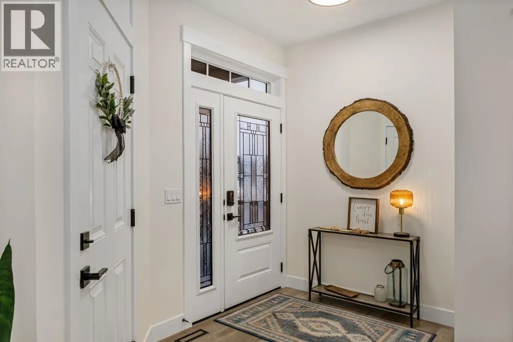 Discover refined living in this impeccably crafted 2024 custom-built two-storey walkout by Shayman Homes, located in the sought-after lake community of Lakewood in Strathmore. Backing onto a lush green space and walking path with no neighbours behind, this east-facing home offers nearly 3,000 sq.ft. of beautifully designed living space with luxury finishes throughout.The striking exterior with stone accents and extended driveway welcomes you into a bright foyer filled with natural light from oversized windows. The main floor features 9â ceilings and luxury laminate flooring, flowing through a thoughtfully designed layout. A private main-floor office with an 8â doorway provides the perfect workspace or flex room.The chefâs kitchen is the heart of the home, showcasing an expansive quartz island, soft-close white cabinetry with black hardware, undermount sink, and premium stainless steel appliance package including a gas range, chimney-style hood fan, built-in oversized microwave, dishwasher, and refrigerator with water hookup. A spacious pantry with built-in shelving and automatic lighting adds everyday convenience.The dining and living areas are flooded with natural light and anchored by a stunning floor-to-ceiling stone gas fireplace with custom mantel. Step outside to the covered upper deck spanning the width of the home, complete with recessed lighting, custom glass railings, and a gas line rough-inâideal for entertaining while overlooking the landscaped yard and park.Upstairs features a vaulted ceiling opening into a massive bonus room, upper laundry with tile flooring and quartz counters, and three generously sized bedrooms. The primary retreat offers a spa-inspired ensuite with dual quartz vanity, 5â soaker tub, floor-to-ceiling tiled shower, a private toilet room, and a walk-in closet with custom built-ins. A stylish 4-piece bathroom completes the level.The fully developed walkout basement extends the living space with 9â ceilings, luxury laminate floorin g, a spacious family room, and a custom 10â wet bar with quartz counters, tile backsplash, and built-in cabinetry. Two large bedrooms, a 4-piece bathroom, mechanical room, and under-stair storage complete the lower level.Outside, enjoy a covered concrete patio, fully landscaped yard, and unobstructed views of the greenspace and playground. Located minutes from schools, amenities, recreation, and golf, with Calgary just 30 minutes away, Lakewood offers a lifestyle unlike any other. Dont miss your opportunity to own this stunning family home. Book your private showing today. (id:27476)