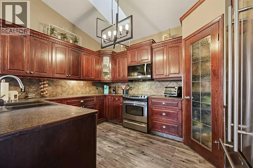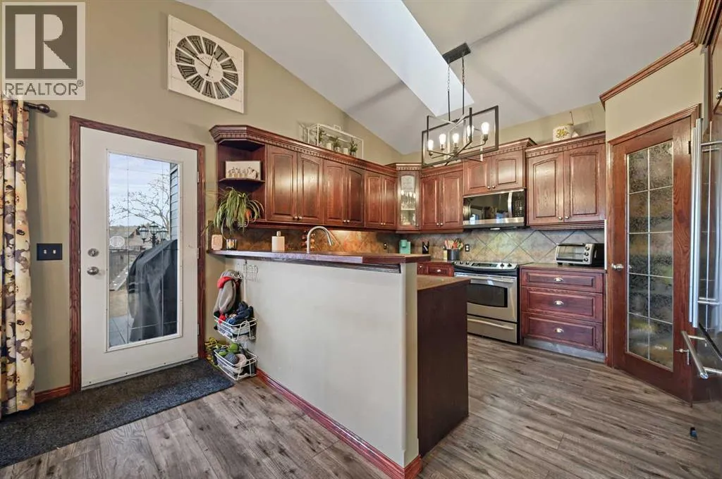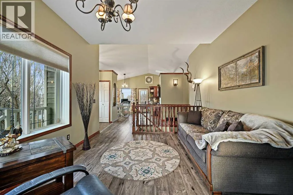 Welcome to this fully developed bungalow, perfectly situated on one of the largest private lots in a desirable, family-oriented neighbourhood. This beautifully maintained detached home offers comfort, functionality, and an exceptional outdoor retreat.The inviting layout features high vaulted ceilings, natural woodwork, abundant storage, and a fully finished basement designed for everyday living and entertaining. The kitchen offers a pantry, ample cabinetry, and seamless flow into the dining area and main living room, making it ideal for family gatherings and hosting guests. This home includes five bedrooms and three full bathrooms across two levels, along with two fireplaces. A cozy wood-burning fireplace warms the main floor, while the lower level showcases a gas fireplace with stone and wood detailing, perfect for movie nights or relaxing evenings. Designed for modern comfort, the home features central air conditioning, a jetted tub, and a forced-air natural gas furnace (2021). Recent upgrades provide peace of mind, including a new asphalt shingle roof (2025), new Hardie Board siding (2025), hot water tank (2020), and an insulated double attached garage complete with mezzanine, water, and 220-volt power. The exterior truly shines with a large private backyard and expansive deck with custom-built privacy screening. Additional outdoor features include underground sprinklers, garden space, a fire pit, dog run, and hot tub (as-is), creating the perfect setting for relaxation or entertaining. Located in a family-friendly community with nearby schools, playgrounds, sidewalks, and street lighting, this home offers both lifestyle and convenience. A rare opportunity to enjoy indoor comfort and outdoor living in one exceptional package (id:27476)