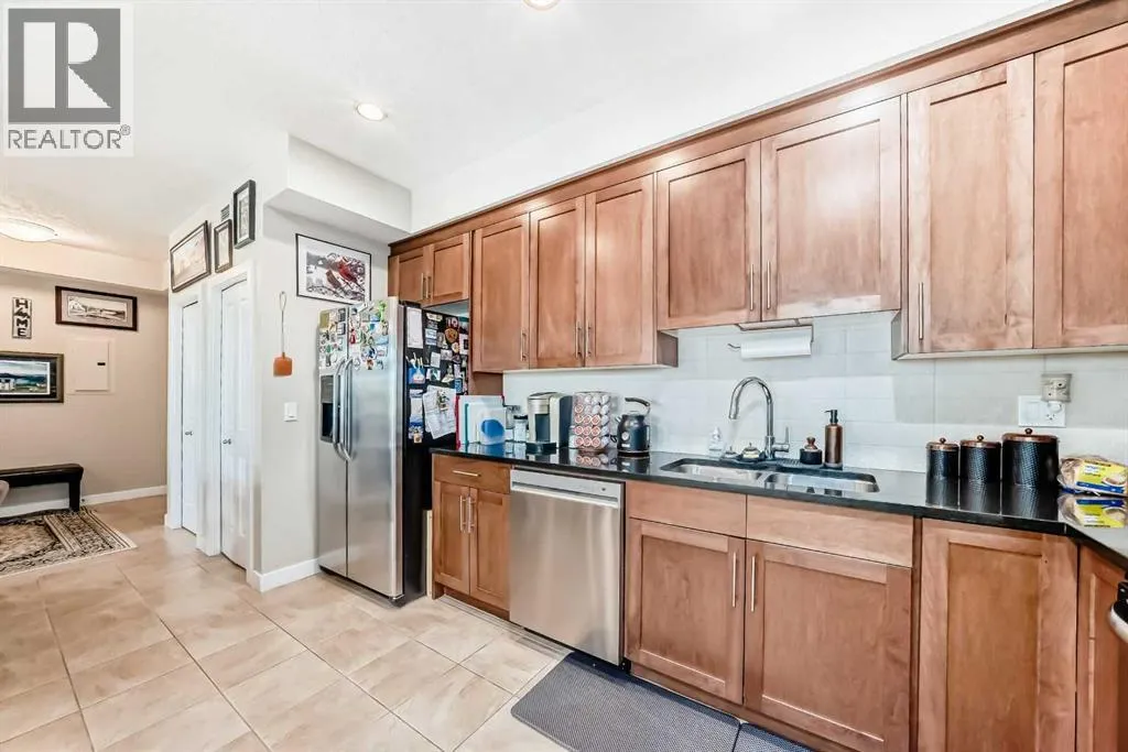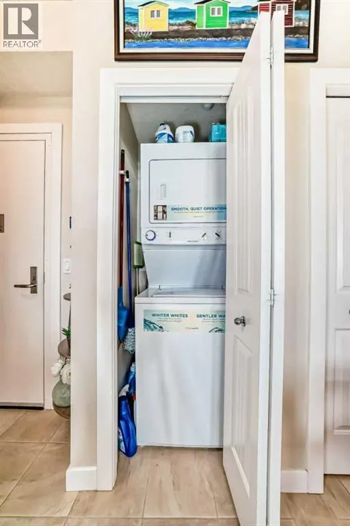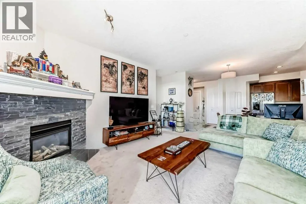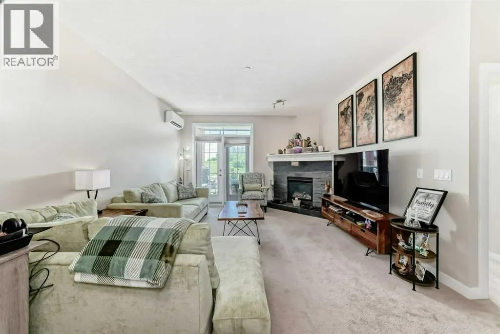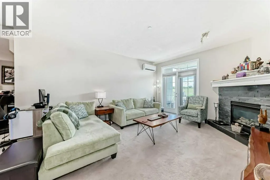 This fantastic unit in the Savana Condos of Strathmore offers a prime location within walking distance to the lake, pond, and all nearby amenities. With over 1,000 square feet of living space, this spacious two-bedroom, two-bathroom condo is an excellent opportunity for both homeowners and investors. The unit includes three titled parking stallsâone tandem heated underground stall (with extra storage in front) and one titled exterior surface stall. Underground stall is 111 and surface stall is 205 Inside, the layout is open and inviting with open concept from the living room to the dining area and kitchen. The kitchen is thoughtfully designed with abundant cabinet space, upgraded stainless steel appliances including a fridge with water and ice, a large L-shaped island with an eating bar, a pantry, and granite countertops. Ceramic tile flooring is featured in the kitchen and bathrooms, while the rest of the unit is finished in carpet. The living room offers a cozy gas corner fireplace and access to a spacious balcony with a lovely view.The master bedroom is impressively large and filled with natural light from multiple windows. It includes a walk-through closet that leads to a luxurious five-piece ensuite with double sinks, a separate shower, and a soaker tub. The second bedroom is also generous in size with plenty of closet space, and there's an additional four-piece bathroom for guests. For added comfort, the unit features in-floor heating, air-conditioning unit on the deck and wall unit in living room, and a washer and dryer are conveniently located in-suite.This well-managed complex is known for its popularity and desirability. Currently, the property is tenanted with a lease in place until June 2026 at $2,000 per month. The tenant is open to extending their stay, making this a strong investment opportunity for those looking to secure a reliable rental income. Please note that while dogs are not permitted in the complex, cats are allowed with board approval . (id:27476)