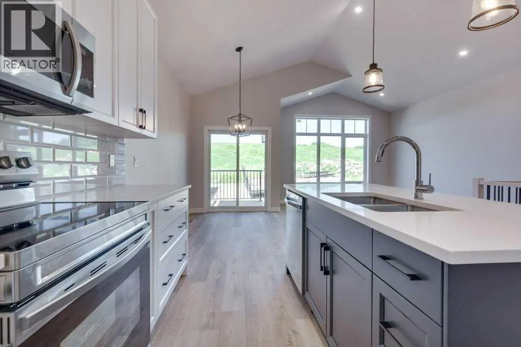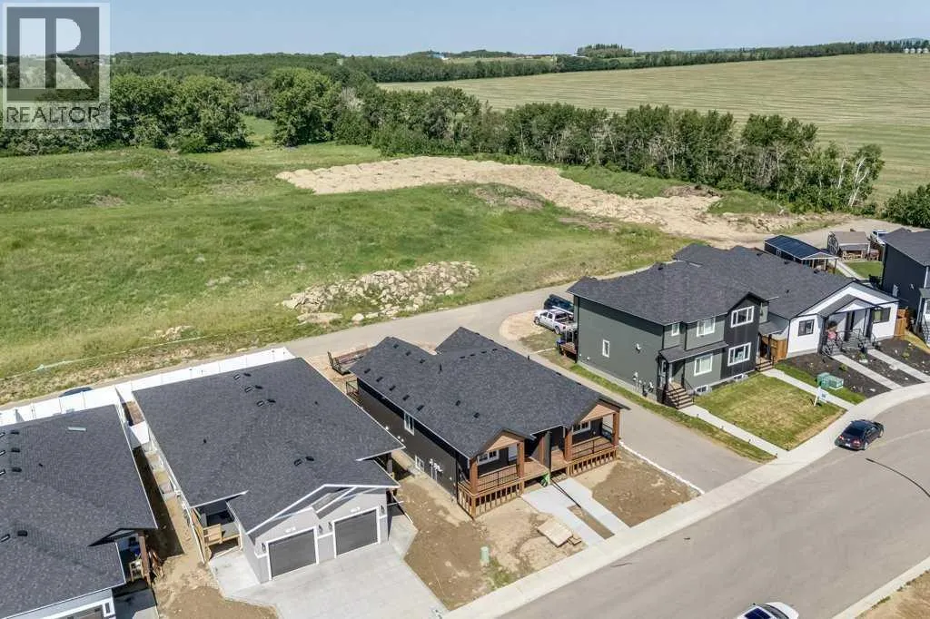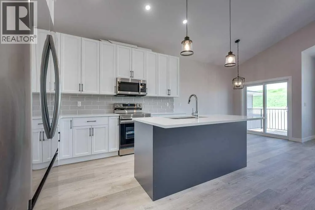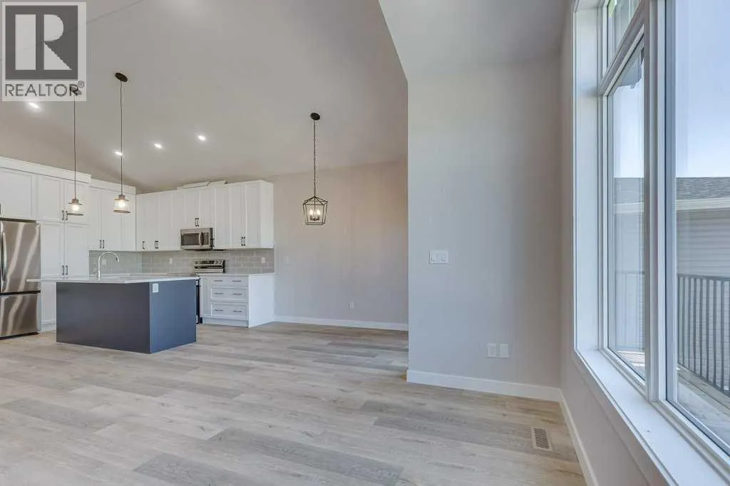 Immediate possession, this brand new bungalow floorplan by L&S Developments is perfect for a starter home or empty nester. Imagine having your morning coffee on the 20x8 covered front porch. Enter into good sized front foyer, with warm toned vinyl plank flooring leading to open floorplan. The vaulted ceilings and large windows make this home super bright and appealing. Metal spindle half wall for stairwell. Functional kitchen with white shaker cabinets, & feature navy centre island eating bar, quartz countertops, cabinet pantry, garbage/recycling pullouts, stainless steel appliances, chrome fixtures. Sliding door off of dining room to 7x8 back deck. Primary bedroom has room for king sized bed with black ceiling fan. Secondary bedroom is good sized for guests or office, carpet in both bedrooms. 4pce bathroom & handy main floor laundry. Basement is undeveloped but potential for family room, exercise area, bedroom and roughed in for another bathroom. Front sod and concrete sidewalk, backyard is black dirt leveled to grade. This home is located in Grayhawk on the north west side of Sylvan Lake. With easy access to highway and close proximity to the lake, golf course and all town amenities this up and coming subdivision is sure to meet all your needs. Future commercial and school sites as well as walking paths, parks playgrounds and pond. An abundance of wildlife to watch and a progressive new neighborhood to enjoy. GST included with rebate to builder. Taxes to be assessed. (id:27476)