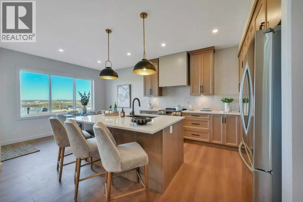 Experience luxury lakeside living in this exquisite new construction home in The Vista at Sylvan Lake. Thoughtfully designed with elegance and functionality in mind, this two-storey gem boasts sweeping lake and city views. Step into a spacious open-concept layout adorned with premium finishes and natural light pouring in through expansive triple-pane windows. Featuring 3 generously sized bedrooms, including a serene primary suite with a walk-in closet and spa-inspired ensuite with custom tiled shower, this home is the perfect blend of comfort and sophistication.The gourmet kitchen is a chefâs dream, complete with quartz countertops, a large island, stainless steel appliances, and ample cabinetry. Enjoy cozy evenings by the modern tiled gas fireplace or host summer gatherings on the private covered deck overlooking your fully landscaped yard, complete with new sod. The walkout basement features insulated exterior walls and room for a future 4th bedroom and full bathâready to grow with your needs.Additional highlights include a heated oversized double garage with 220V outlet, paved back lane access and Energy Star certification with upgraded insulation for year-round efficiency. Located minutes from Sylvan Lakeâs vibrant waterfront, schools, shops, trails, and recreation, this is more than a homeâitâs a lifestyle. Don't miss your chance to own in one of Sylvan Lakeâs most sought-after communities. (id:27476)