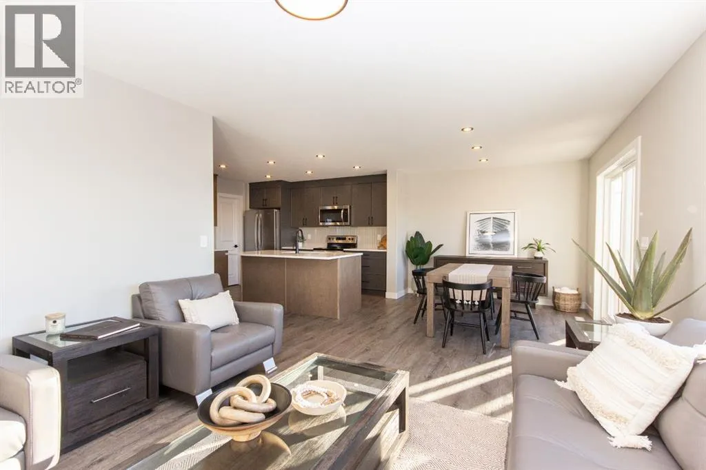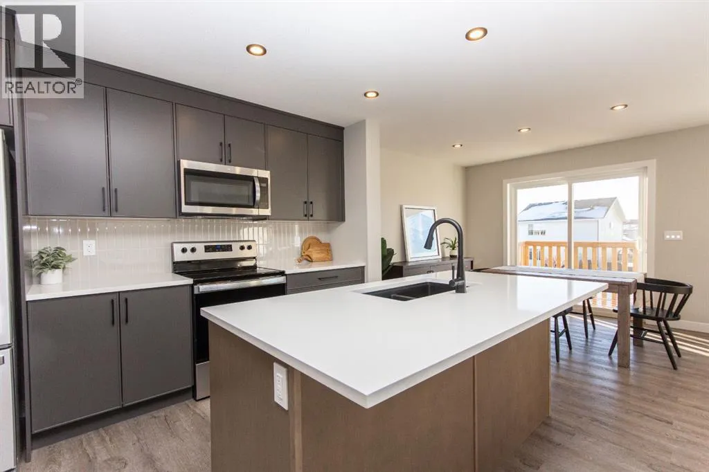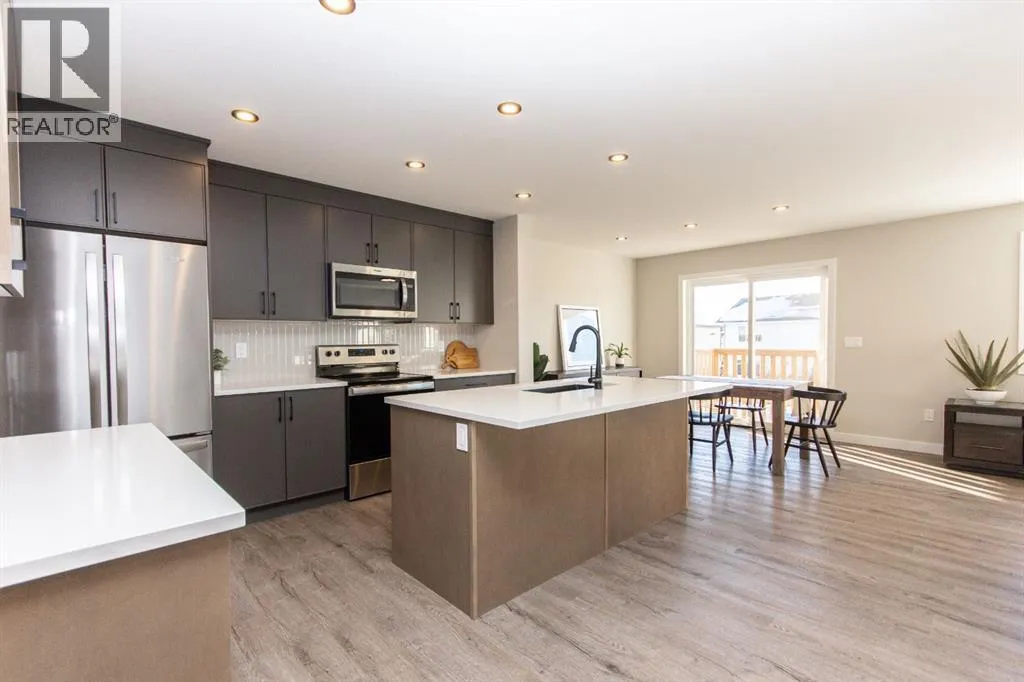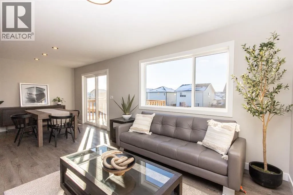 Be the first owner of this brand new Laebon Home situated in the sought after neighbourhood of Beacon Hill, just steps from multiple parks, green spaces, and Beacon Hill Elementary! This stylish Paxton two storey floor plan offers 1707 square feet above grade, a wide open living space, large windows, 2nd floor laundry, and a large bonus room! The main floor features vinyl plank flooring throughout, and a beautiful kitchen offering two toned raised cabinetry, stainless steel appliances, quartz countertops, a large island with eating bar, and a large walk in pantry. The adjacent eating area has sliding patio doors that lead out to the deck. Head upstairs to find two nicely sized kids/spare rooms that share a large 4 pce bath, and a large master bedroom with its own private 4 pce ensuite and huge walk in closet. Laundry is conveniently located near the bedrooms, and the large and bright bonus room gives you additional living space to enjoy. The attached garage is insulated, drywalled, and taped. If you need more space, the builder can complete the walkout basement development for you, and allowances for blinds and a washer & dryer can also be included to make this a fully move in ready home. Poured concrete front driveway, front sod, and rear topsoil are included in the price and will be completed as weather permits. GST is already included in the purchase price. Live worry free thanks to a full 1 year builder warranty and 10 year Alberta New Home Warranty. Taxes have yet to be assessed. This home is currently under construction and has an estimated completion date of mid February 2026. Photos and renderings are examples of a previous home built with the same floor plan, finishes and colours will not be identical to photos. (id:27476)