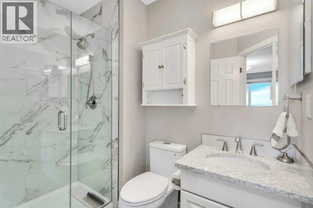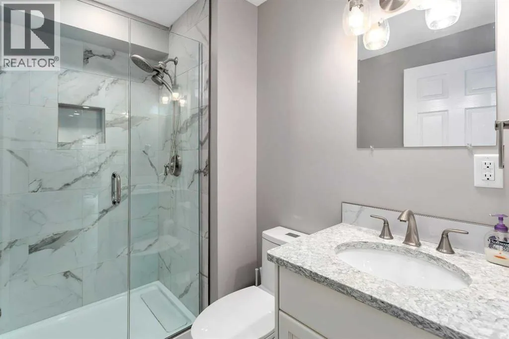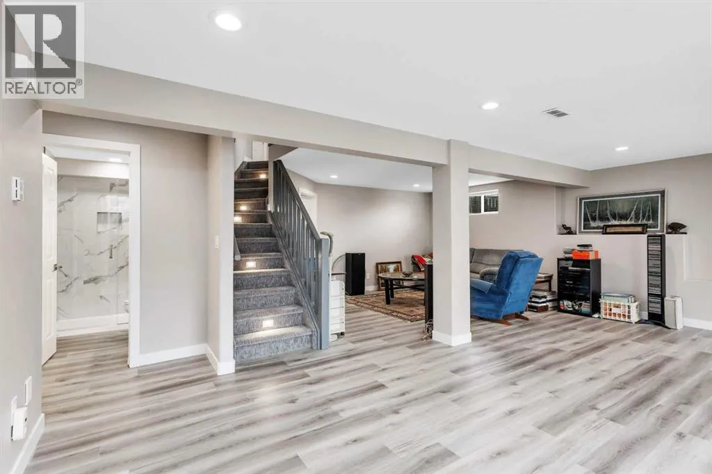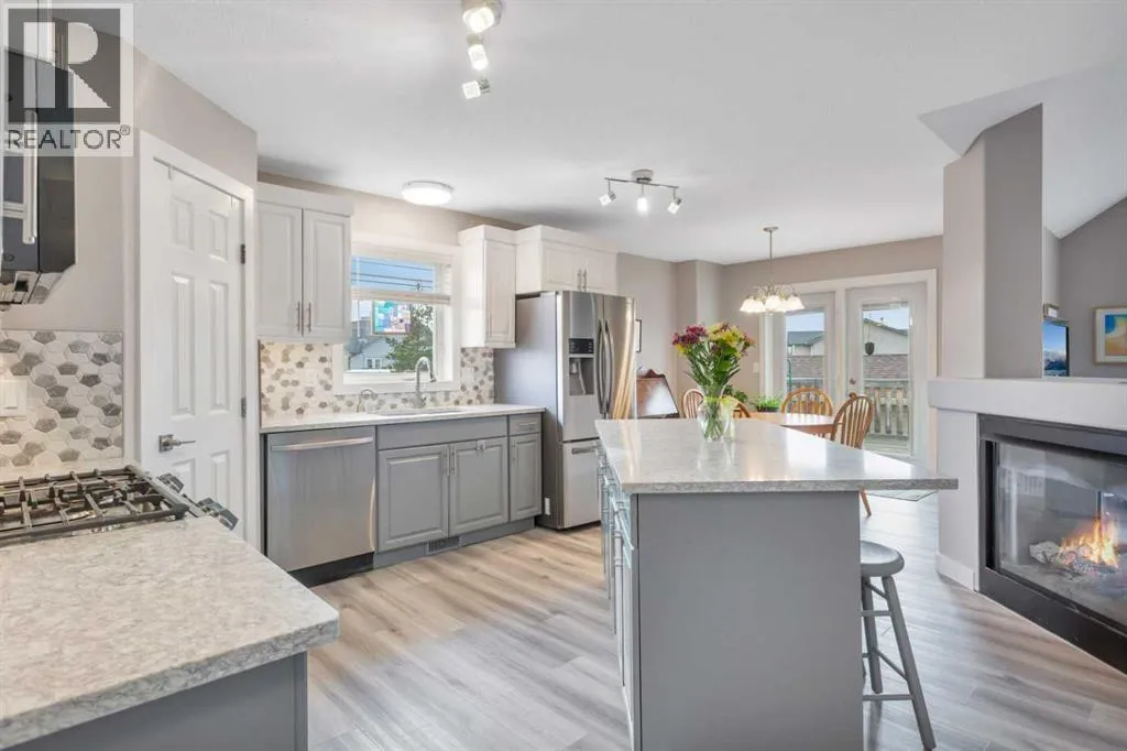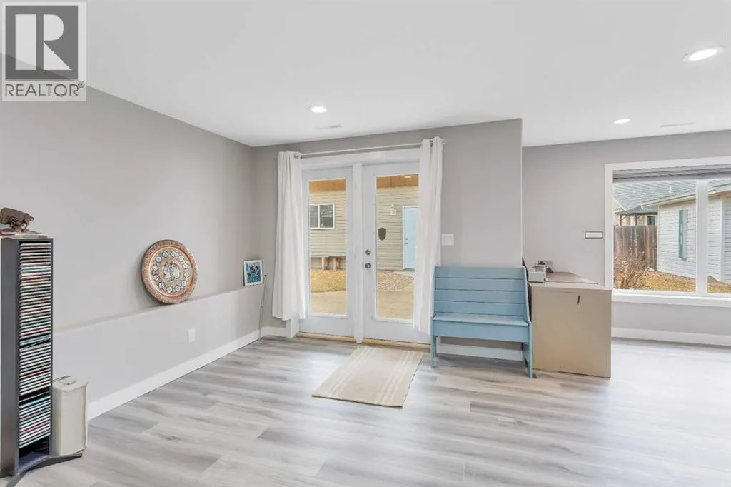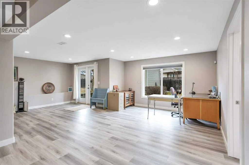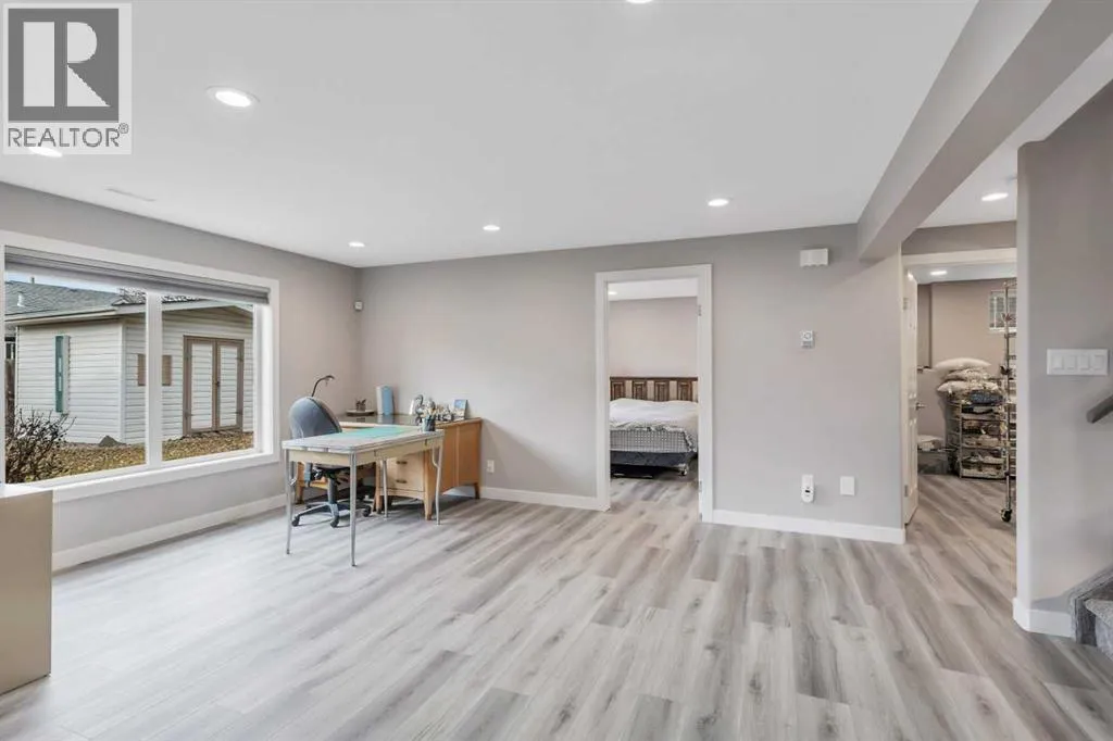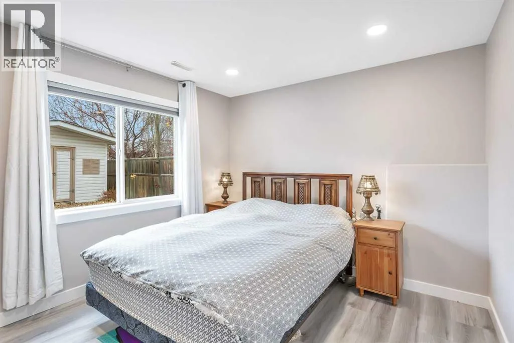 This beautifully renovated walkout bungalow blends open concept living with the warmth of natural light and west-facing views. Designed for connection and ease, the kitchen anchors the main floor with quartz countertops, statement backsplash, and updated appliancesâall completed in a 2021 full-home remodel. The kitchen transitions into the dining area and living room, featuring vaulted ceilings and large windows. The cozy 3-way fireplace adds heart to the home.Main floor laundry, new vinyl plank flooring, pot lights, and fresh paint throughout make daily living streamlined and stylish. The primary suite offers smart functionality with a renovated 3-piece bath. A second bedroom that was converted to the upper laundry area and vaulted den (perfect as an office or flex room) complete the main level.Downstairs, the fully finished walkout basement opens wide with natural light pouring in from rear windows and walkout patio doors. In floor heat, two more bedrooms, a third renovated bath, and a generous rec room make this level ideal for teens, guests, or use as the entertainment zone. The backyard is all you need and more with mature trees, planter boxes, a large shed, and direct yard access through the walkout.Rarely found, this home also features both a heated attached garage and a new heated single detached garage, perfect for a workshop or storing your prized toys. Thereâs also a dedicated RV pad for expanded parking options and easy back-alley access.Behind the beauty: all major systems have been updated in the last four years, including furnace, water tank, water softener, eavestroughs and more. Truly move-in ready, this home is more than renovated, it is thoughtfully upgraded for everyday comfort, lasting style, and modern living. (id:27476)