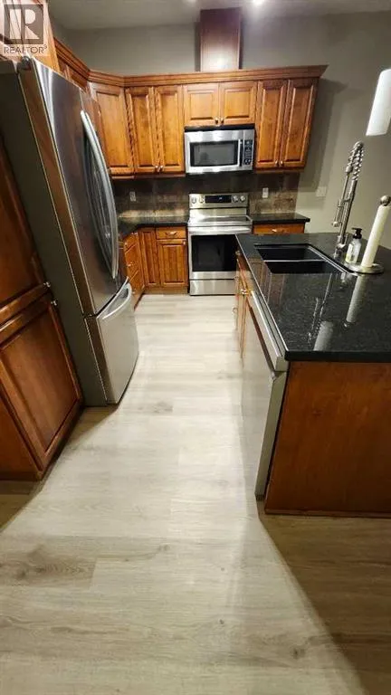 Welcome to this bright and stylish 2-bedroom, 2-bath condo ideally located just steps from downtown beautiful Sylvan Lake. This open-concept apartment offers the perfect blend of comfort and convenience with a spacious layout designed for modern living. Recent upgrades include vinyl plank flooring, kitchen appliances, fireplace finishing and bathroom countertops/sinks! The kitchen is a true highlight, featuring a large island with granite countertops, newer stainless steel appliances, built-in wine cooler, and plenty of space for cooking or entertaining. The open living and dining area is filled with natural light, creating a warm and inviting atmosphere complete with newer flooring and cozy gas fireplace. The primary suite offers a relaxing retreat with a walk-in closet and a large corner soaker tub in the large ensuite bathroom. A second bedroom and full bathroom make it perfect for guests or a home office. In-suite laundry adds everyday convenience. Enjoy the best of both worldsâeasy access to shopping, restaurants, and the lake, all from the comfort of your bright and beautiful condo. Heated underground parking and storage unit. No pets and no short term rentals in this building. (id:27476)