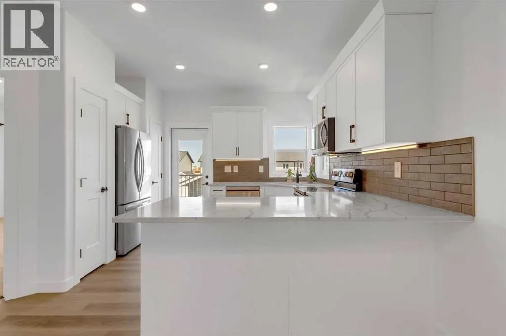 Thoughtfully built by Asset Builders Corp., named 2024 Builder of the Year, this modern family home is located on a quiet street in the established community of Iron Gate. Designed for everyday functionality, the open-concept main floor offers bright living and dining spaces flowing into a well-appointed kitchen with maple cabinetry, quartz countertops, stainless steel appliances, exterior-vented hood fan, and direct access to the backyard deck.The main level features a private primary bedroom with walk-in closet and ensuite, plus two additional bedrooms and a full bath. The bright lower level is undeveloped and ready for customization, with oversized windows and a layout planned for two more bedrooms, a bathroom, laundry/mechanical room, and a large family area.Highlights include vinyl plank flooring, cozy bedroom carpet, triple-pane windows, a brand-new double detached garage (Nov 2024) with paved alley access, large backyard, and remaining New Home Warranty. Bonus: seller includes a two-week stay at Prairie Moon Inn to assist with relocation.Minutes to all amenities and Sylvan Lake (id:27476)