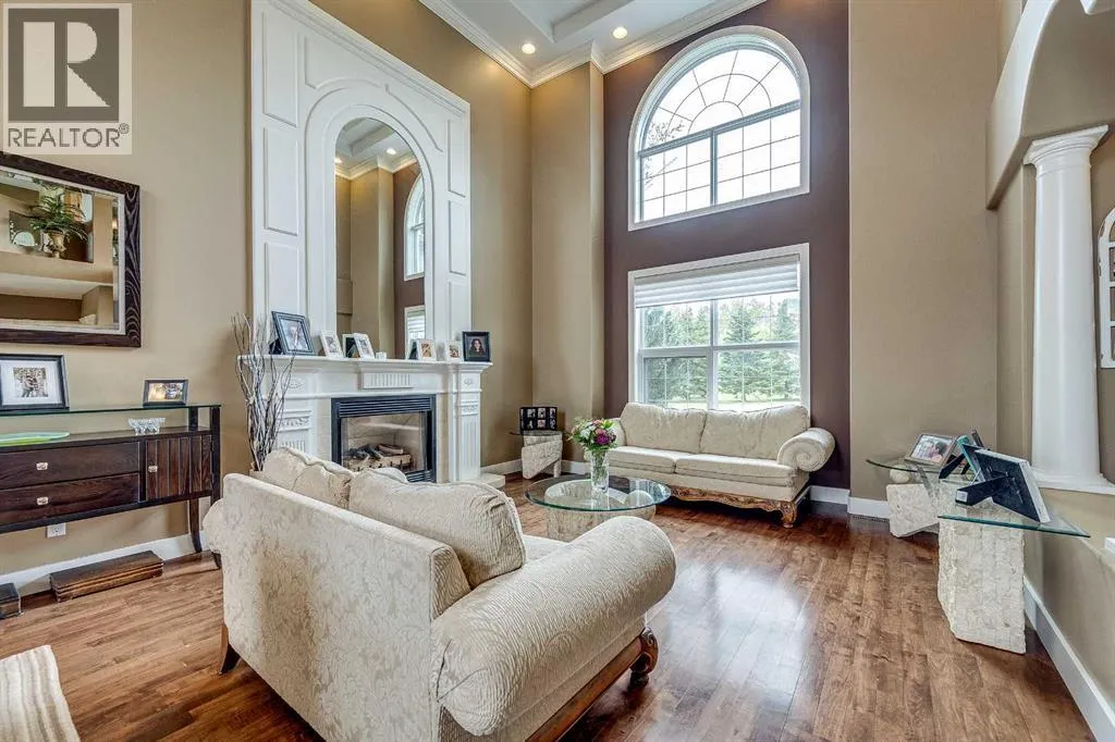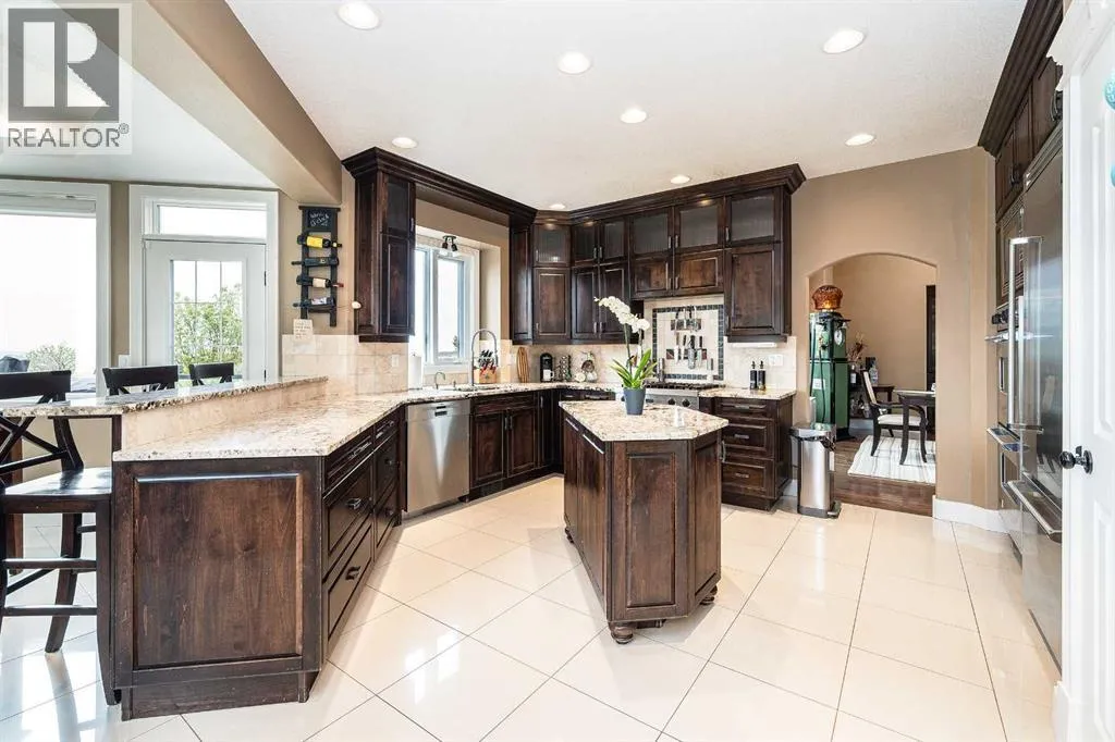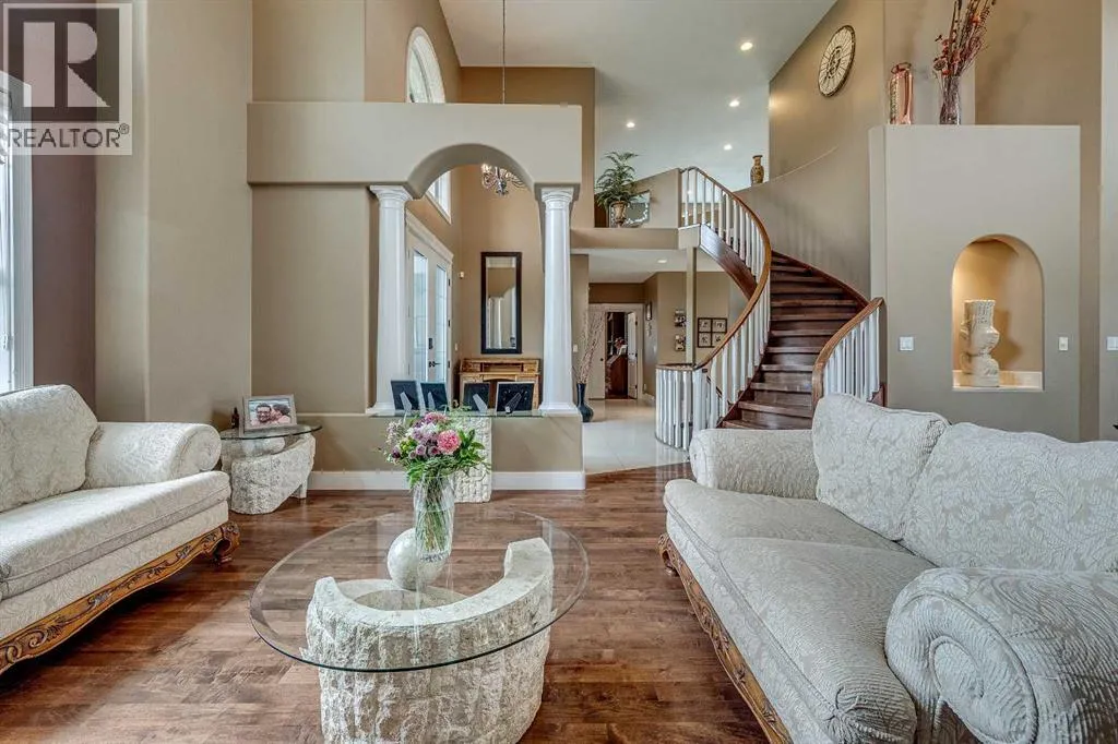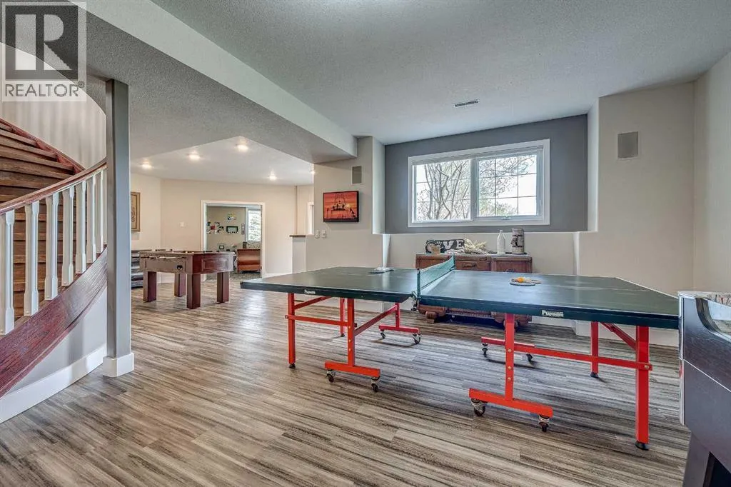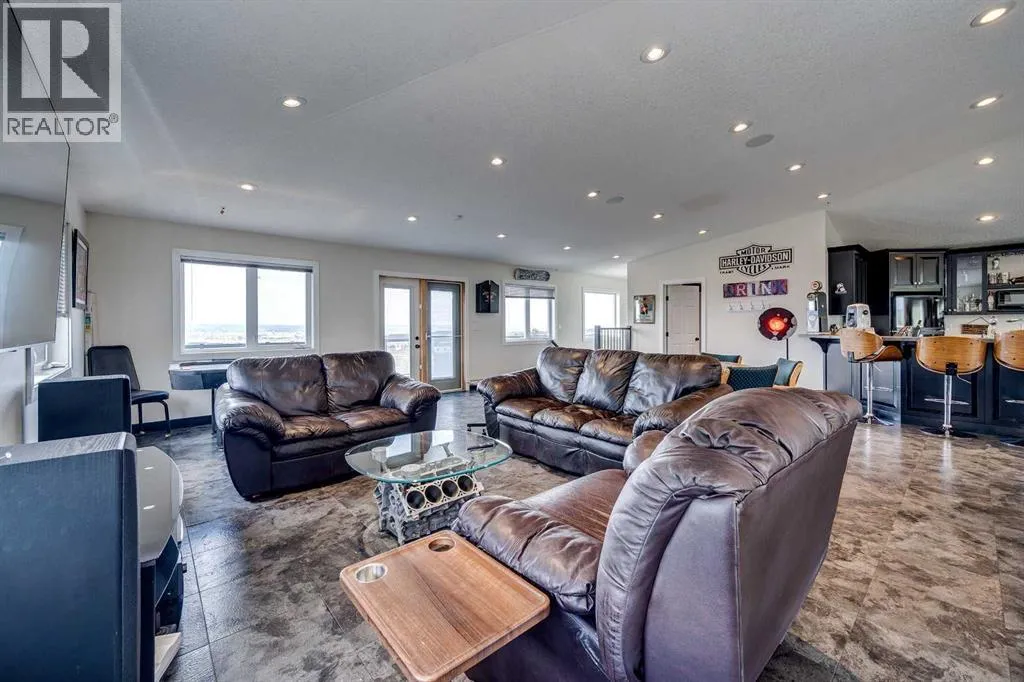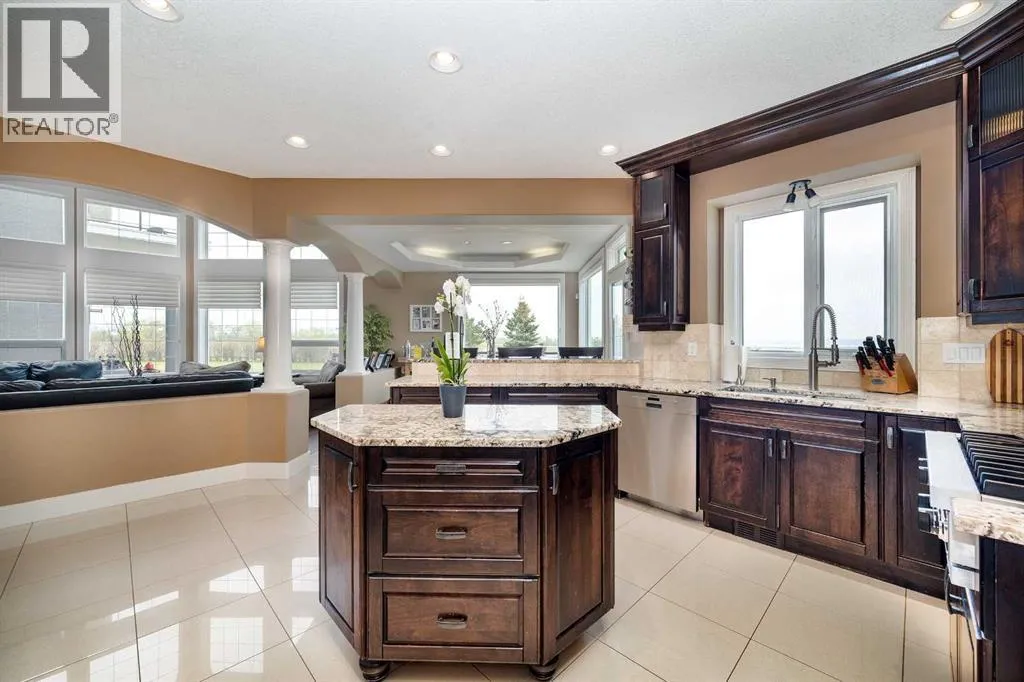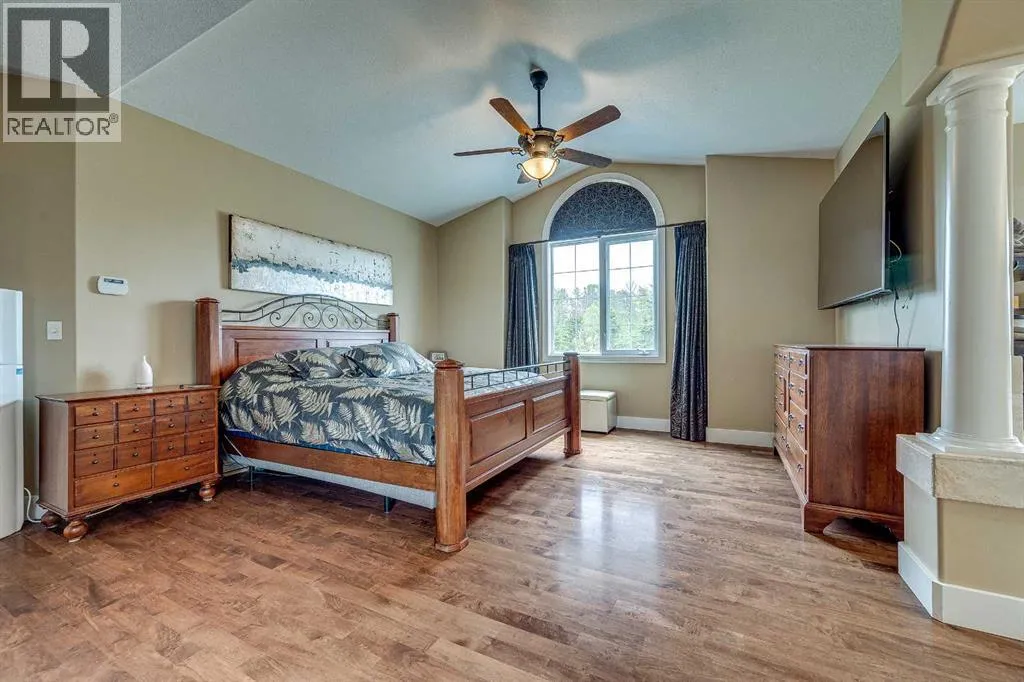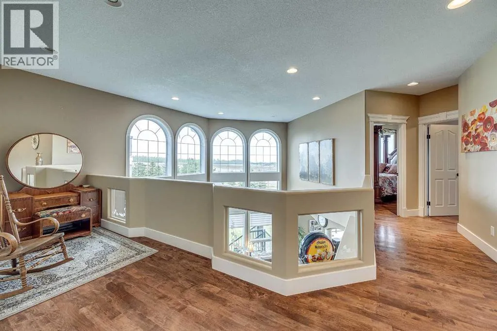Perched high on the south hill overlooking the charming town of Sylvan Lake, this magnificent property offers unparalleled luxury, breathtaking views and development opportunities. With over 5,000 square feet of living space, this grand estate features dramatic 22-foot cathedral ceilings and a stunning spiral staircase that sets the tone for the opulence within.The main level is a haven for culinary enthusiasts, boasting a chef's kitchen equipped with top-of-the-line appliances. The formal dining and living rooms are ideal for entertaining guests in style, while the cozy family room offers a great space for everyday living. Additionally, there is a main floor office for work or managing the home. Practical amenities abound, with a large back entryway featuring a locker room, laundry room, and a convenient 2-piece bathroom.Upstairs, you'll find four spacious bedrooms, two of which have ensuite bathrooms for added privacy and comfort. The primary suite is your personal sanctuary, featuring a dream ensuite with a soaker tub, steam shower, and walk-in closet. A loft area provides a serene space to relax and enjoy the panoramic views, and a stylish 5-piece bathroom serves the other bedrooms.The walkout basement offers two large bedrooms, one with a walk-in closet, and a full 4-piece bathroom. A kitchenette makes this space perfect for empty-nester parents. The entertainment hub includes a games area and a theatre setting perfect for movie nights.Garages and additional spaces are plentiful. The triple attached garage offers ample space for everyday parking. The detached shop is a massive 46 x 36 structure accommodating vehicles, boats or all your toys, and includes a recently added shop hoist. The shop also features a bonus mezzanine with a full kitchen, 4-piece bath, and a balcony overlooking the lake. There are options to convert the upper part of the detached shop into additional living space with board-in bedrooms, providing even more versatility. An additional 2 -piece bathroom and a stackable laundry unit in the main garage area adds even more convenience.The property has had numerous upgrades, ensuring modern comfort and efficiency. The garage floor was upgraded with an epoxy finish. Both the house and shop exteriors were painted and weather-sealed. All interior tiles were sealed and 2.5 bathrooms were recently renovated. Updated custom cabinetry and crown moldings are just a few of the upgrades that have been done. 70 Foot RV parking on west side of the shop with 30 amp plug Beyond the main house, this property offers potential for development with 10 lots or 6 executive lots that can be subdivided, totaling 2.99 acres in lot size on the perimeter of the Vistas.. SUBDIVISION is an option if INVESTMENT is what you seek. This estate offers a perfect blend of luxury, comfort, and functionality, making it a dream home for discerning buyers. Donât miss the opportunity to own this extraordinary property with its unmatched views and top-of-the-line amenities. (id:27476)