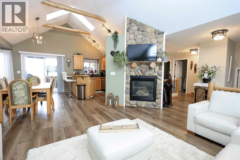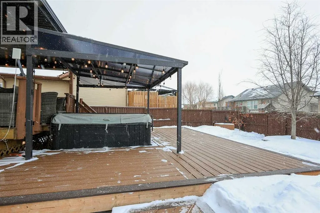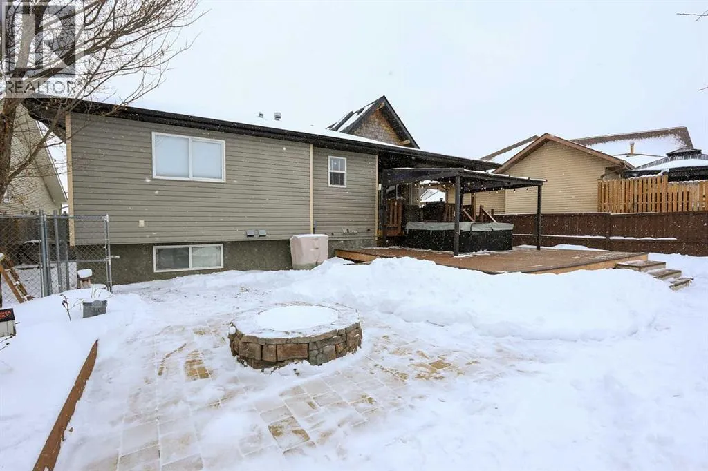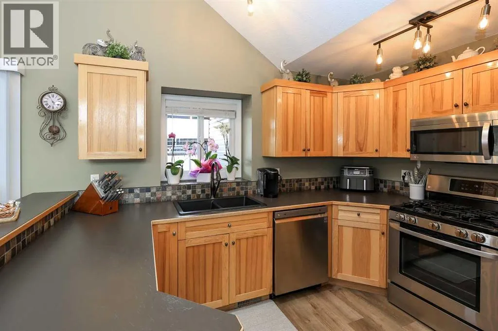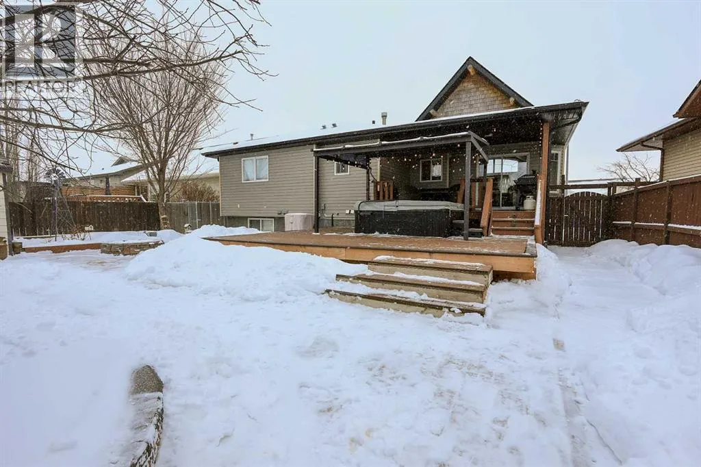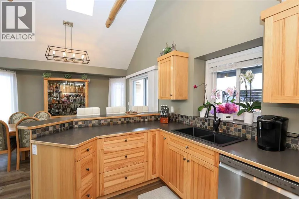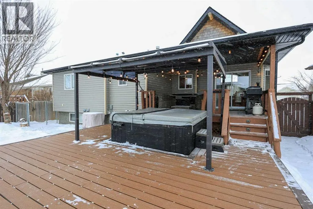 FULLY DEVELOPED BUNGALOW 5 BED, 3 BATH ~ 24' L X 22' W HEATED ATTACHED GARAGE ~ LANDSCAPED BACKYARD W/A COVERED DECK, GAZEBO & HOT TUB ~ Bright and welcoming foyer leads to the open concept main floor with soaring vaulted ceilings and vinyl plank flooring ~ The living room features large south facing windows that fill the space with natural light and is centred by a cozy gas fireplace with floor to ceiling stone ~ Easily host large gatherings in the dining room with garden door access to a covered 16' x 11' deck with a BBQ gas line, and a 20' x 17' lower deck with a gazebo and hot tub ~ The kitchen features a sky light and offers an abundance of light stained hickory cabinets, ample counter space including a raised eating bar, full tile backsplash, and stainless steel appliances ~ The primary bedroom can easily accommodate a king size bed, has dual closets and a 3 piece ensuite with a 5' walk-in shower ~ 2 additional main floor bedrooms are both a generous size with ample closet space ~ Conveniently located main floor laundry just off the bedrooms ~ 4 piece main bathroom has an oversized vanity and linen closet ~ The fully finished basement with operational in floor heat offers a large family room with a media space and bar area with cedar panelling, plus two large bedrooms (one with a walk-in closet/dressing room), 4 piece bathroom with a 6' jetted tub, and ample space for storage ~ Other great features include; central air conditioning, central vacuum, water softener (2024), sky light and sun tube, permanent exterior LED lighting ~ The 24' L x 22' W attached garage is heated, insulated, finished with painted drywall and cedar, has high ceilings and tons of built in cabinets ~ The backyard is landscaped, has a garden shed, fire pit, and is fully fenced with a fenced in dog run and back alley access ~ Located close to schools, parks and walking trail, steps to multiple shopping plazas with all amenities, easy access to the beach/Lakeshore and highways ~ Pride of own ership and move in ready! (id:27476)