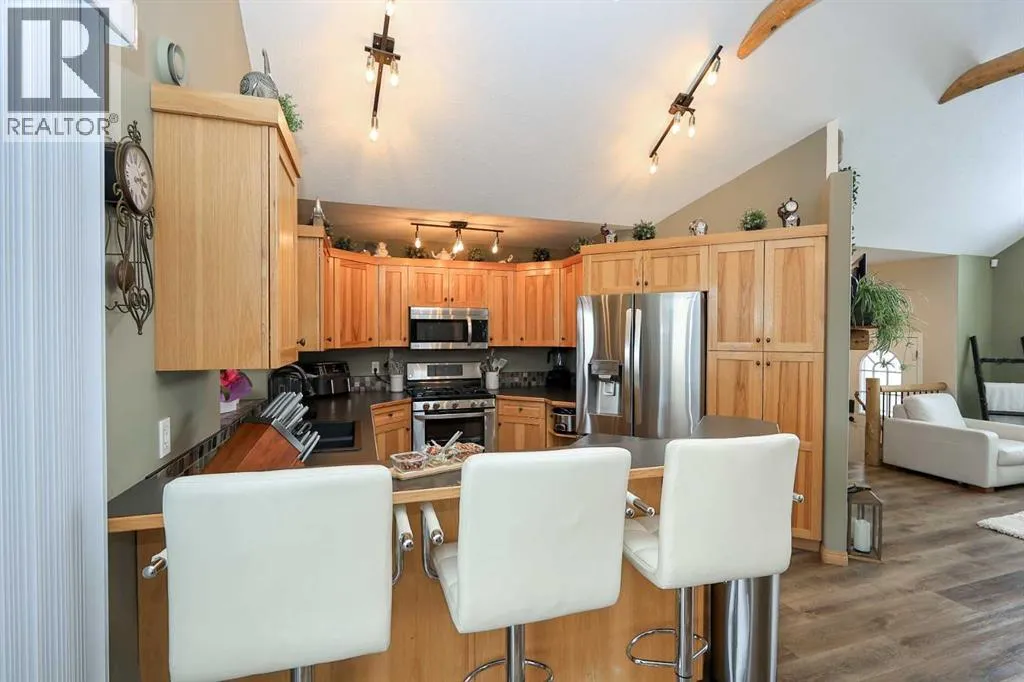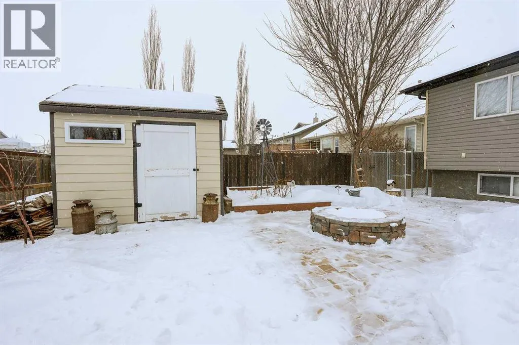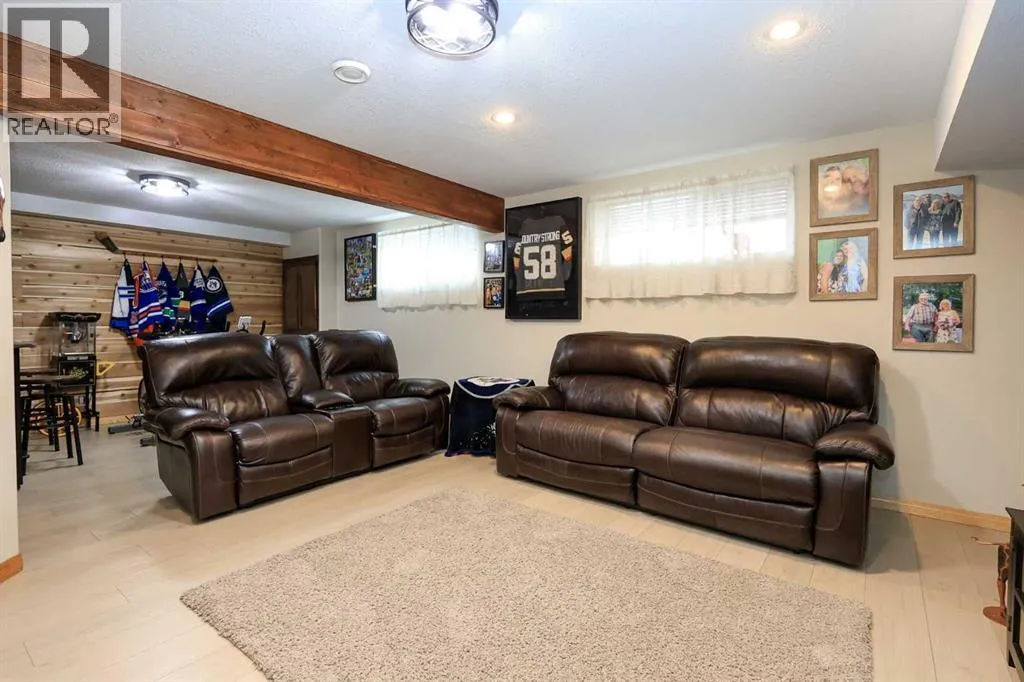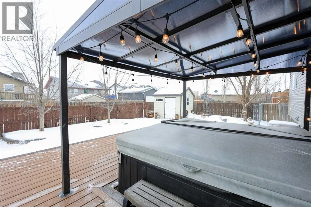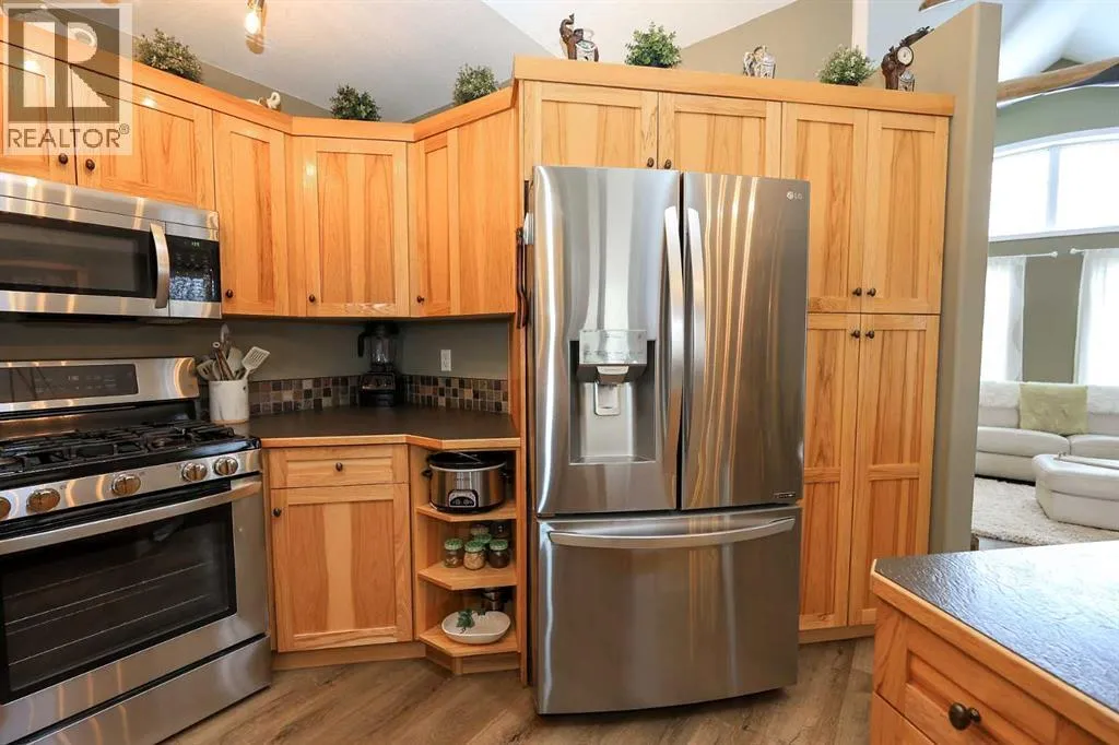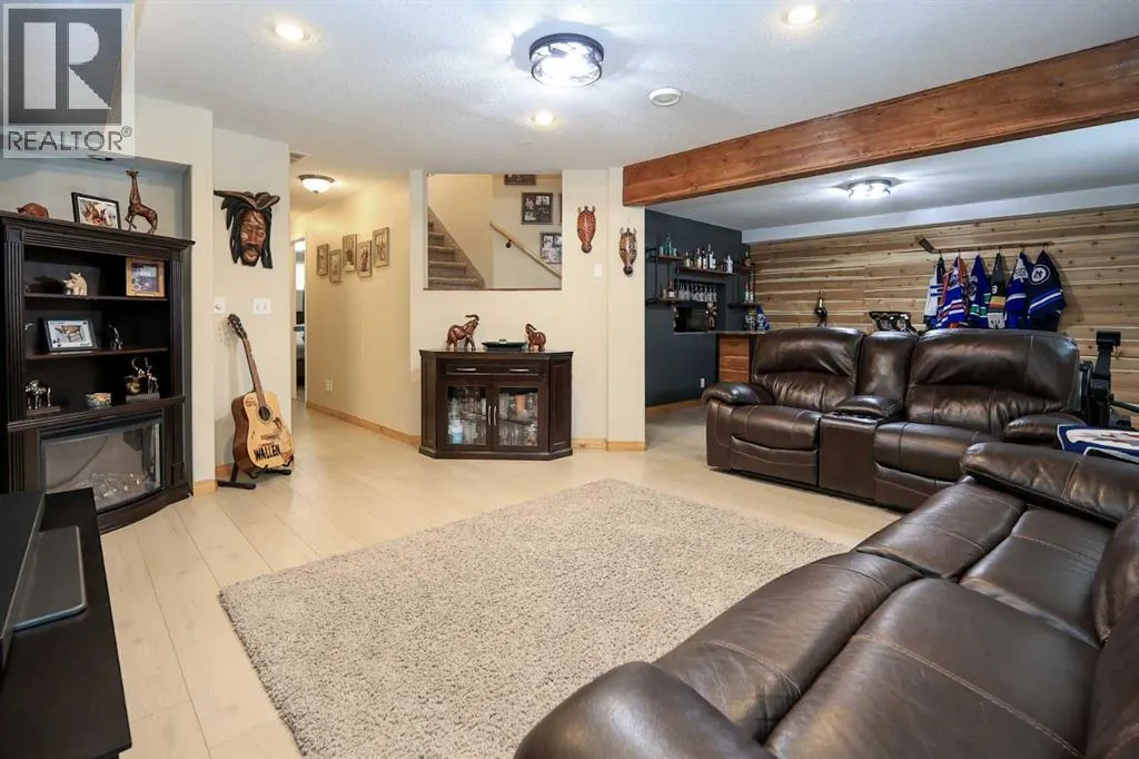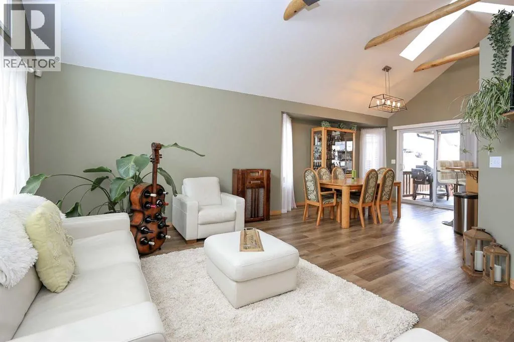 FULLY DEVELOPED BUNGALOW 5 BED, 3 BATH ~ 24' L X 22' W HEATED ATTACHED GARAGE ~ LANDSCAPED BACKYARD W/A COVERED DECK, GAZEBO & HOT TUB ~ Bright and welcoming foyer leads to the open concept main floor with soaring vaulted ceilings and vinyl plank flooring ~ The living room features large south facing windows that fill the space with natural light and is centred by a cozy gas fireplace with floor to ceiling stone ~ Easily host large gatherings in the dining room with garden door access to a covered 16' x 11' deck with a BBQ gas line, and a 20' x 17' lower deck with a gazebo and hot tub ~ The kitchen features a sky light and offers an abundance of light stained hickory cabinets, ample counter space including a raised eating bar, full tile backsplash, and stainless steel appliances ~ The primary bedroom can easily accommodate a king size bed, has dual closets and a 3 piece ensuite with a 5' walk-in shower ~ 2 additional main floor bedrooms are both a generous size with ample closet space ~ Conveniently located main floor laundry just off the bedrooms ~ 4 piece main bathroom has an oversized vanity and linen closet ~ The fully finished basement with operational in floor heat offers a large family room with a media space and bar area with cedar panelling, plus two large bedrooms (one with a walk-in closet/dressing room), 4 piece bathroom with a 6' jetted tub, and ample space for storage ~ Other great features include; central air conditioning, central vacuum, water softener (2024), sky light and sun tube, permanent exterior LED lighting ~ The 24' L x 22' W attached garage is heated, insulated, finished with painted drywall and cedar, has high ceilings and tons of built in cabinets ~ The backyard is landscaped, has a garden shed, fire pit, and is fully fenced with a fenced in dog run and back alley access ~ Located close to schools, parks and walking trail, steps to multiple shopping plazas with all amenities, easy access to the beach/Lakeshore and highways ~ Pride of own ership and move in ready! (id:27476)