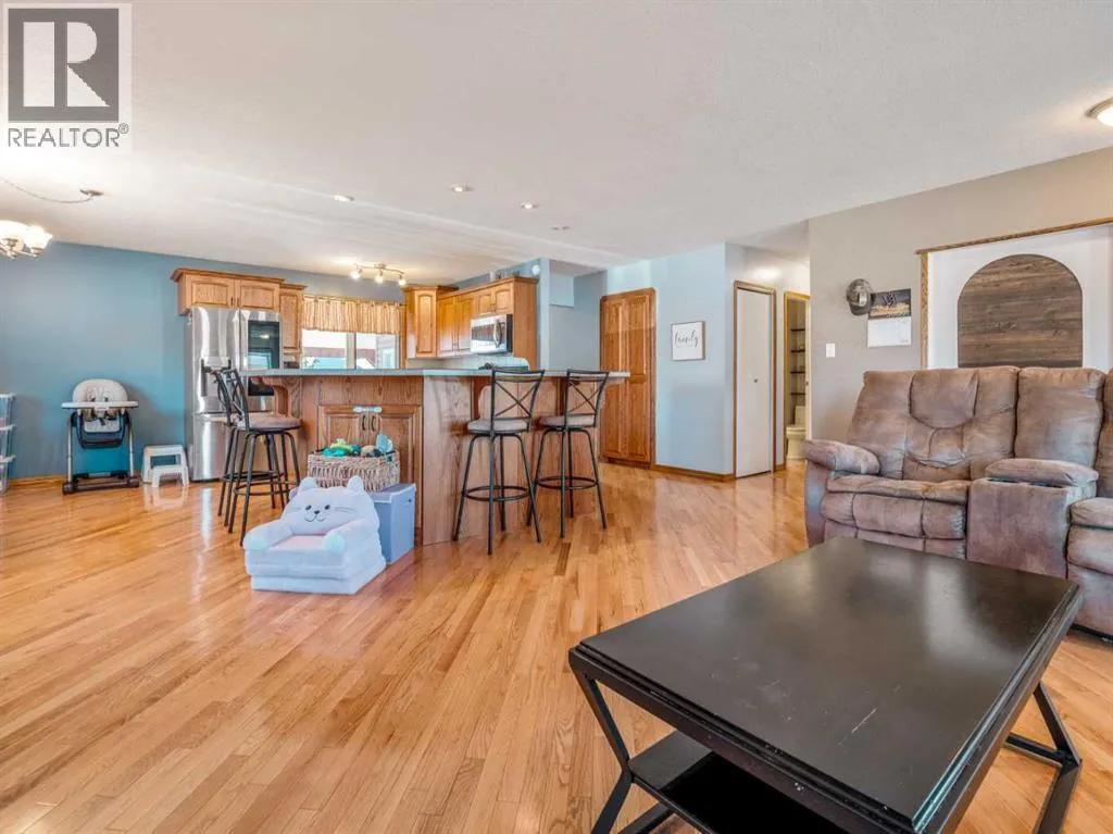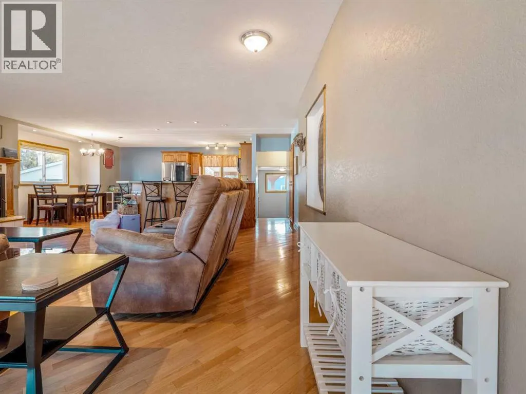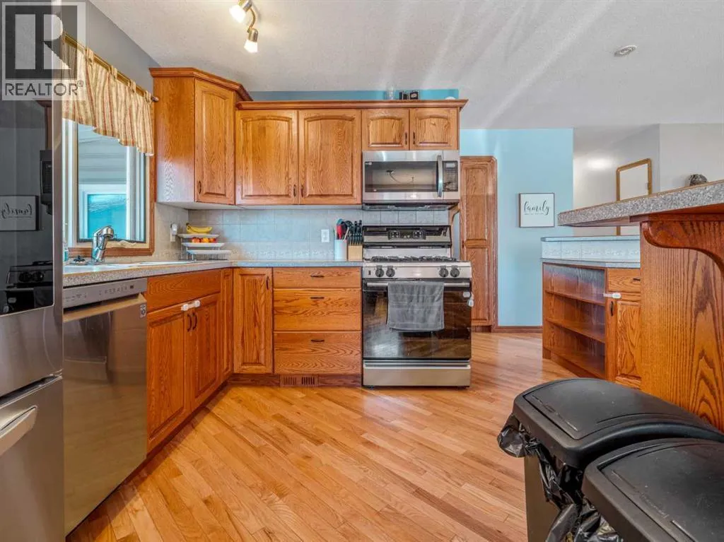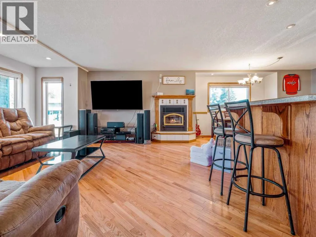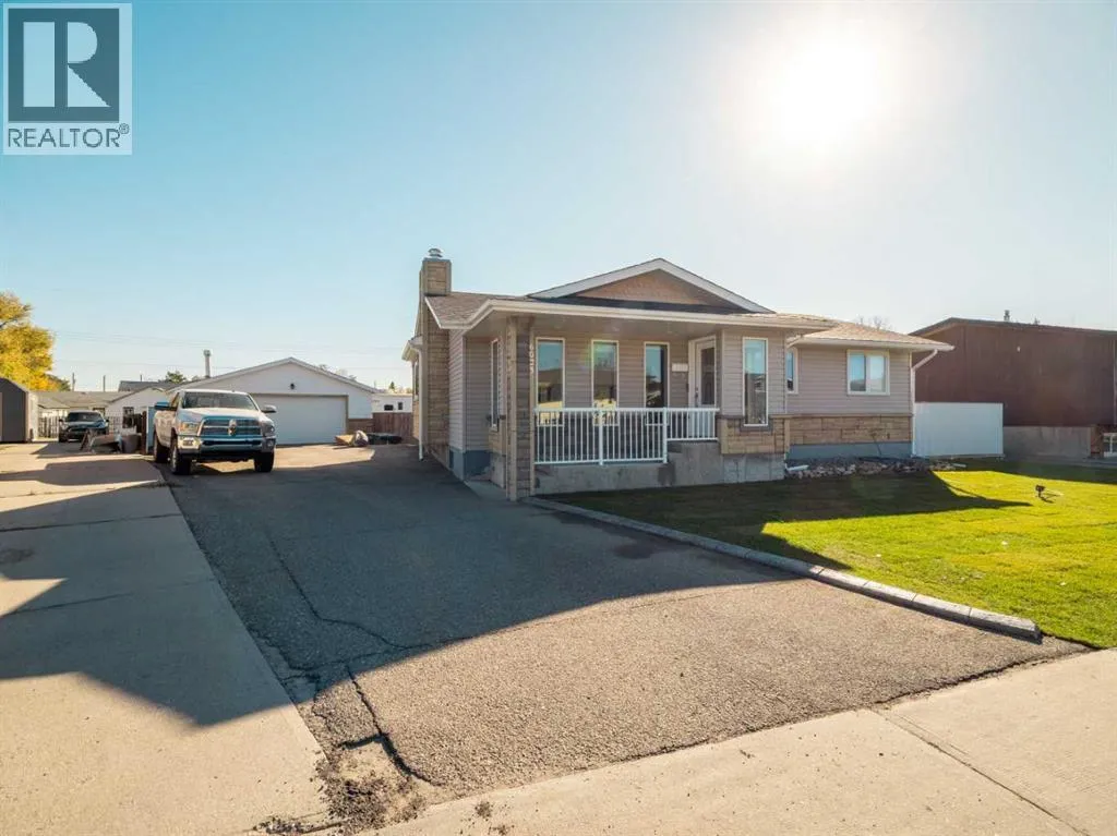 This well-maintained bungalow is perfectly located in a peaceful cul-de-sac and offers great curb appeal with new front-yard sod, a fully fenced backyard, and ample RV parking. The double detached garage has brand new shingles installed. Inside, hardwood floors flow through the open-concept main level, featuring a cozy wood-burning fireplace in the living room, a spacious kitchen that features a kitchen island with abundant counter space, ample cabinetry, and a convenient breakfast bar and a bright dining area. The large mud porch provides convenient storage and everyday functionality. The main floor also includes two comfortable bedrooms and a stylish five-piece Jack-and-Jill bathroom with access from both the primary bedroom and hallway. The fully finished basement adds a large family room, an additional bedroom, and a three-piece bathroomâperfect for guests or extra living space. Enjoy outdoor living under the covered patio with a privacy wall, ideal for relaxing or entertaining. This home combines comfort, charm, and convenience in an excellent location! (id:27476)