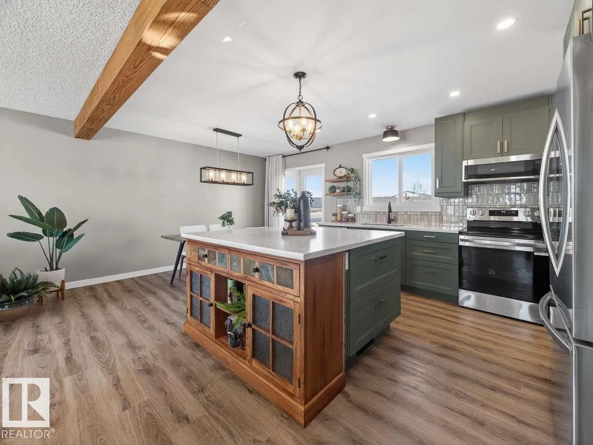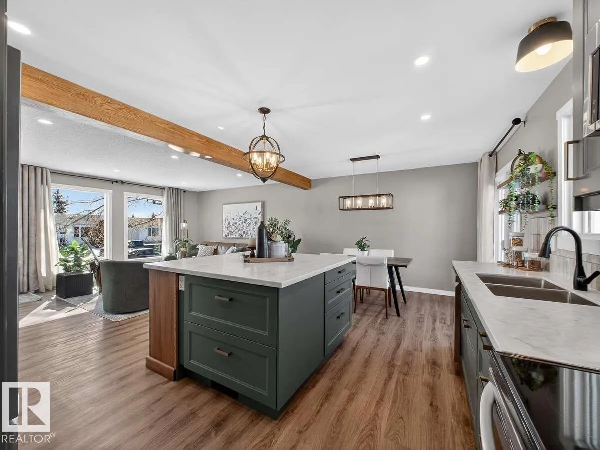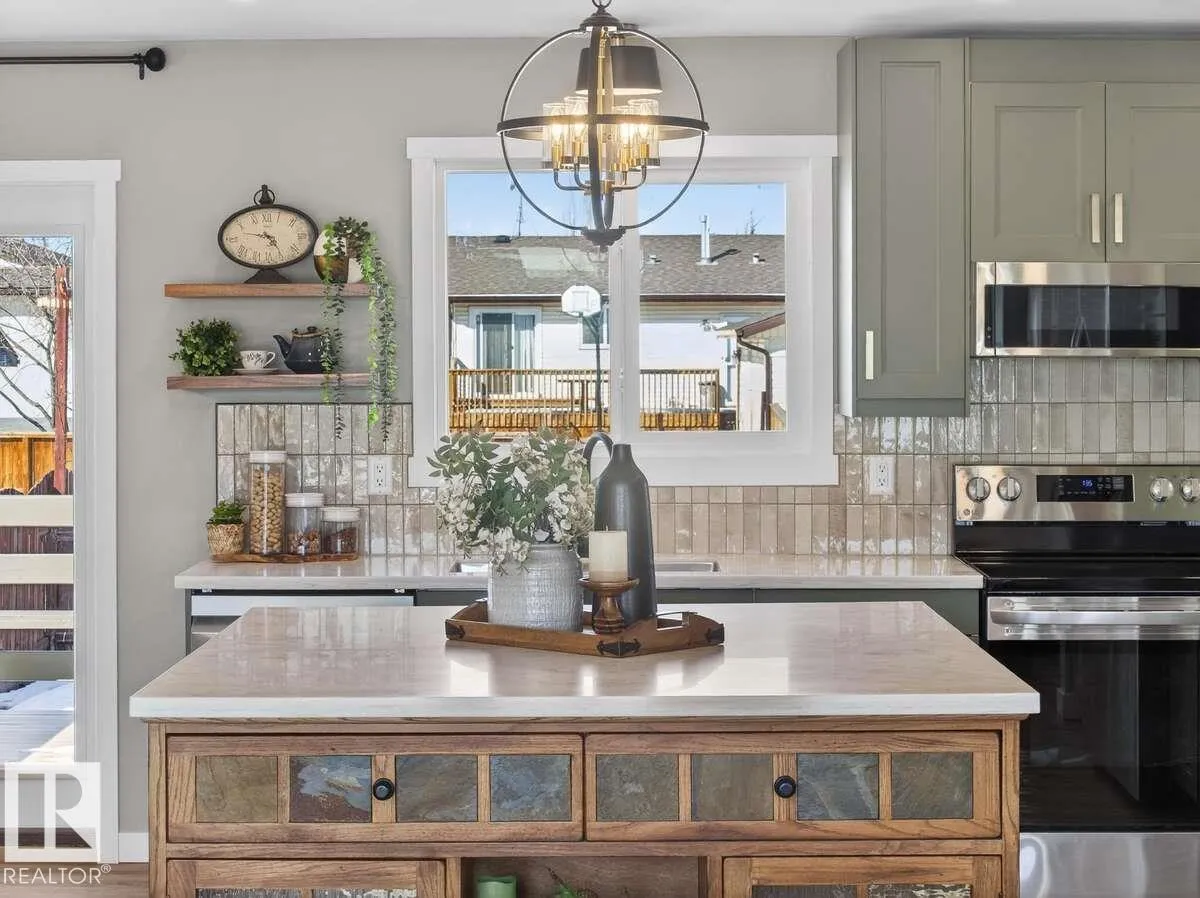 For more info, please click on View Listing on Realtor® Website. This charming, detached bungalow blends modern updates with timeless character, offering a welcoming and functional layout across both levels. The main floor features 3 comfortable bedrooms and a full bathroom along with standout design elements including a wood beam in the open concept area. The heart of the home is the stunning new kitchen, integrating wood cabinetry which complements the new cabinets, complete with solid-surface countertops, a large island, and stylish finishes that make cooking and entertaining a pleasure. Fresh flooring, paint, and light fixtures add to the clean, contemporary feel, while new windows, R60 attic insulation, and a new hot water tank provide efficiency and peace of mind. The fully finished basement expands your living space with a spacious family room, a dedicated laundry room, a second bathroom with a walk-in shower, and plenty of flexible space for storage, hobbies, etc. (id:27476)