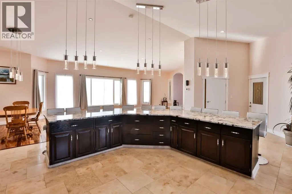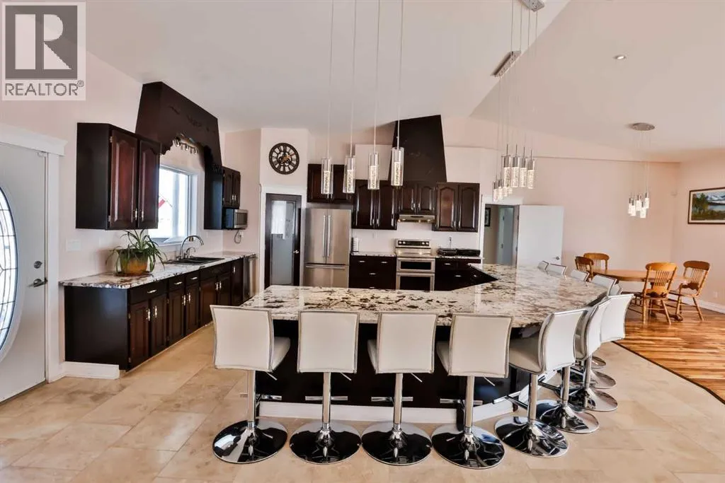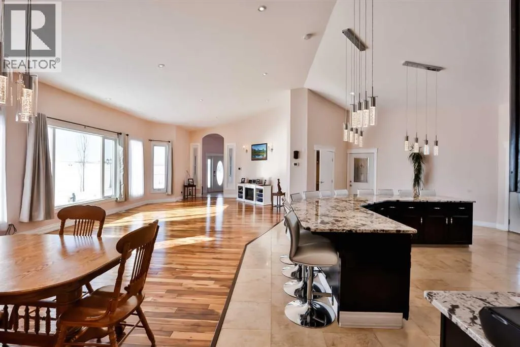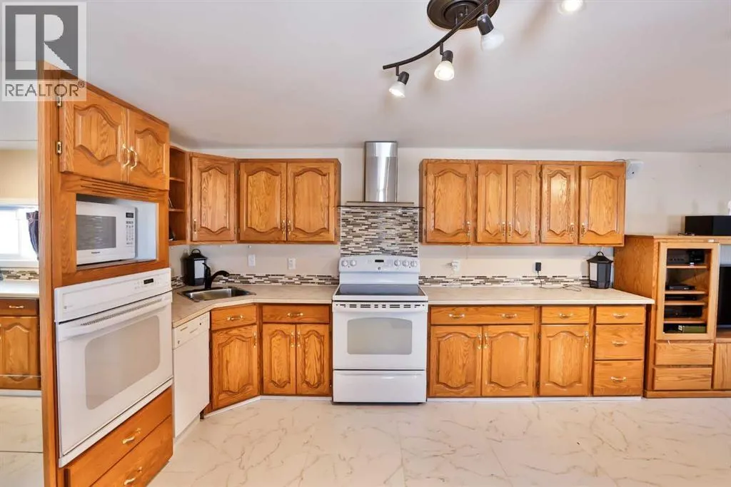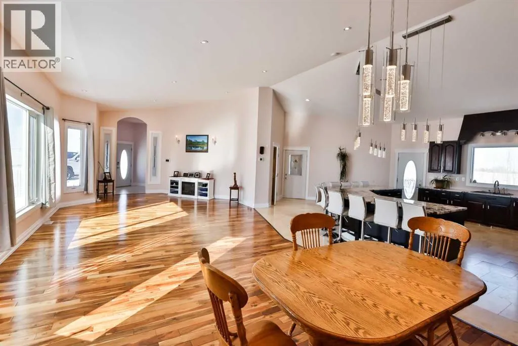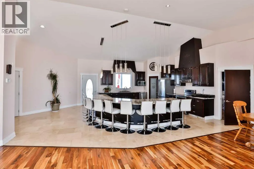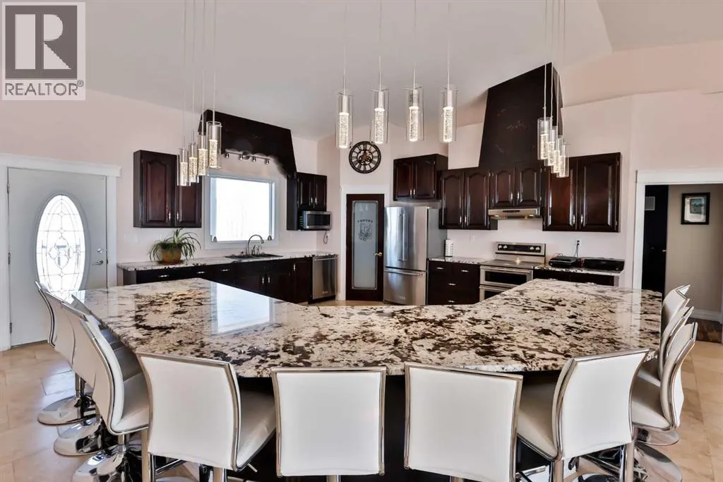 Country living with views as far as the eye can see, is what 11.61 Acre parcel of land can offer you and your family. This home is custom built and has storage and a place for absolutely everything. The egress in this home is outstanding. There are six entry/exits throughout the home. All doorways in the home are 36â wide making moving furniture a breeze. Whatâs really impressive is the main floor living and kitchen area with almost 14 foot vaulted ceilings, beautiful acacia hardwood floors, and a kitchen island that is 18 feet long and can sit 12 stools. The view from the living room is absolutely breathtaking. Not only does the kitchen have an impressive island, it also has been thought out very well with lots of electrical outlets, deeper cupboards, double stainless steel convection oven, touch control faucets, a sill granite sink with an instant hot water dispenser perfect for afternoon tea. The kitchen floor tile are 18â x 18â travertine floor which is stunning against the dark stained cabinets. The primary bedroom is right off of the kitchen area. The high ceilings host extra storage above the his and her closets. There is a built in surround system in the home. The ensuite also has tiled floors and a stacking laundry in the bathroom. The two windows in the en suite make it very bright. There is a tub/shower unit, low flush toilets, make-up counter and linen closet for extra storage. Up over the garage is an illegal suite with its own heating system. This is a perfect mother-in-law suite or just an extra bedroom. The suite does come finished with all appliances, including a washer and a dryer and has a Jacuzzi tub/shower. Thereâs also a large storage space beside the suite that could double as a library! There is a walkout basement in the home with several large windows, so it doesnât feel like a basement. The living space has a projector and screen as well as a stage area with built in speakers. The seller taught music lessons, and had her recitals here. (sta ge can be removed) Thereâs another good size bedroom in the basement and it is wired for TV/entertainment with a full bath not far away. The garage is absolutely massive 24â x 44â deep...a mechanics dream. Itâs fully equipped with a jib crane with a full bathroom. The plugs are endless. 3 x220 plugs and several 110 plugs with 20 amps so youâll never blow a breaker. There are 16 foot ceilings, so a lift easily could be installed. A full ventilation system, and the overhead garage door is 14â x 14â. Another special features is there are 3 fully functioning RV campsites. This acreage is located 15 Min. from Lomond where there is a school from k-12, grocery store, hardware store and restaurant. If youâre looking for peace and quiet, country living, look no further! (id:27476)