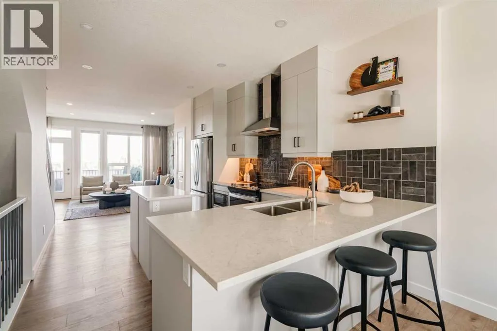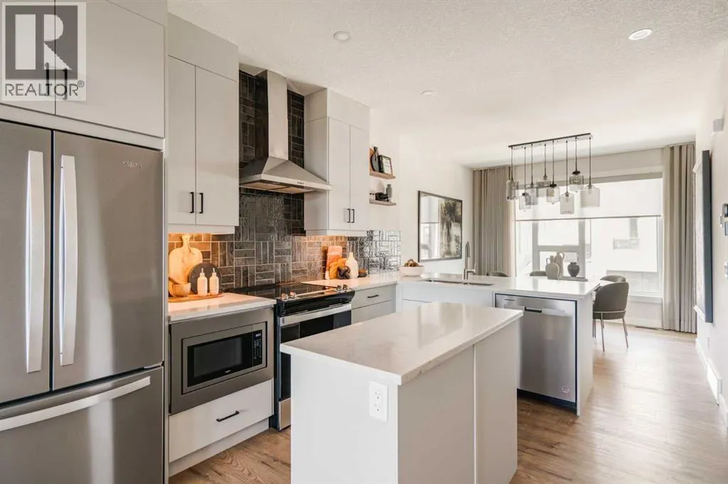 Limited-Time Promotion: Pick 2 of 3 â FREE A/C, 2 YEARS of FREE Condo Fees, or $7,500 Toward Options! Welcome to Rhythm townhomes at Taza Park by Brookfield Residential, offering a low-maintenance lifestyle perfect for first-time buyers, downsizers, or those seeking a convenient lock-and-leave home. This bright and modern âArnicaâ model features an intelligently designed open-concept layout with 2 bedrooms, 2.5 bathrooms, a main-level den/flex room, and a single attached garage, providing over 1,500 sq. ft. of beautifully appointed living space, plus a large rooftop patio. The main living level is filled with natural light from oversized windows and offers a seamless layout ideal for both everyday living and entertaining. The upgraded kitchen features full-height cabinetry, stainless steel appliances (including a range hood and built-in microwave), a French-door refrigerator, a large peninsula with seating, and a corner pantry. The kitchen flows into the dining area and spacious living room, with direct access to a private balcony. A convenient 2-piece powder room completes this level. Upstairs, youâll find dual primary bedrooms, each with generous closet space and private ensuites, an ideal setup for guests, roommates, or added flexibility. A centrally located laundry area adds everyday convenience. The entry level features a versatile den/flex space, perfect for a home office, media room, or play area. The single attached garage provides secure parking along with additional storage. Additional highlights include upgraded spindle railings, a natural gas BBQ line, and a 3-year extended workmanship warranty for added peace of mind. Legal fees are included, and a complimentary Virtuo move-in concierge service ensures a smooth transition. Ideally located just minutes from Weaselhead Park, the Glenmore Reservoir, and major commuter routes, Rhythm at Taza Park offers the perfect blend of nature and urban convenience. This is a rare opportunity to own a brand-new contempo rary townhome in a highly desirable location, book your showing today. **Please note: Photos are of a show home and finishes may vary. (id:27476)