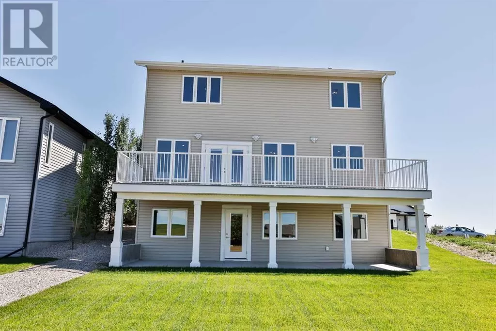 Welcome to your NEXT home! As you approach this residence, you'll immediately notice the beautifully landscaped yard, complete with underground sprinklers that are Wi-Fi enabled for your convenienceâa rare upgrade in a newly constructed home. The stunning exterior rock work highlights the front of the property, and who doesnât appreciate a spacious driveway?Step inside this open-concept home, where vinyl plank flooring flows throughout the main level. Large windows line the back of the house, allowing natural light to fill the space, while a gas fireplace adorned with wood mantle detailing adds warmth and character to the living room. The kitchen features elegant white cabinets and quartz countertops that enhance the room's brightness. You'll find an abundance of pots and pans drawers, accented with lovely black handles. All stainless steel appliances, a built-in butlerâs pantry, and a dedicated desk area with upper cabinets provide ample storage and functionality.The windows at the back of the home offer breathtaking views of the Rocky Mountains and the 12th green of the Vulcan Golf Course. Step out onto your expansive deck that spans the width of the home, perfect for entertaining guests. This outdoor space is finished with vinyl decking and aluminum railing, for low maintenance lifestyle. On the second floor, you'll discover generously sized bedrooms, a full bathroom, and a convenient laundry area. The primary bedroom, situated at the back of the home, boasts a spacious walk-in closet with custom built-ins, as well as a beautiful ensuite bathroom featuring a tub and shower with double sinks.The basement is currently undeveloped and awaits your creative touch! This walkout basement is filled with natural light and leads to a concrete patio that completes the space.Additionally, there is a double attached garage that is insulated and drywalled for your comfort.You'll appreciate the absence of HOA fees in this part of the golf course development, allowin g you the freedom to install a fence if you have a dog or garden. Plus, there are no age restrictions in this area!Living on the Vulcan Golf Course means enjoying a vibrant community, complete with an abundance of amenities, including close proximity to schools, an outdoor pool, parks, a hospital and arena. Located between the cities of Lethbridge and Calgary on Highway 23, this would be a perfect area to call home. Give your REALTOR®? a call today! (id:27476)