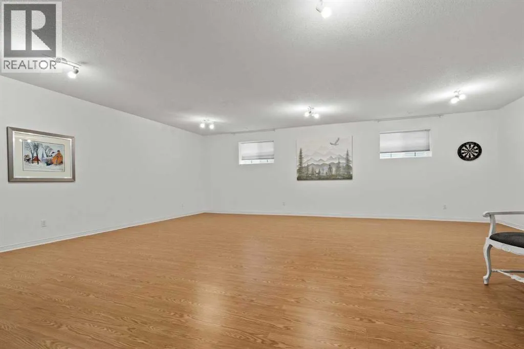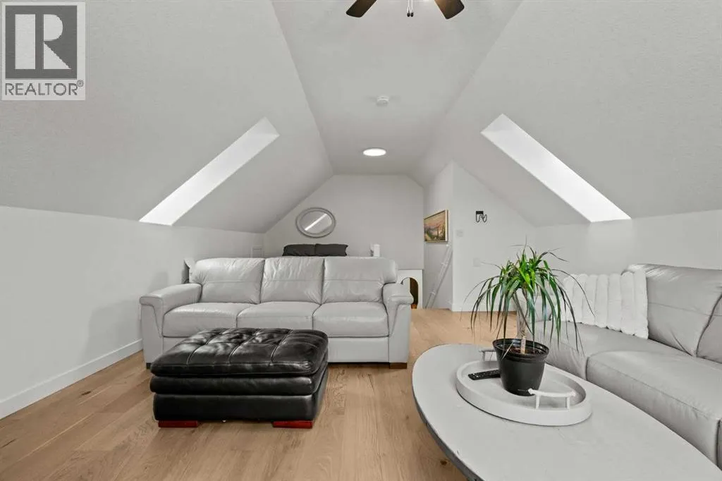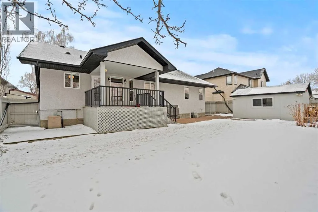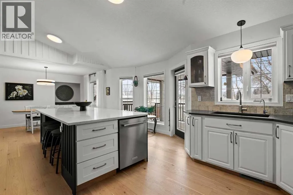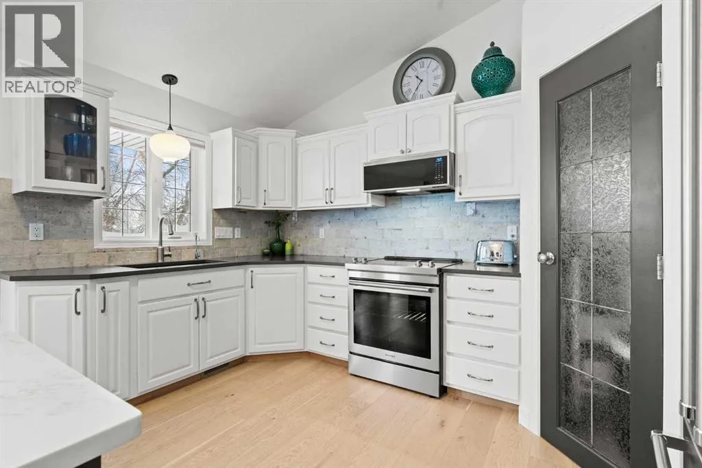 This MOVE IN READY HOME has been thoughtfully updated with features that focus on function in designing this ELEGANT MAKEOVER. A freshly painted front exterior and cozy covered front verandah speak to the classic curb appeal that sets this home apart in a league of it's own. Vaulted ceilings soaring above banks of windows that capture the natural light highlight the open floor plan that flows seamlessly... inviting larger family gatherings or intimate get togethers. A neutral paint palette offsets the gorgeous new engineered hardwood flooring - trimmed with high profile baseboards on the main floor. Masterfully crafted is the focal point of the main floor - a stunning island addition that isn't just an amazing storage and dining area.. it's the hub of this gorgeous family home. Custom designed wood details trim the island and complement the feature walls located in several areas of the house. A massive quartz slab accentuates the grandness of the island and showcases the sleek quartz topped cabinetry at the rear of the kitchen. A refreshed stone tiled backsplash complements the Stainless Steel appliances. Banks of drawers have been added for convenient storage. A spacious Living Room with a re-faced gas fireplace is offset from the kitchen for entertaining. An open-ended dining area boasts enough room for a larger table and a servery/coffee bar has been added for your convenience. The primary suite tucked away at the end of the hall delivers privacy and solitude and features custom wall detailing, a walk in closet and a lovely updated 5 pc ensuite bath complete with a jetted soaker tub and separate shower. Main floor laundry and a 4 pc main bath complete the main level. The bathrooms showcase new quartz topped vanities, tile backsplash and new sinks and taps. Ascending to the loft you are greeted by a spacious room that can be anything you need. Vaulted ceilings, lots of windows and sky lights to brighten the room all day, easy care engineered hardwood flooring... e asy to add an area rug for a TV get away/bedroom or perfect as is for a crafters room. The four piece main bath is at the bottom of the stairs to accommodate a bedroom in the loft area. The lower level has a 4 pc bath, two additional bedrooms and plenty of room to add more with legal egress windows and 9 ft ceilings already in place. In floor heat keeps this level cozy in the winter months and the AC keeps the rest of the house cool in the summertime. A massive open recreation area in the lower level will fit your pool table and gaming desires to create a family sized entertainment area. The oversized 24'11"x 24'11" insulated and drywalled garage has in floor heat, and a 220 V power source. In ground sprinklers, a man sized garden shed with power, perennial beds laid with rocks that flank the perimeter and front grounds, and covered front and rear porches to satisfy your outdoor enjoyment complement the mature landscaping. This home is a dream to show! Call today! (id:27476)