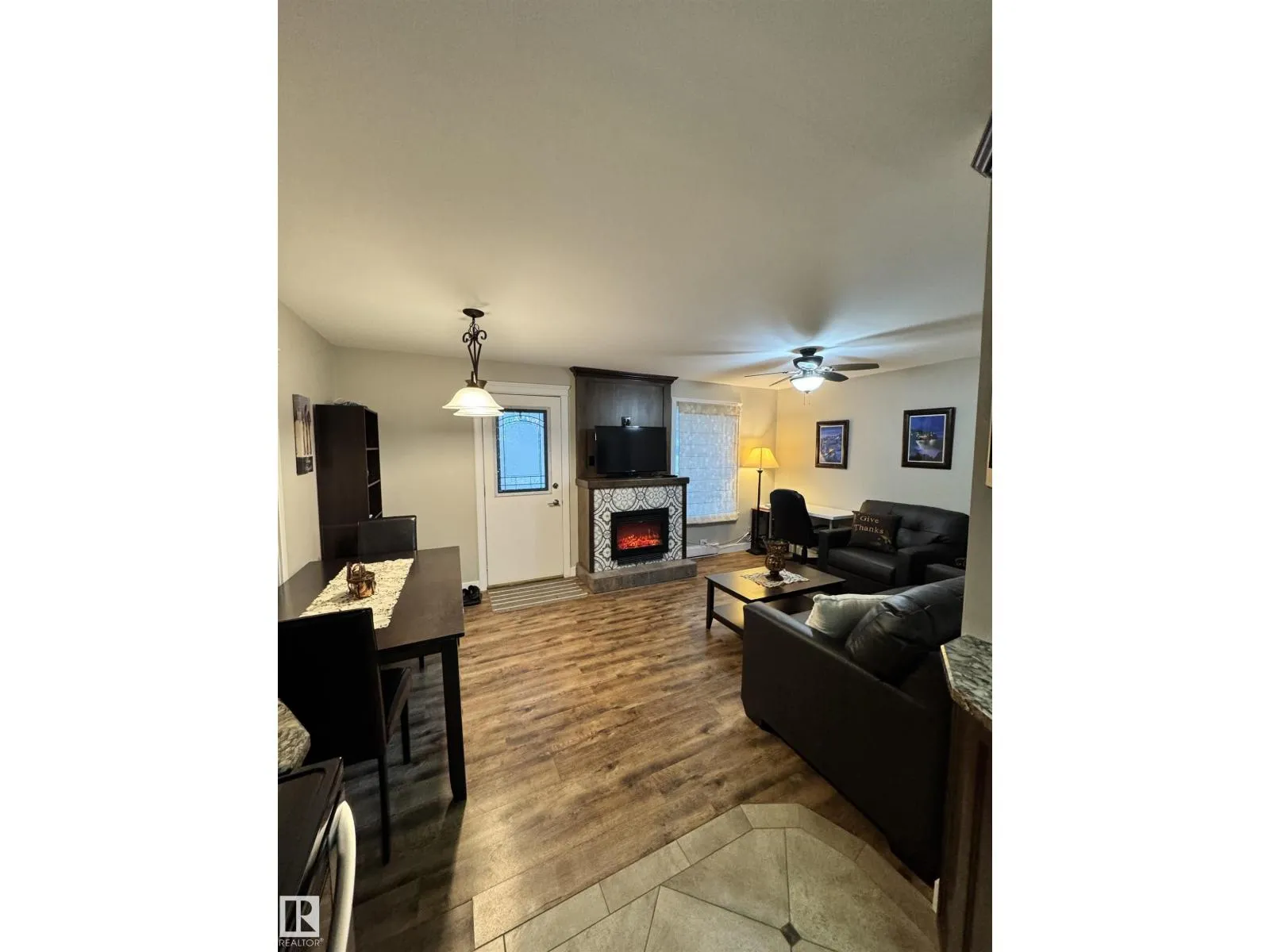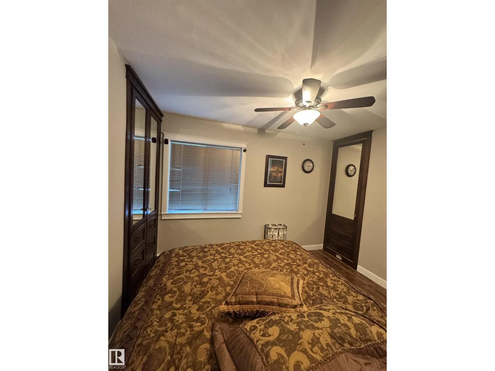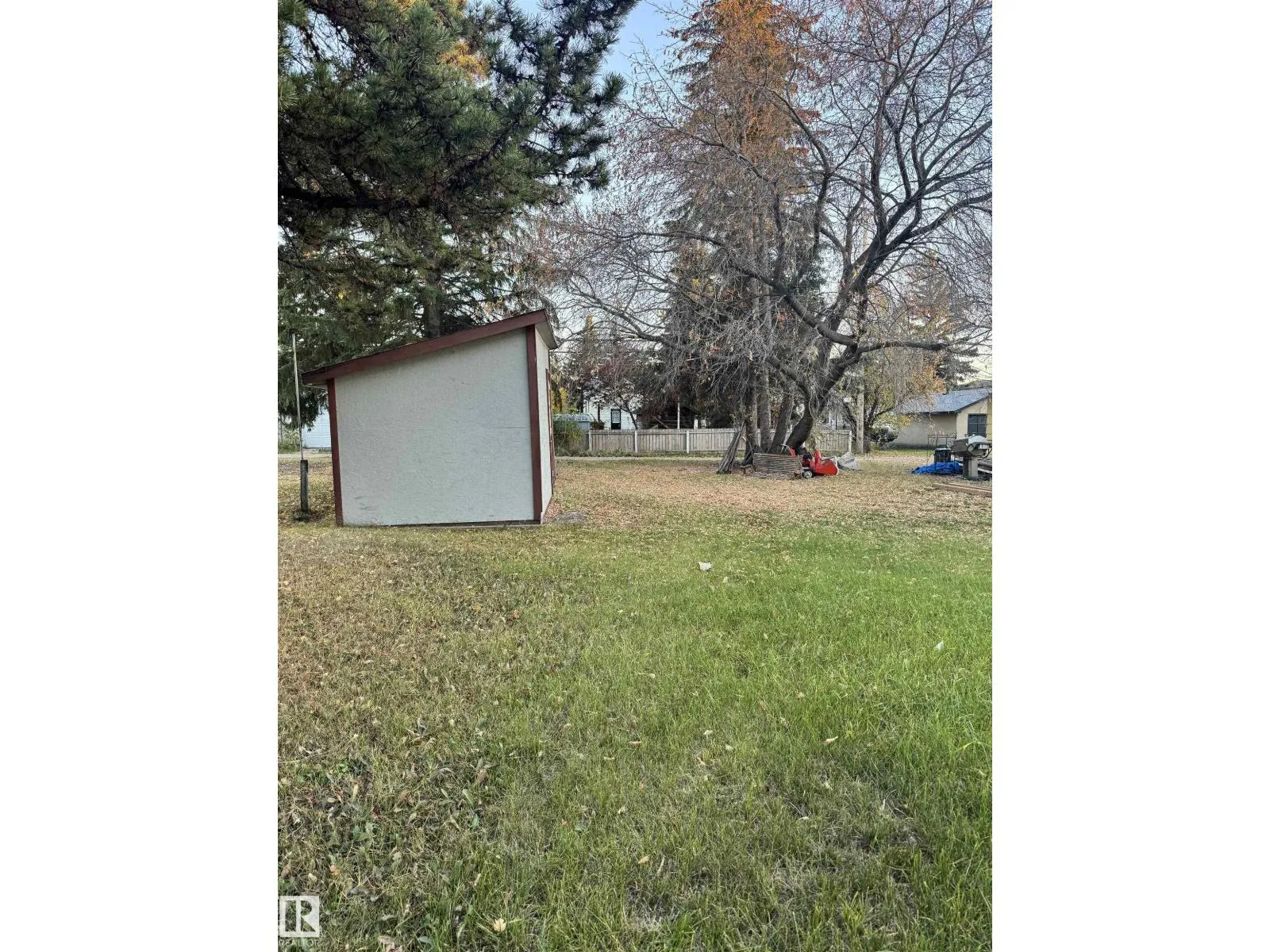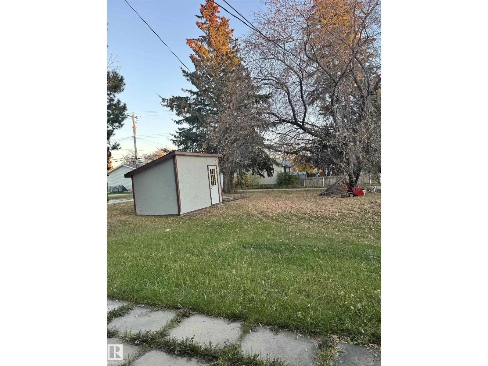 Cozy bungalow in Westlock surrounded by mature evergreens and a welcoming front flower bed. Step inside to your vision of a custom tiny home with a warm living and dining area featuring a tile-surround fireplace. The kitchen boasts custom cabinetry, stainless steel appliances, and ceramic tile, creating a thoughtful, efficient layout. Built-in cabinetry flows throughout the home, from the fireplace to the kitchen, laundry, bedroom, and bath, blending function with design. The primary bedroom includes built-in wardrobes, end tables, pot lights, and a ceiling fan for comfort. The laundry room offers a bench and more cabinets for back entry storage. The four-piece bath features a tiled shower and a heat lamp. Outside, enjoy a large backyard with trees, a storage shed, and a walking path wrapping the home, ideal for relaxing, gardening, or future expansion of your small-town sanctuary. (id:27476)