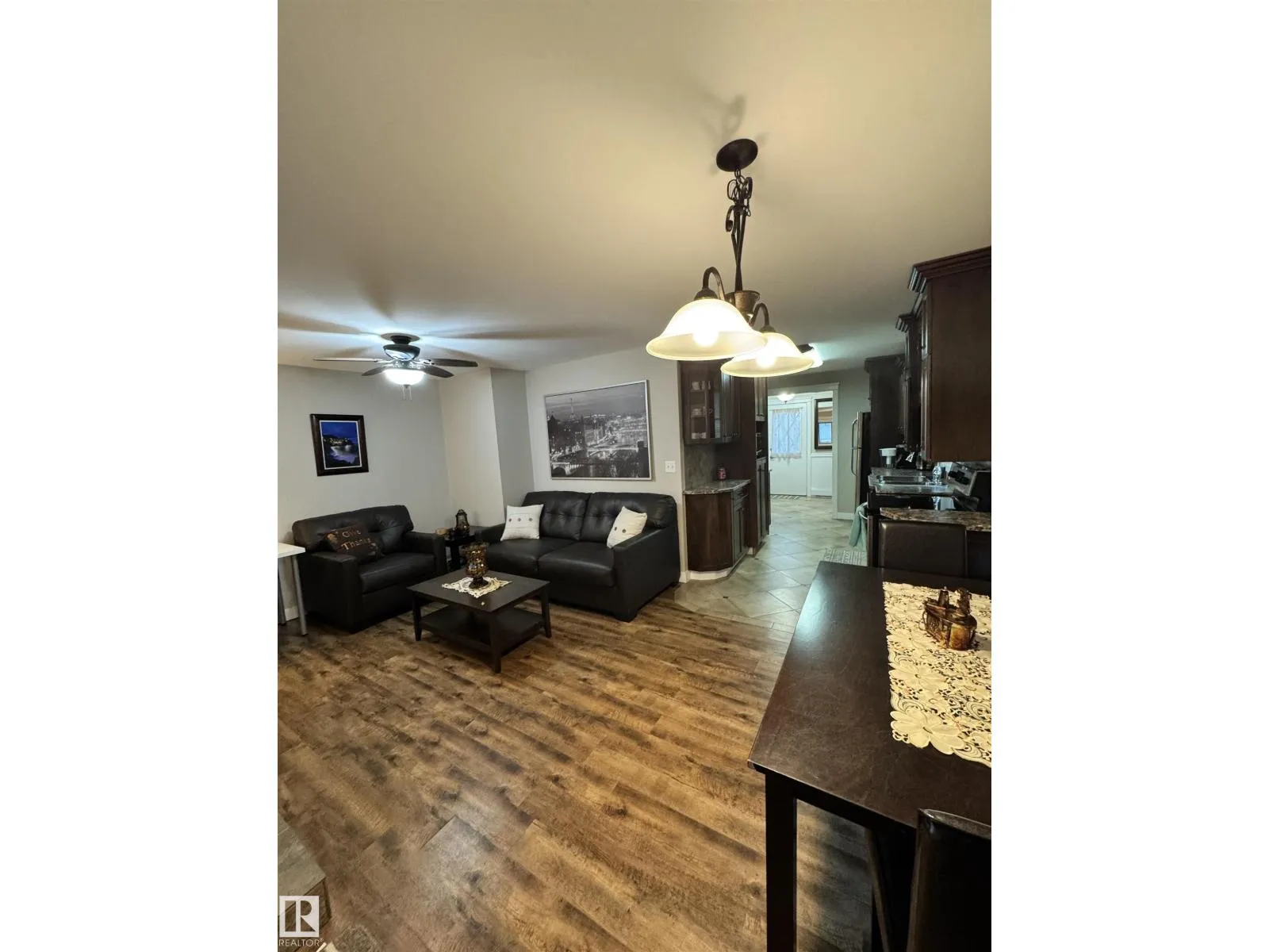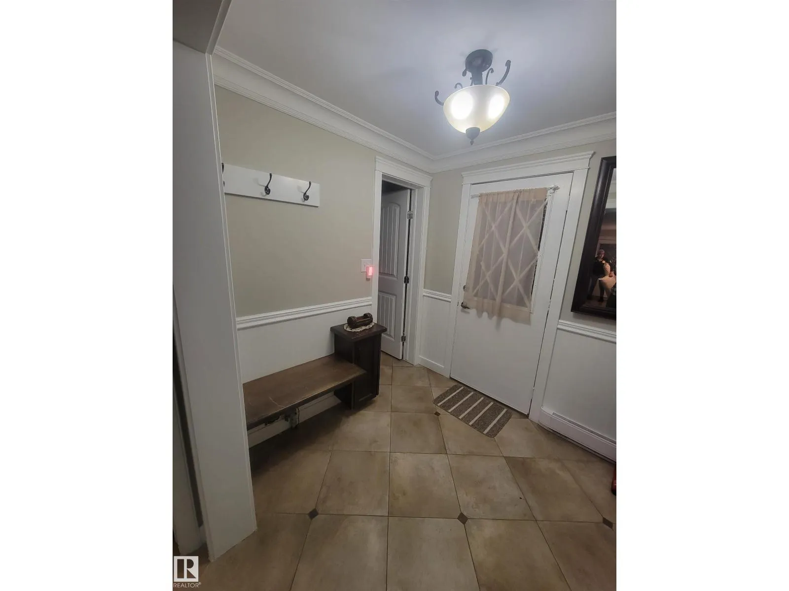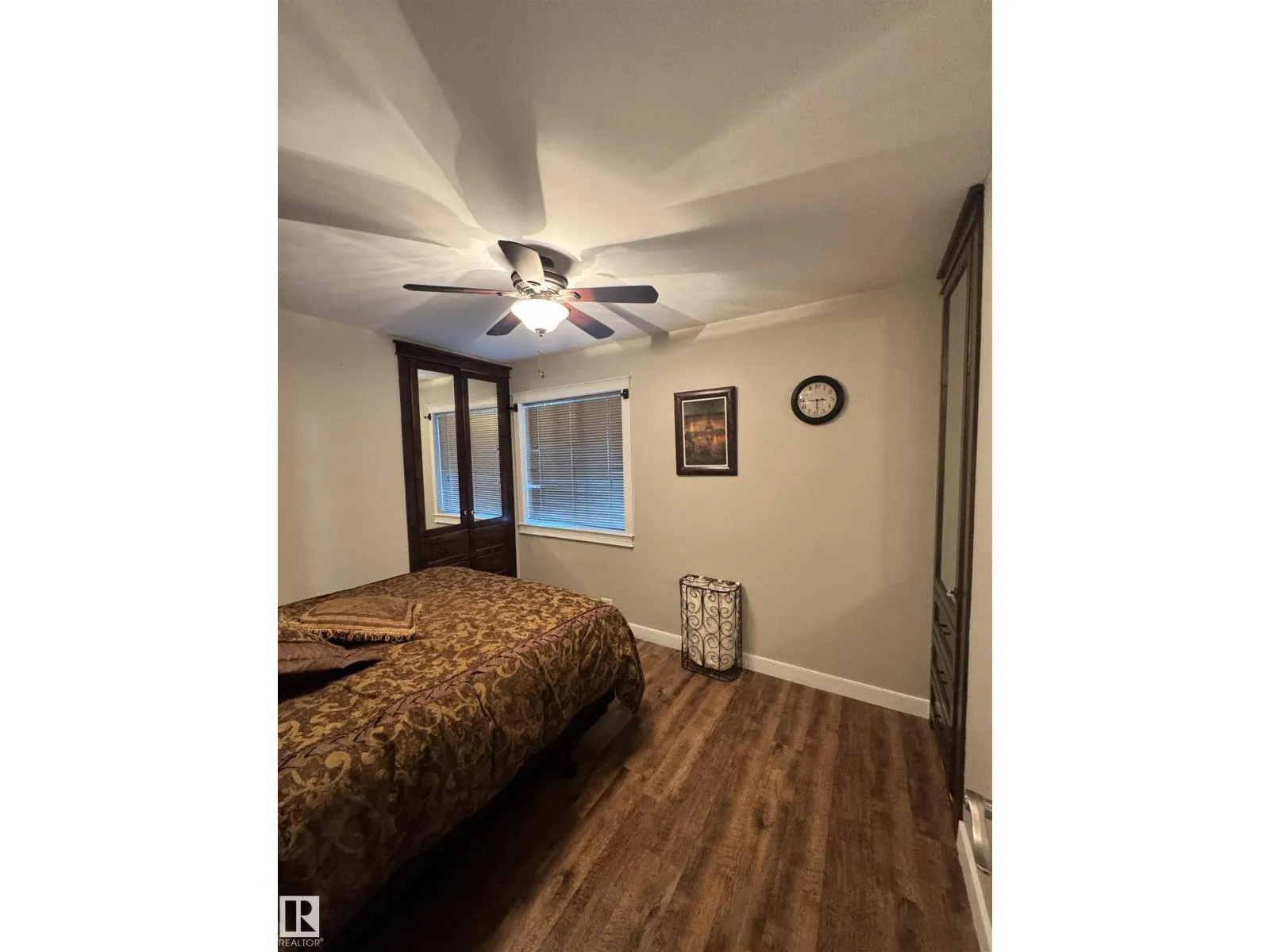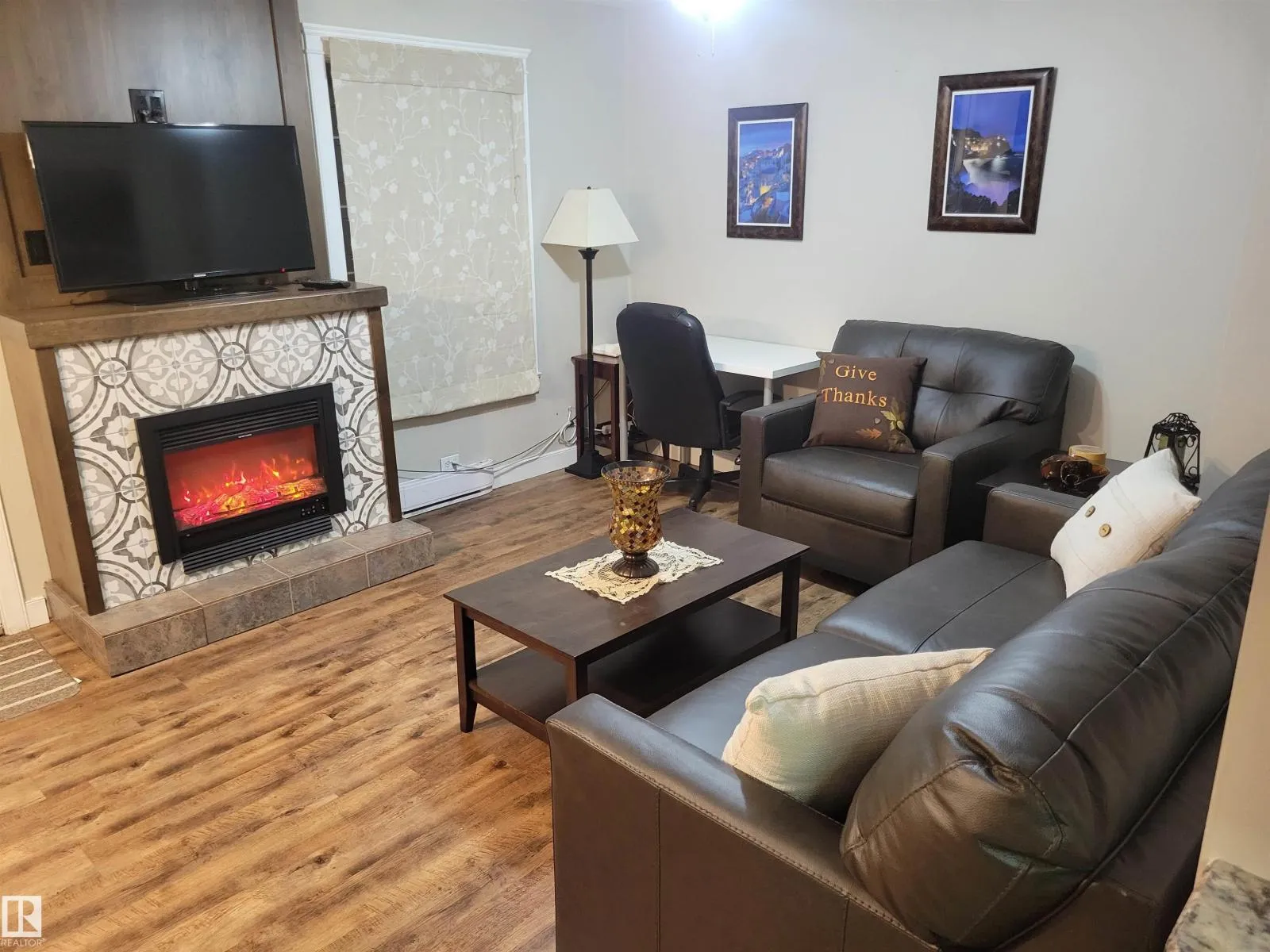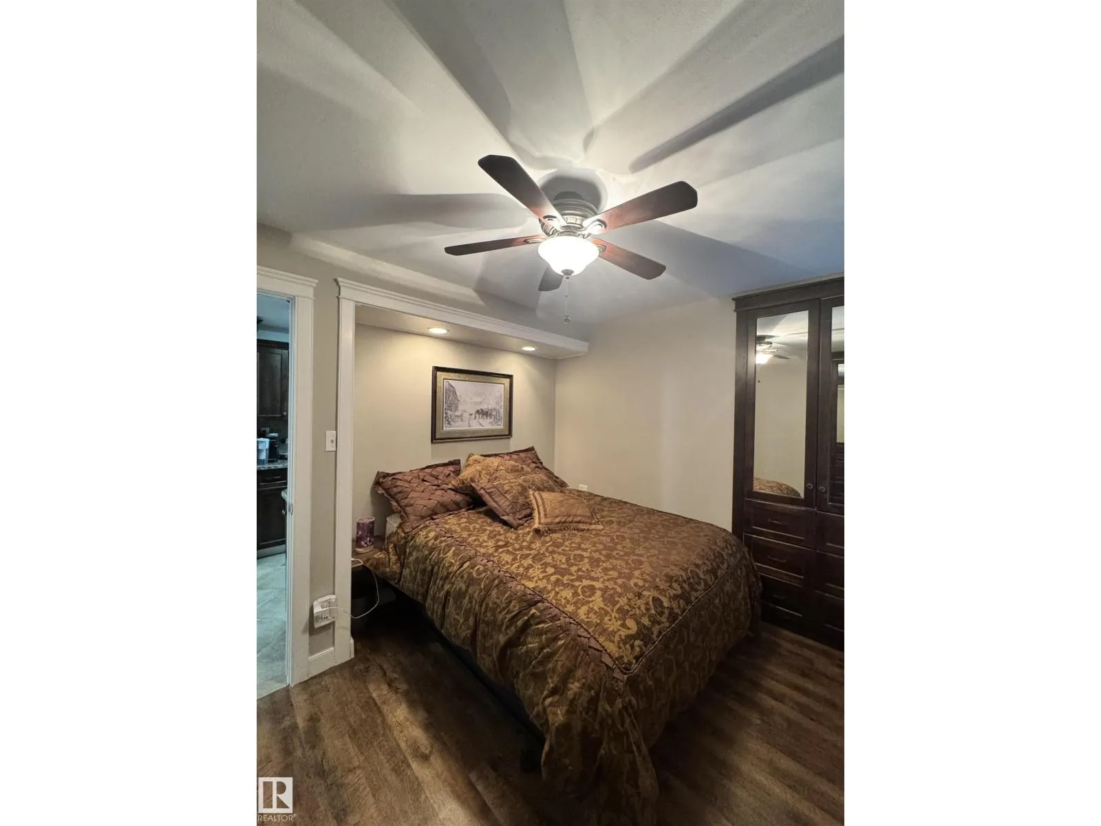 Cozy bungalow in Westlock surrounded by mature evergreens and a welcoming front flower bed. Step inside to your vision of a custom tiny home with a warm living and dining area featuring a tile-surround fireplace. The kitchen boasts custom cabinetry, stainless steel appliances, and ceramic tile, creating a thoughtful, efficient layout. Built-in cabinetry flows throughout the home, from the fireplace to the kitchen, laundry, bedroom, and bath, blending function with design. The primary bedroom includes built-in wardrobes, end tables, pot lights, and a ceiling fan for comfort. The laundry room offers a bench and more cabinets for back entry storage. The four-piece bath features a tiled shower and a heat lamp. Outside, enjoy a large backyard with trees, a storage shed, and a walking path wrapping the home, ideal for relaxing, gardening, or future expansion of your small-town sanctuary. (id:27476)