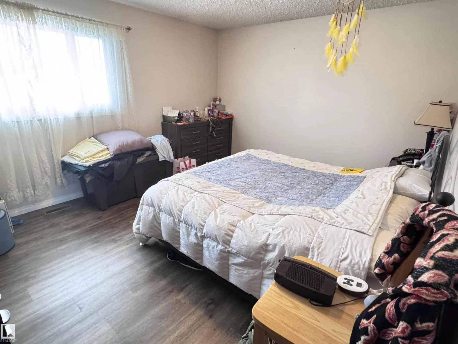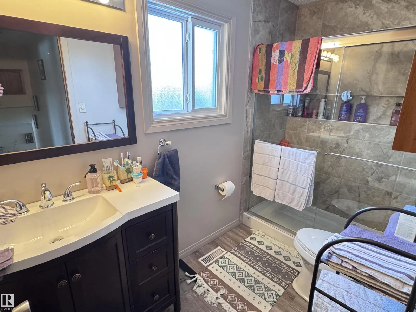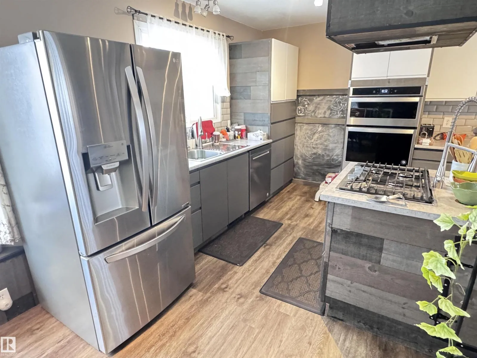 Attractive split-level home featuring a stunning modern kitchen with gas cooktop, convenient pot filler, wall oven with matching microwave, and full stainless steel appliance package. Designed for entertaining, the kitchen offers a massive island with breakfast bar, soft-close cabinetry, subway tile backsplash, and a spacious dining area. The upper level hosts three bedrooms and a recently renovated 3-piece bathroom. The lower level includes a fourth bedroom, 3-piece bathroom, and durable commercial-grade carpeting, with newer laminate flooring throughout the rest of the home. Low maintenance exterior features mostly stucco with aluminum, vertical siding and brick accents. Situated on a corner lot with chain-link fencing and privacy slats. Numerous upgrades include newer shingles on both house and garage, a high-efficiency furnace with central air conditioning, and a newer hot water tank. (id:27476)