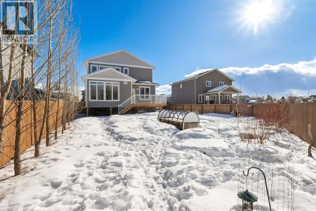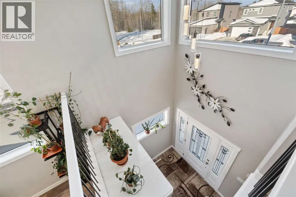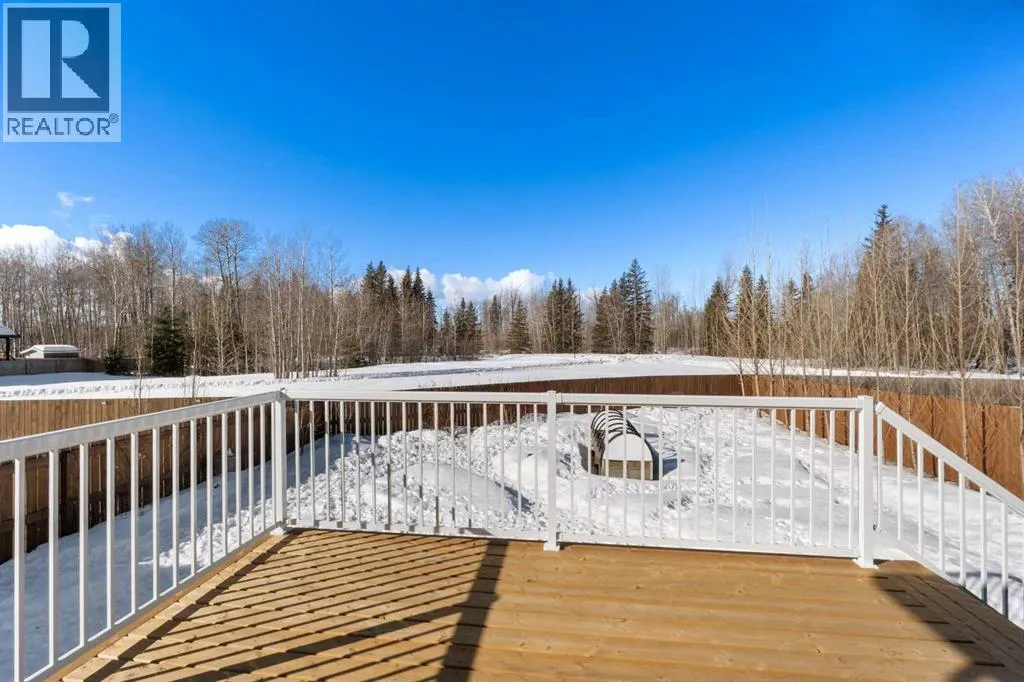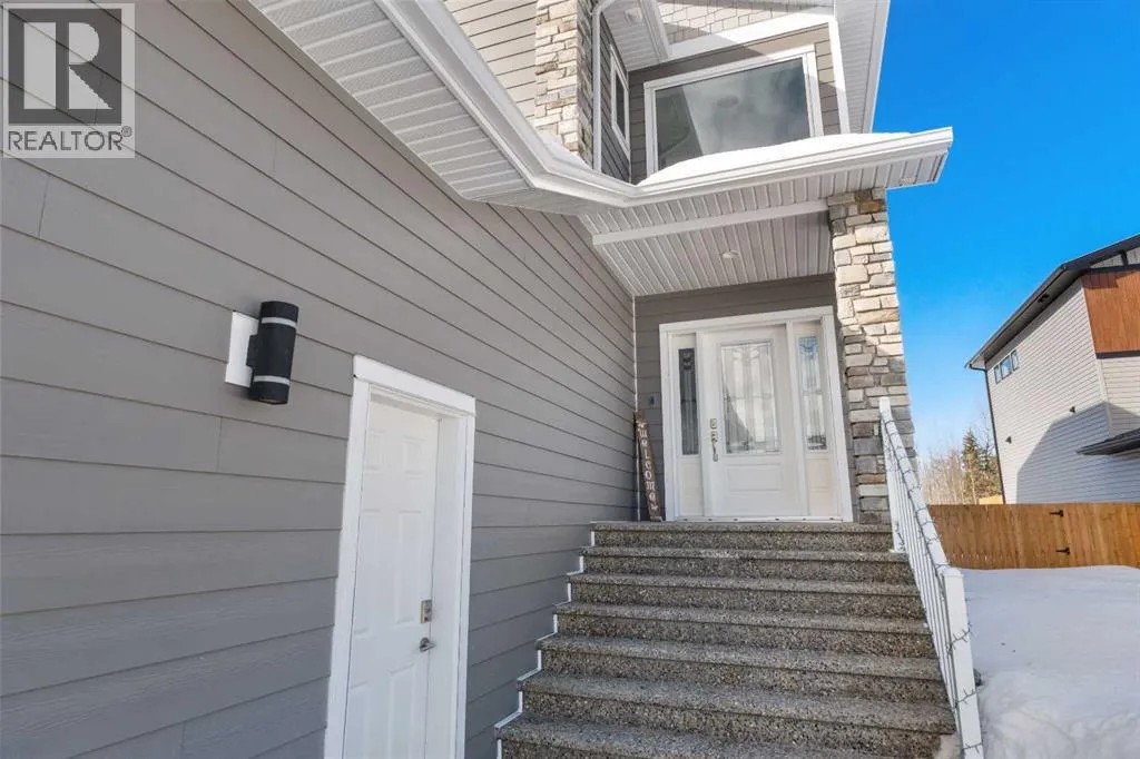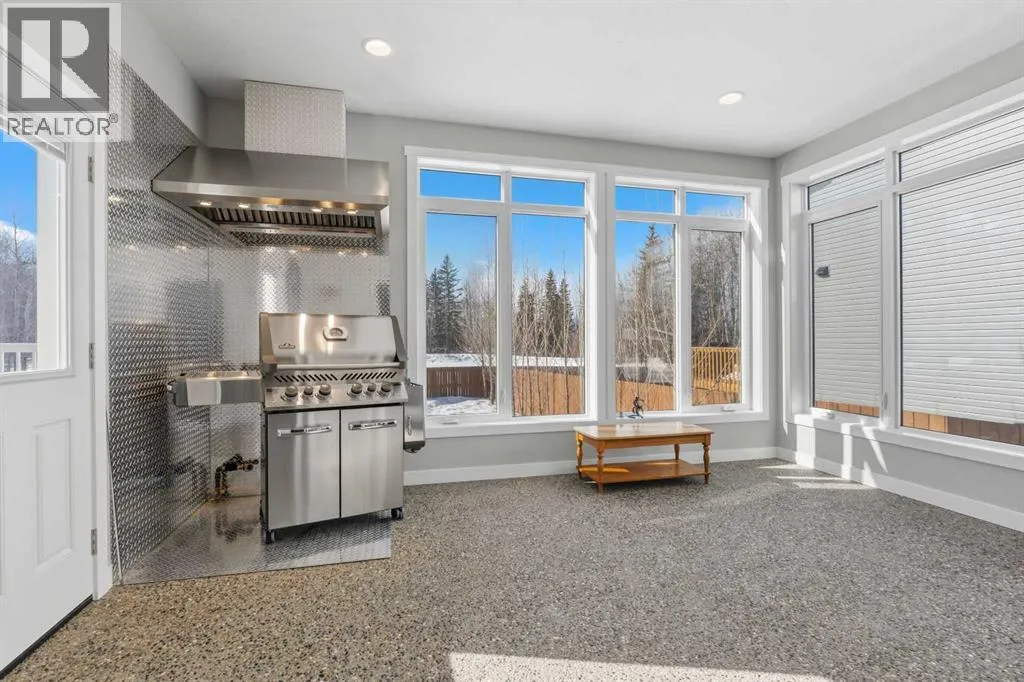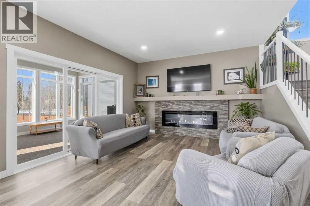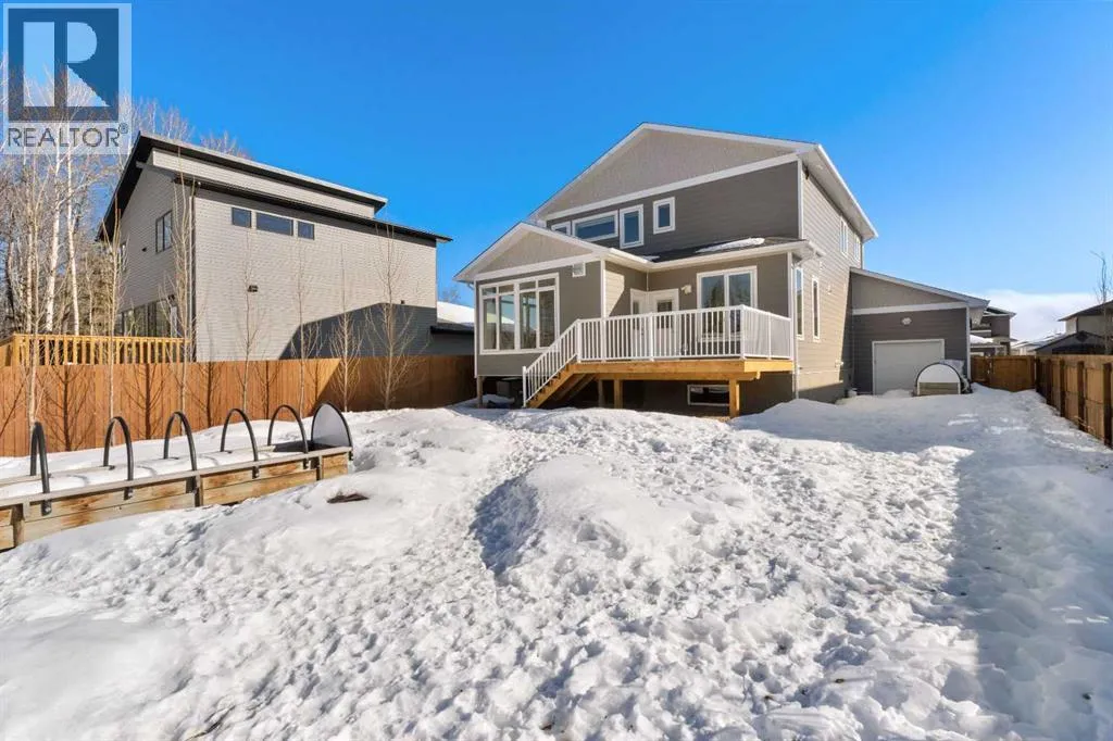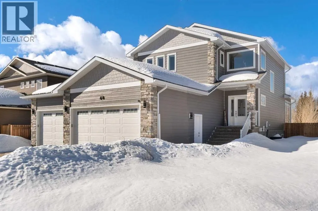 Custom home is situated in a quiet cul-de-sac backing onto green space, offering direct access to paved trails leading to the Athabasca River or Festival Park. The exterior features a wide aggregate driveway to a massive 1,068 sq. ft. triple-car garage with 11-foot ceilings, an overhead heater, hot and cold taps, a dedicated dog wash, EV charging, and a convenient drive-thru bay to the backyard. Inside, the main floor greets you with a soaring entryway looking up to the second level, 9-foot ceilings throughout, and a smart second entrance from the garage to hide clutter from guests. The gourmet kitchen is a standout with quartz countertops, a walk-through pantry, upgraded ceiling-height cabinets, a bar fridge, and an electric stove with a double oven, all centered around a large island that seats five (or more) comfortably. This space flows into a bright dining area with south and west-facing windows for evening sun, and a living room with an electric fireplace that opens to a fully enclosed, insulated 3-season room featuring a natural gas line and a commercial-grade hood fan for year-round indoor grilling. Upstairs, extra-wide stairs facilitate easy furniture movement and lead to three bedrooms and a convenient laundry room. The primary suite has soundproofing in the floor, wall, and door for total quiet, and windows overlooking your backyard. A 5-piece ensuite with two sinks, triple shower heads and a 15-foot walk-through closet that leads directly into the laundry room. The fully finished basement adds a fourth bedroom with a walk-in closet, a wet bar with a matching bar fridge, and a fully soundproofed theatre room with two hidden windows already installed for an easy conversion to a 5th bedroom if needed. The home also includes the convenience of a built-in central vacuum system with a quick-sweep plate in the kitchen for effortless cleanup, along with a large, finished storage area tucked under the stairs featuring matching flooring and trim. Every inch of thi s home is built for efficiency and comfort, featuring fire- and hail-resistant Hardie Board on an ICF block foundation, a dual-zone high-efficiency furnace for separate temperature control on each level, a 60-gallon hot water tank, and a Black Box electrical system that intelligently manages power between your EV charger and appliances. Hot and cold taps front and back outside are such little examples of the upgrades this home holds. This residence is a masterpiece! (id:27476)