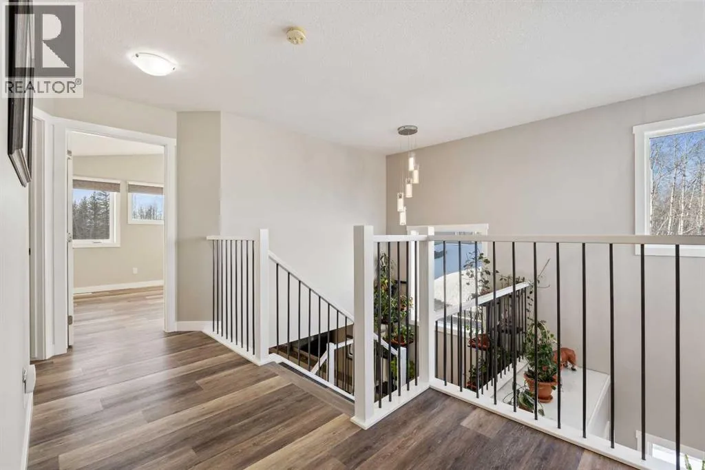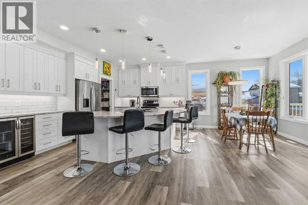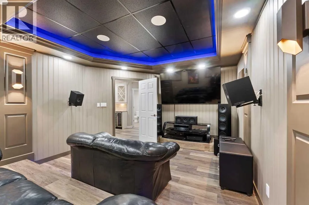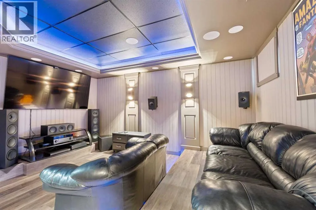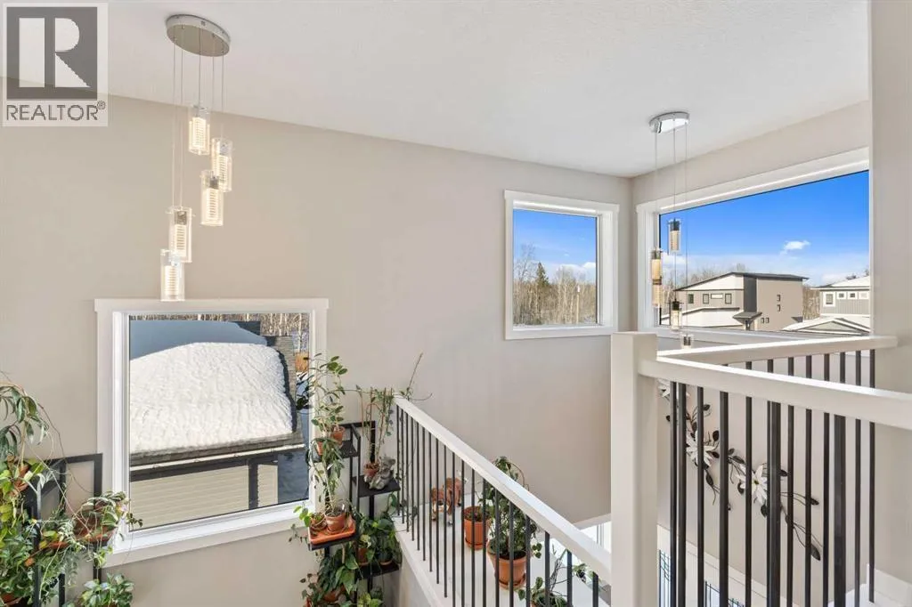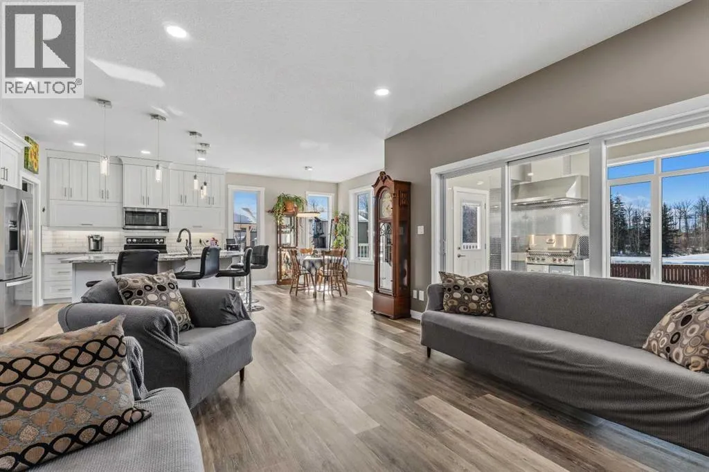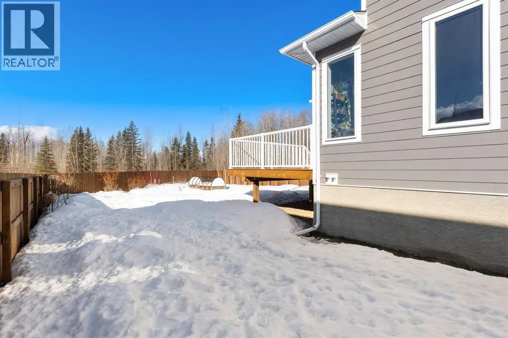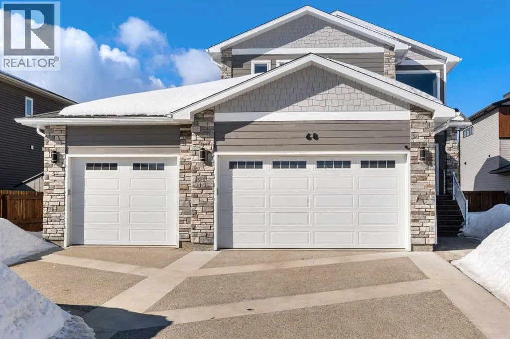 Custom home is situated in a quiet cul-de-sac backing onto green space, offering direct access to paved trails leading to the Athabasca River or Festival Park. The exterior features a wide aggregate driveway to a massive 1,068 sq. ft. triple-car garage with 11-foot ceilings, an overhead heater, hot and cold taps, a dedicated dog wash, EV charging, and a convenient drive-thru bay to the backyard. Inside, the main floor greets you with a soaring entryway looking up to the second level, 9-foot ceilings throughout, and a smart second entrance from the garage to hide clutter from guests. The gourmet kitchen is a standout with quartz countertops, a walk-through pantry, upgraded ceiling-height cabinets, a bar fridge, and an electric stove with a double oven, all centered around a large island that seats five (or more) comfortably. This space flows into a bright dining area with south and west-facing windows for evening sun, and a living room with an electric fireplace that opens to a fully enclosed, insulated 3-season room featuring a natural gas line and a commercial-grade hood fan for year-round indoor grilling. Upstairs, extra-wide stairs facilitate easy furniture movement and lead to three bedrooms and a convenient laundry room. The primary suite has soundproofing in the floor, wall, and door for total quiet, and windows overlooking your backyard. A 5-piece ensuite with two sinks, triple shower heads and a 15-foot walk-through closet that leads directly into the laundry room. The fully finished basement adds a fourth bedroom with a walk-in closet, a wet bar with a matching bar fridge, and a fully soundproofed theatre room with two hidden windows already installed for an easy conversion to a 5th bedroom if needed. The home also includes the convenience of a built-in central vacuum system with a quick-sweep plate in the kitchen for effortless cleanup, along with a large, finished storage area tucked under the stairs featuring matching flooring and trim. Every inch of thi s home is built for efficiency and comfort, featuring fire- and hail-resistant Hardie Board on an ICF block foundation, a dual-zone high-efficiency furnace for separate temperature control on each level, a 60-gallon hot water tank, and a Black Box electrical system that intelligently manages power between your EV charger and appliances. Hot and cold taps front and back outside are such little examples of the upgrades this home holds. This residence is a masterpiece! (id:27476)