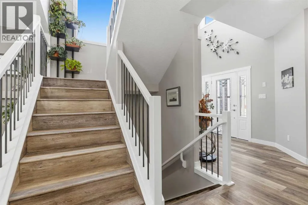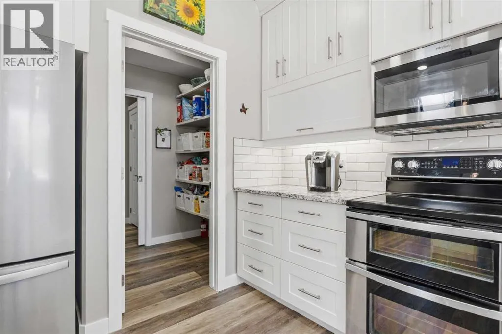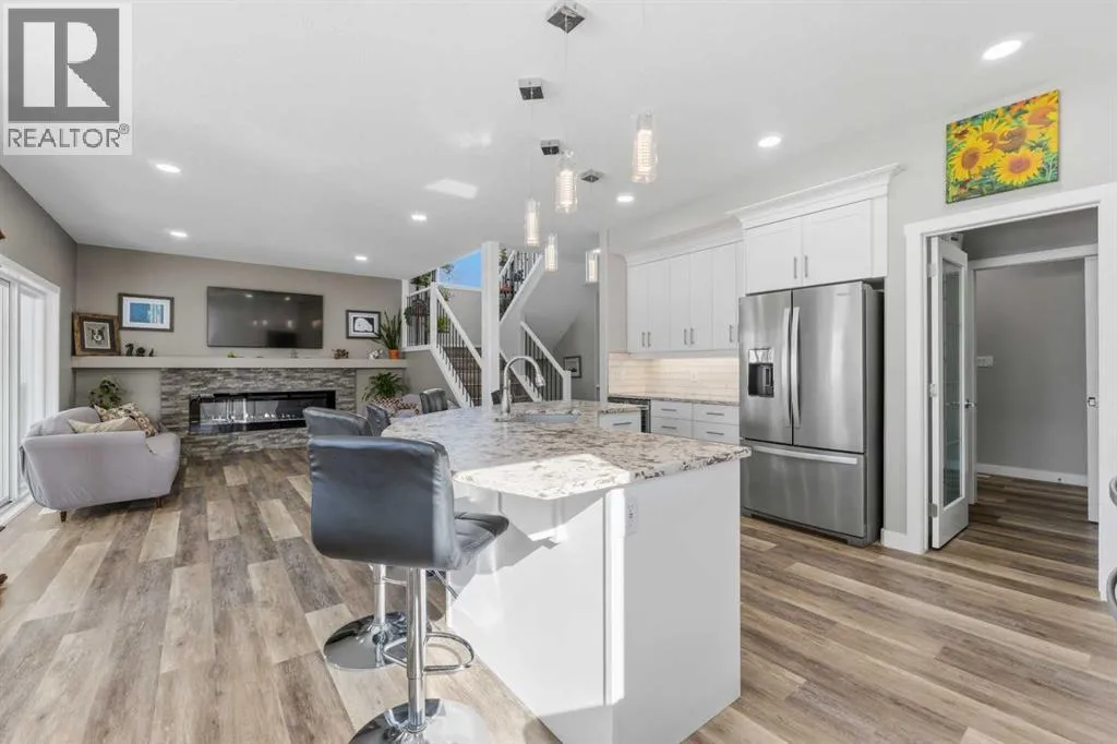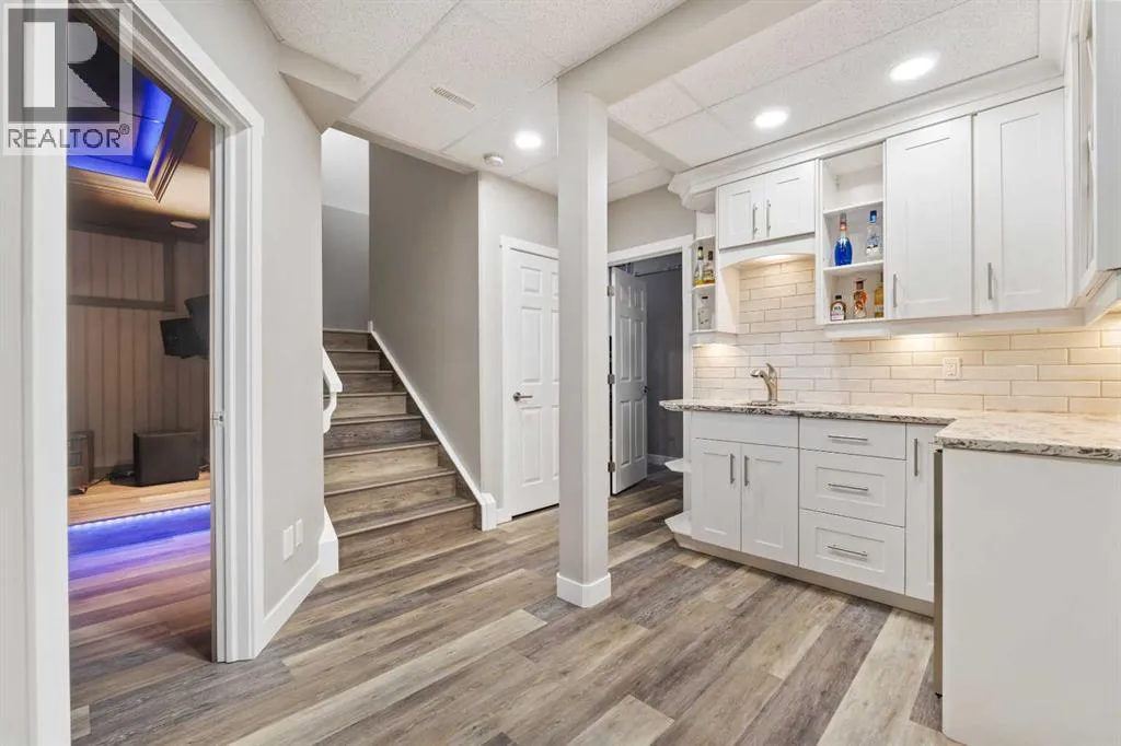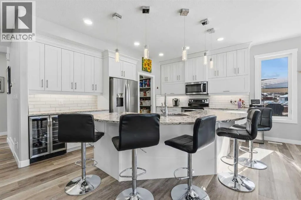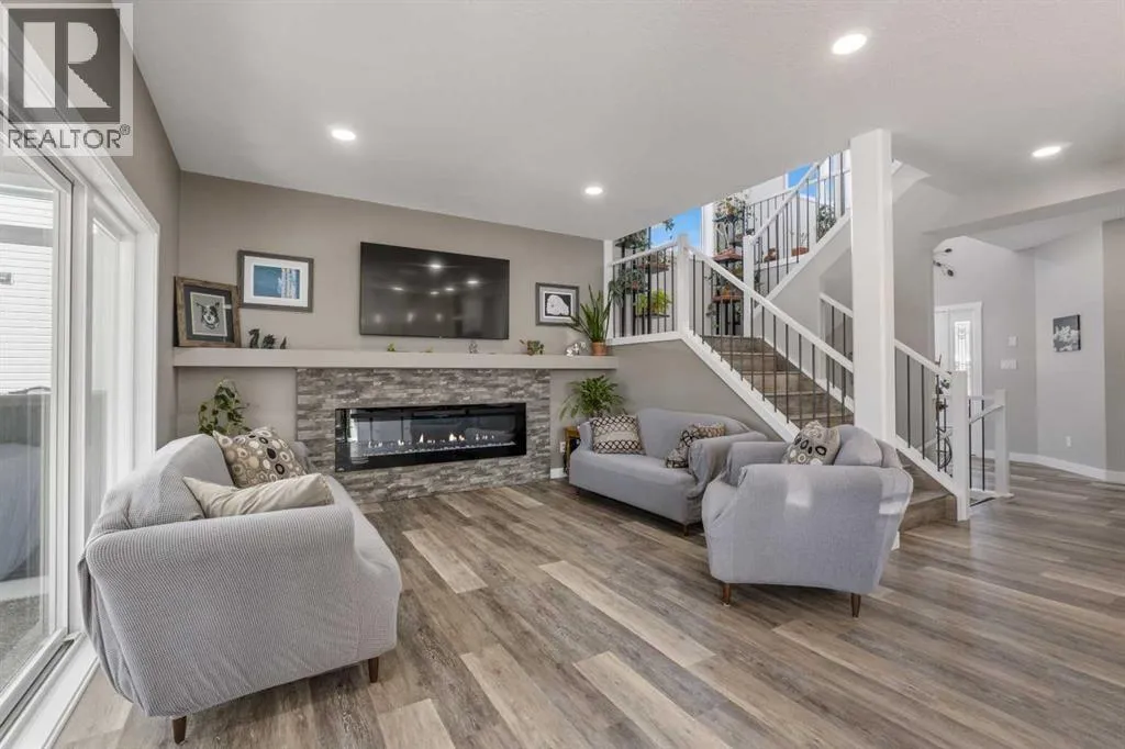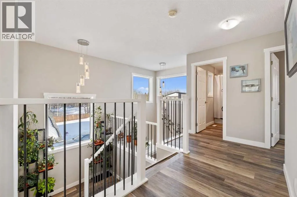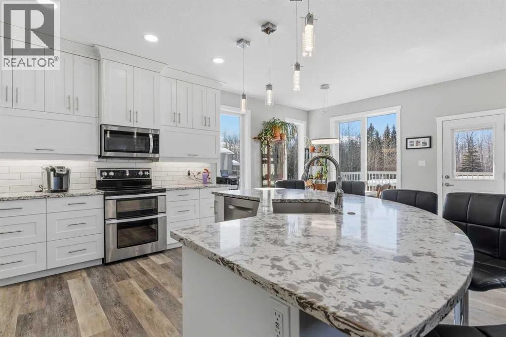 Custom home is situated in a quiet cul-de-sac backing onto green space, offering direct access to paved trails leading to the Athabasca River or Festival Park. The exterior features a wide aggregate driveway to a massive 1,068 sq. ft. triple-car garage with 11-foot ceilings, an overhead heater, hot and cold taps, a dedicated dog wash, EV charging, and a convenient drive-thru bay to the backyard. Inside, the main floor greets you with a soaring entryway looking up to the second level, 9-foot ceilings throughout, and a smart second entrance from the garage to hide clutter from guests. The gourmet kitchen is a standout with quartz countertops, a walk-through pantry, upgraded ceiling-height cabinets, a bar fridge, and an electric stove with a double oven, all centered around a large island that seats five (or more) comfortably. This space flows into a bright dining area with south and west-facing windows for evening sun, and a living room with an electric fireplace that opens to a fully enclosed, insulated 3-season room featuring a natural gas line and a commercial-grade hood fan for year-round indoor grilling. Upstairs, extra-wide stairs facilitate easy furniture movement and lead to three bedrooms and a convenient laundry room. The primary suite has soundproofing in the floor, wall, and door for total quiet, and windows overlooking your backyard. A 5-piece ensuite with two sinks, triple shower heads and a 15-foot walk-through closet that leads directly into the laundry room. The fully finished basement adds a fourth bedroom with a walk-in closet, a wet bar with a matching bar fridge, and a fully soundproofed theatre room with two hidden windows already installed for an easy conversion to a 5th bedroom if needed. The home also includes the convenience of a built-in central vacuum system with a quick-sweep plate in the kitchen for effortless cleanup, along with a large, finished storage area tucked under the stairs featuring matching flooring and trim. Every inch of thi s home is built for efficiency and comfort, featuring fire- and hail-resistant Hardie Board on an ICF block foundation, a dual-zone high-efficiency furnace for separate temperature control on each level, a 60-gallon hot water tank, and a Black Box electrical system that intelligently manages power between your EV charger and appliances. Hot and cold taps front and back outside are such little examples of the upgrades this home holds. This residence is a masterpiece! (id:27476)
