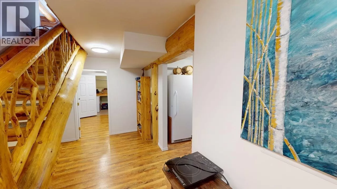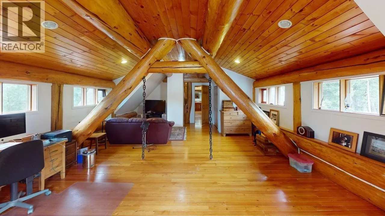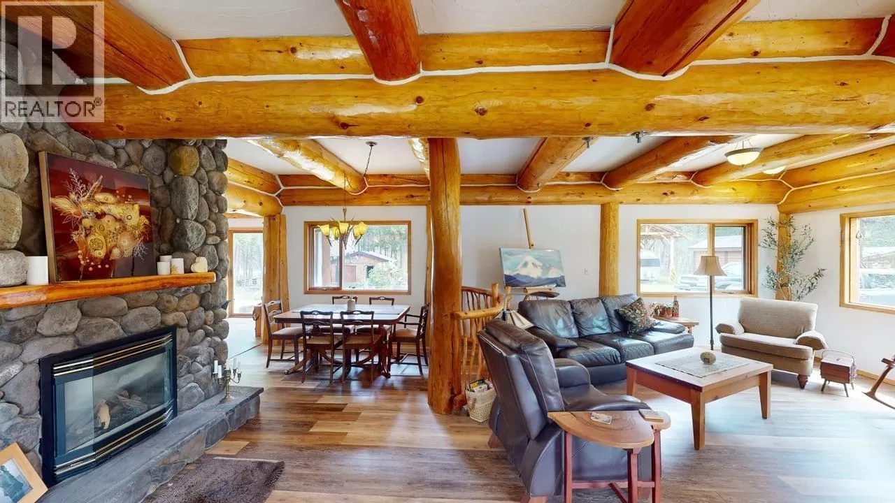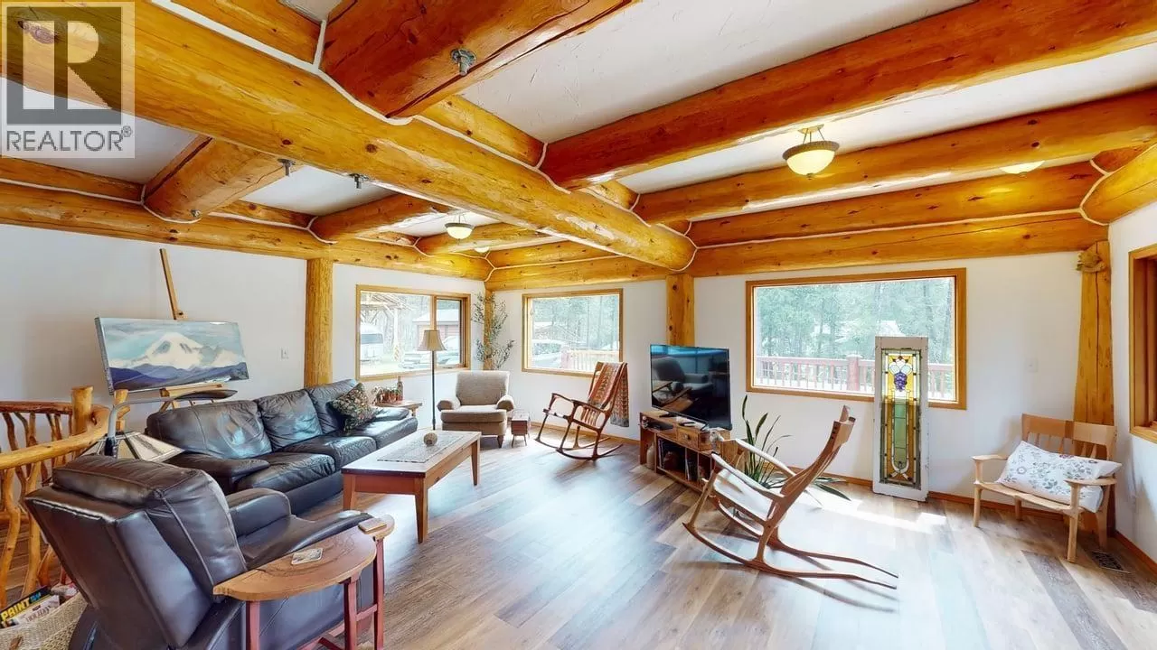 This one-of-a-kind Tudor-style post & beam home blends log & conventional construction w. exceptional craftsmanship throughout. The impressive 2-storey layout w. full walkout bsmt features 3 bdrms, 3 baths, & 11â ceilings on the main. Oversized logs, large windows, & a stunning river rock gas f/p create a warm, light-filled living space. The spacious kitchen w. new high-end appliances is ideal for entertaining. Upstairs, a large family rm showcases unique log & engineering details. The bsmt offers suite potential, a toy garage, & ample storage. Set on a private 1.29-ac lot backing onto Crown Land with direct access to endless trails leading into the Cariboo backcountry. A 24' x 36' woodworking shop perfect for the handy person plus a 12' x 40' RV pole shed. Just a short walk to Horse Lake! (id:27476)