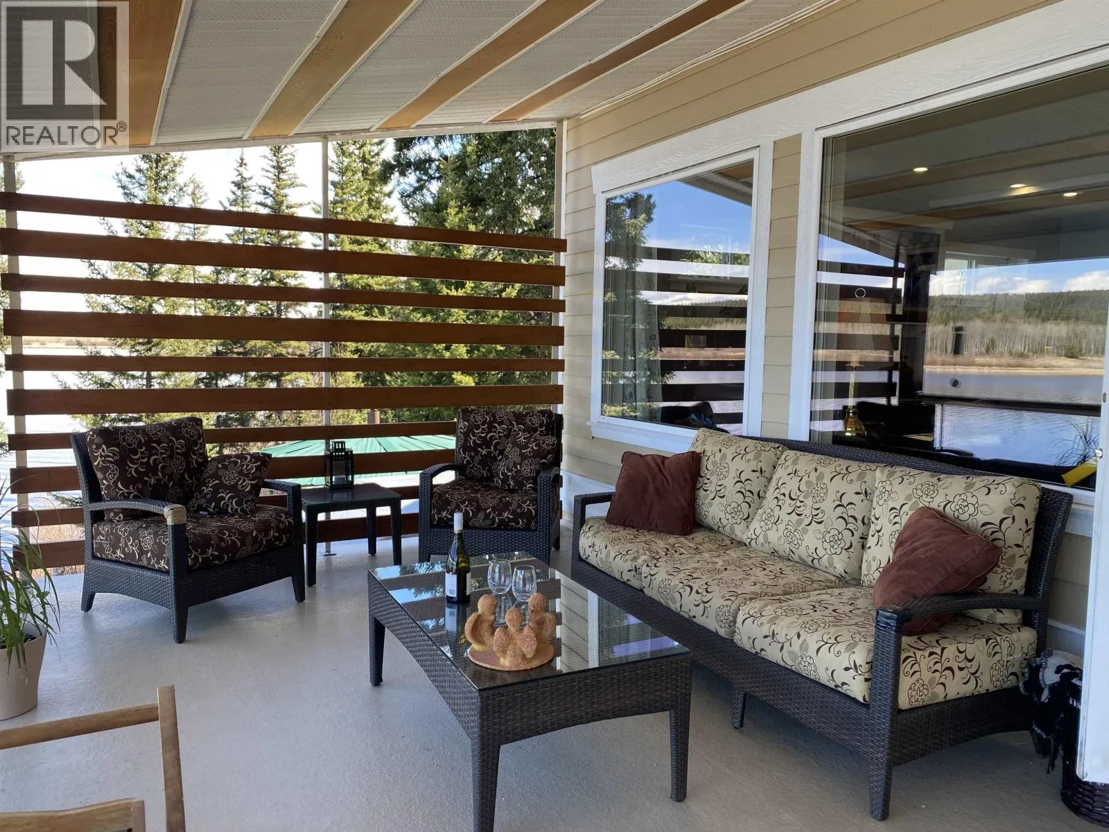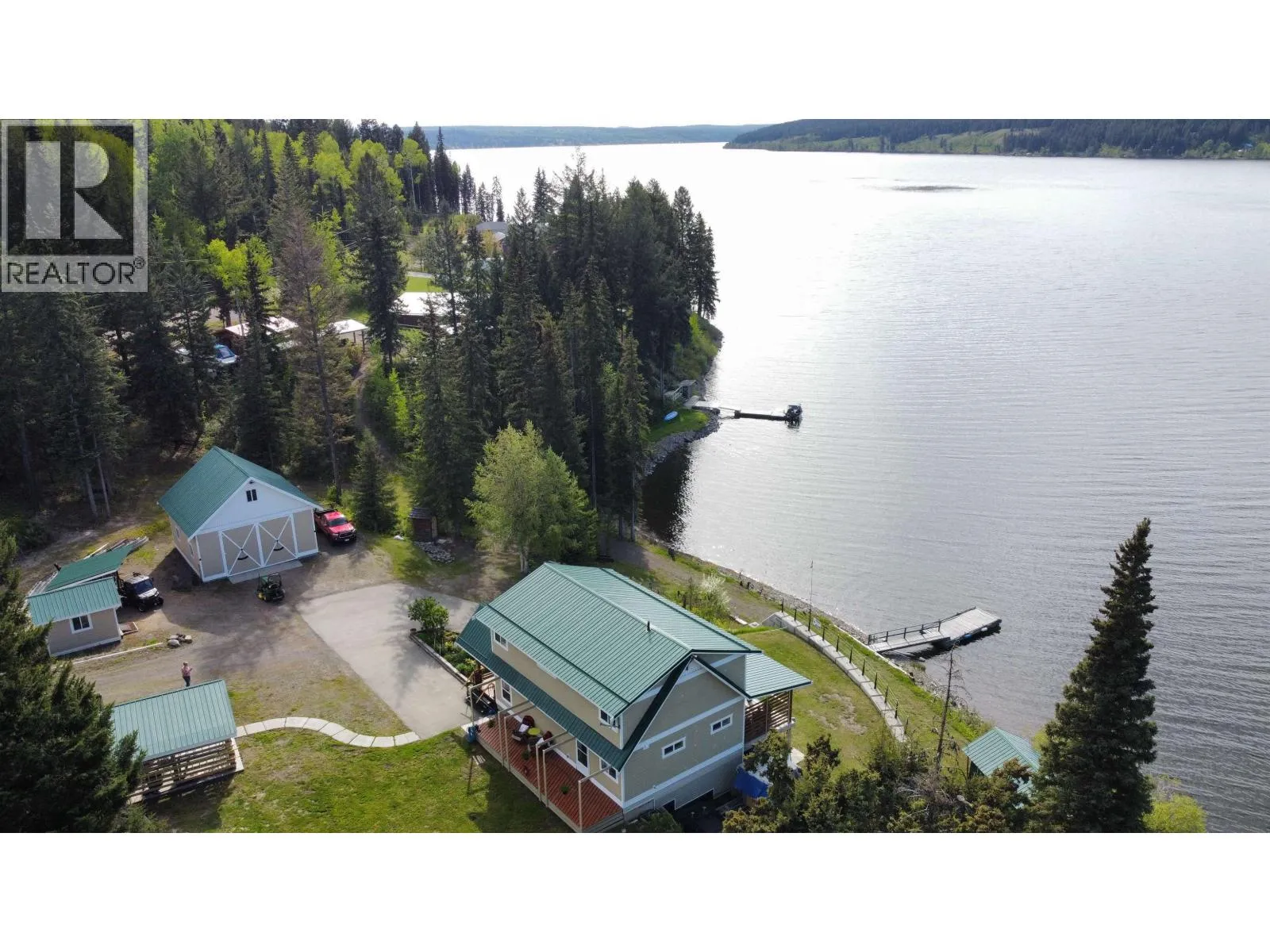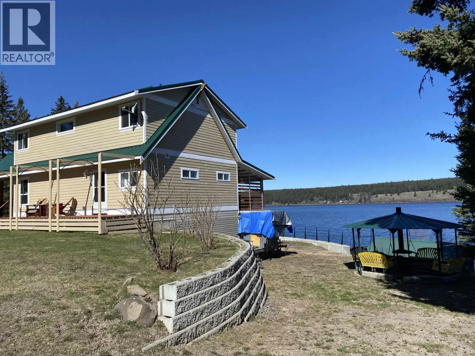 * PREC - Personal Real Estate Corporation. Built in 2016, this stunning 2,500+ sq.ft. home rests on 1.04 acres with 274 ft of pristine waterfront on the quiet south shores of Horse Lake. Designed for comfort and light, the open-concept main floor features large windows framing panoramic lake views and glorious sunsets. Step onto the covered deck to soak in the tranquility and watch wildlife drift by. The upper level offers 3 spacious bedrooms and 2 bathrooms, while the walkout basement includes laundry, office, and hobby space. A 26â x 26â detached garage/shop, boathouse, garden shed, and wood storage complete the package. Heated with an efficient wood or propane-fired outdoor boiler, this property blends year-round comfort with the beauty of lakeside livingâjust 15 minutes from 100 Mile House. (id:27476)