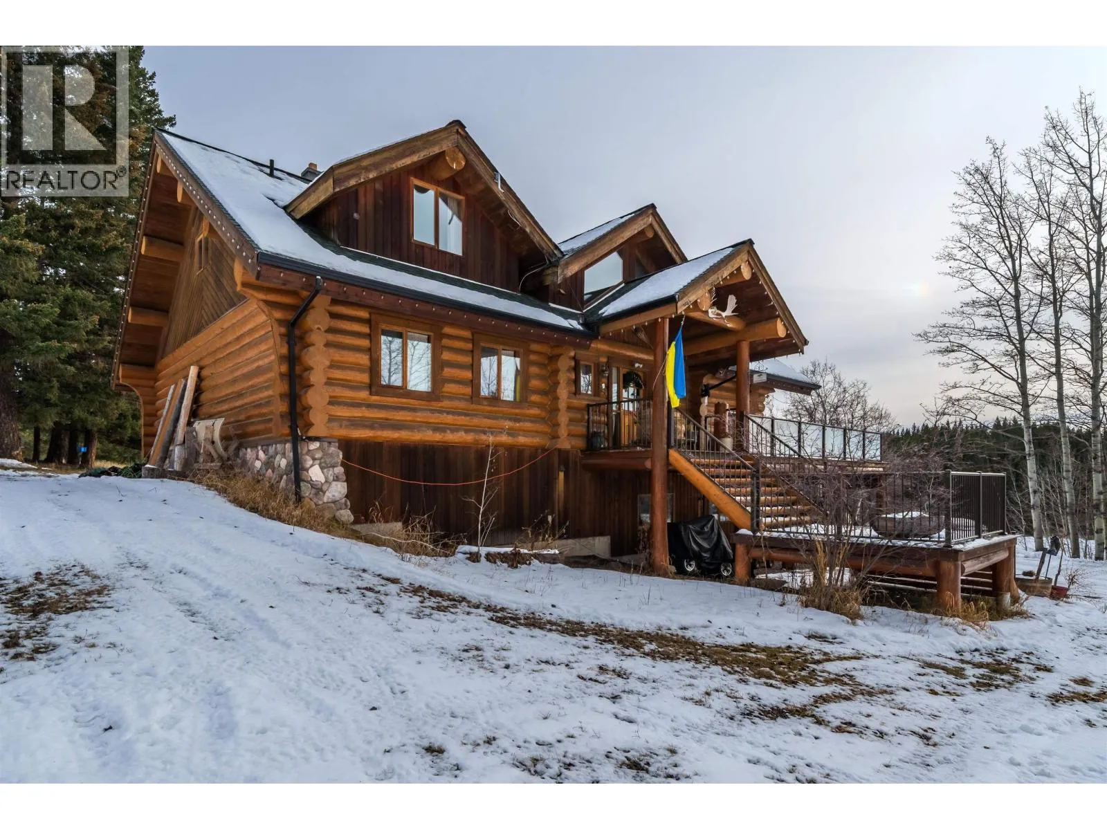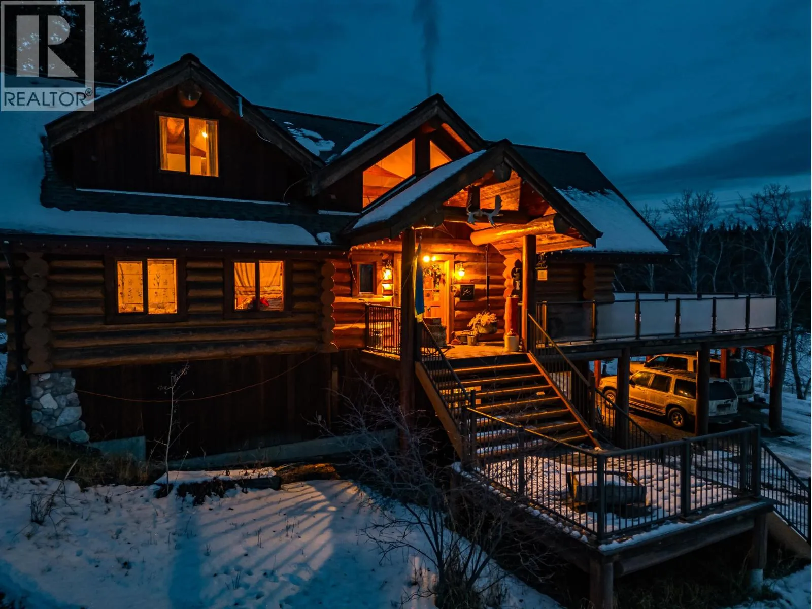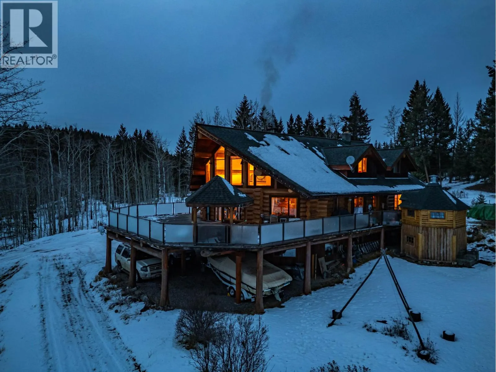 Luxury 4,700 sq ft log home on 1.49 acres overlooking Hall Lake. Vaulted ceilings on the main level with large windows and patio doors out to expansive deck. 3 bedrooms with ensuite bathrooms. The primary suite has a walk-in closet, sauna & 6-piece bathroom. The upper level hosts a den, sitting area & 2 bedrooms with bathrooms that have their own hot water tank. Basement has an office with 2-pc bthrm, storage room, wood & utility rooms. The basement entry from the generous covered parking area opens into a large flex space as well as an alley kitchen and workshop. Outbuildings include a gazebo, 2-level European Smokehouse with garden shed, Sea Can and 2 coveralls for additional storage. The acreage is fenced and in a quiet area just minutes from 100 Mile House. Spacious family home or B&B. (id:27476)