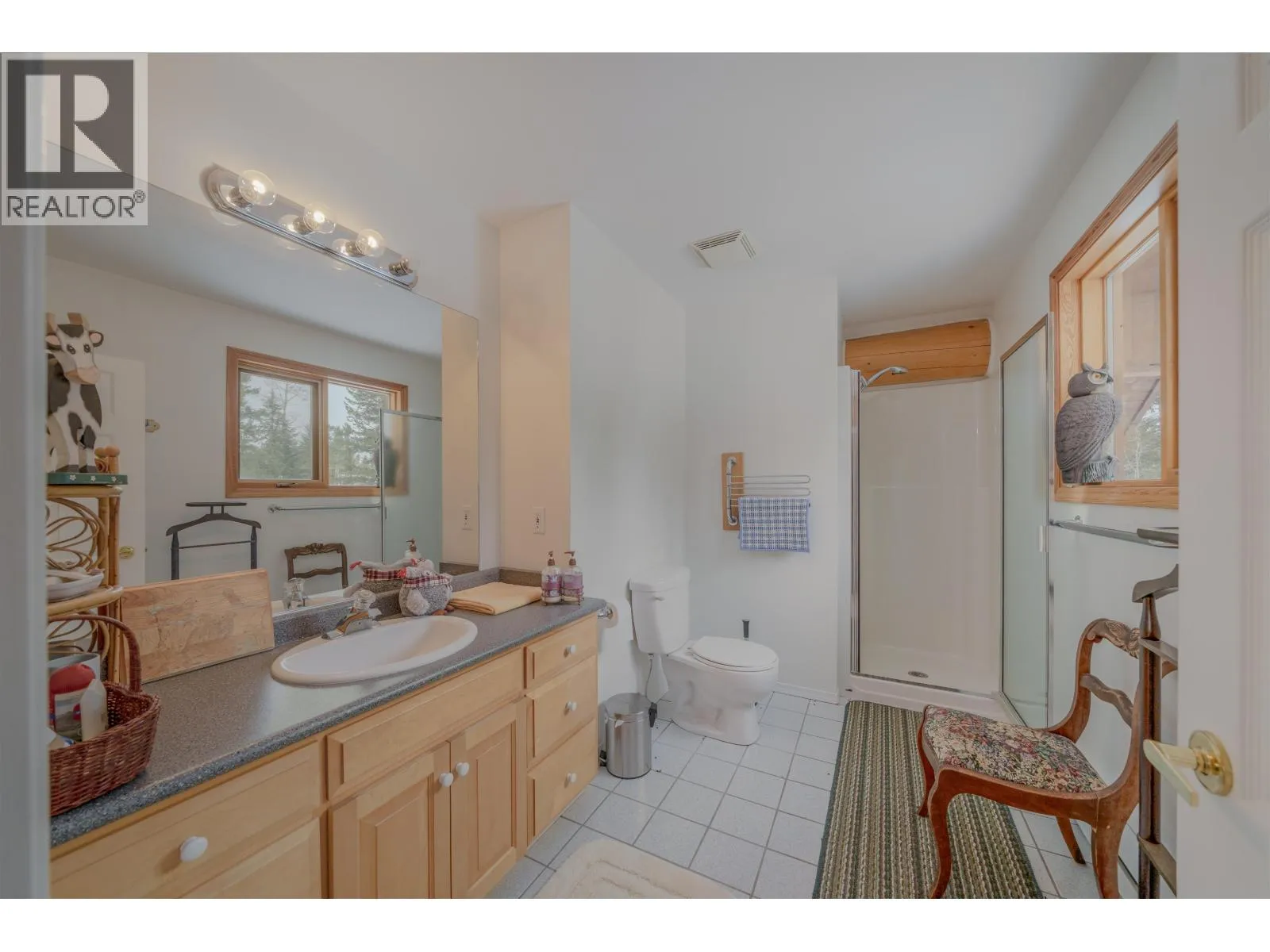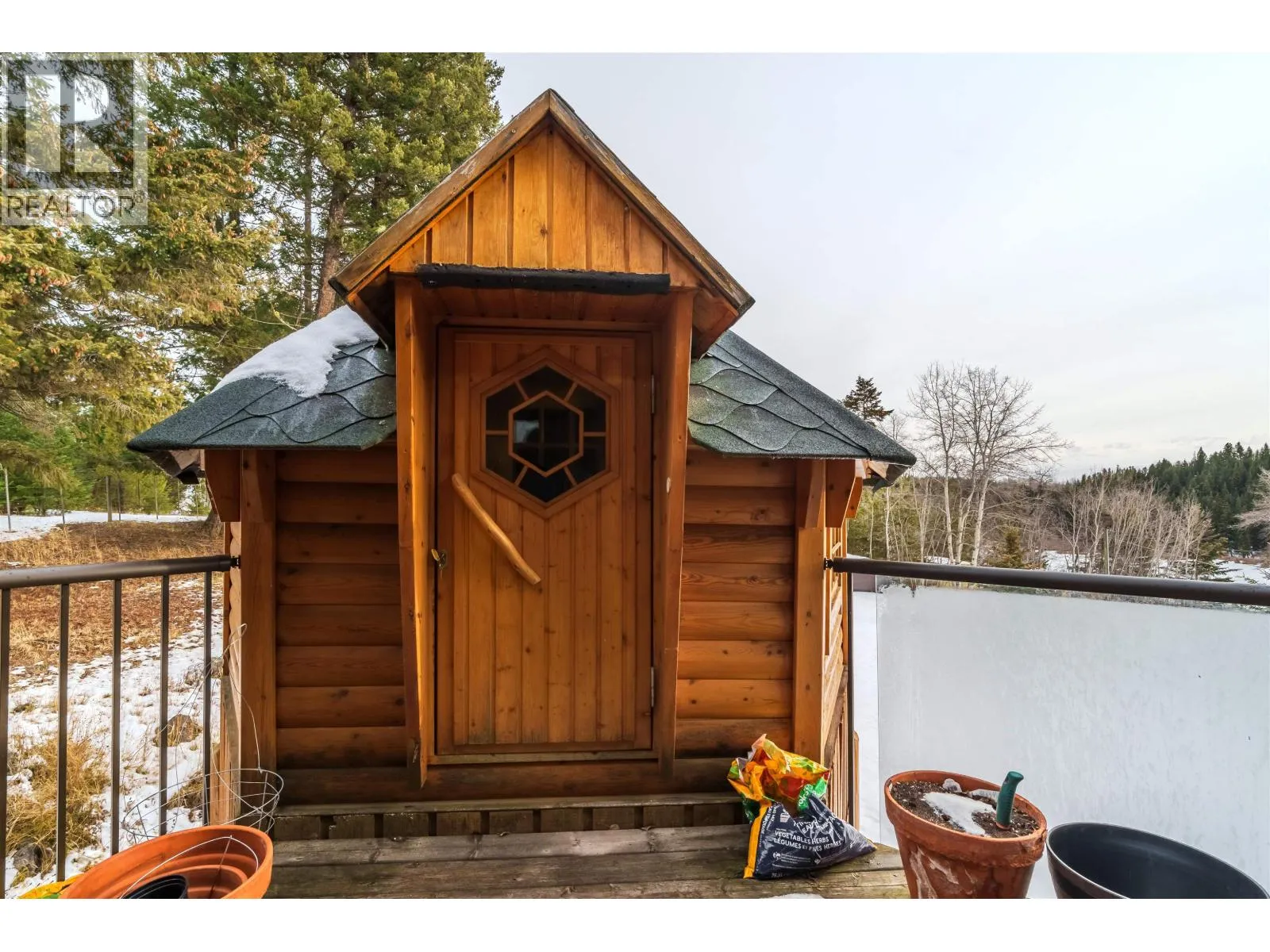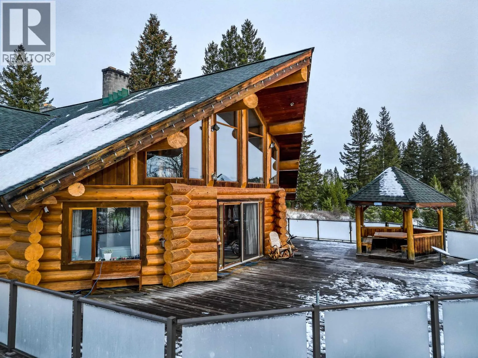Luxury 4,700 sq ft log home on 1.49 acres overlooking Hall Lake. Vaulted ceilings on the main level with large windows and patio doors out to expansive deck. 3 bedrooms with ensuite bathrooms. The primary suite has a walk-in closet, sauna & 6-piece bathroom. The upper level hosts a den, sitting area & 2 bedrooms with bathrooms that have their own hot water tank. Basement has an office with 2-pc bthrm, storage room, wood & utility rooms. The basement entry from the generous covered parking area opens into a large flex space as well as an alley kitchen and workshop. Outbuildings include a gazebo, 2-level European Smokehouse with garden shed, Sea Can and 2 coveralls for additional storage. The acreage is fenced and in a quiet area just minutes from 100 Mile House. Spacious family home or B&B. (id:27476)
