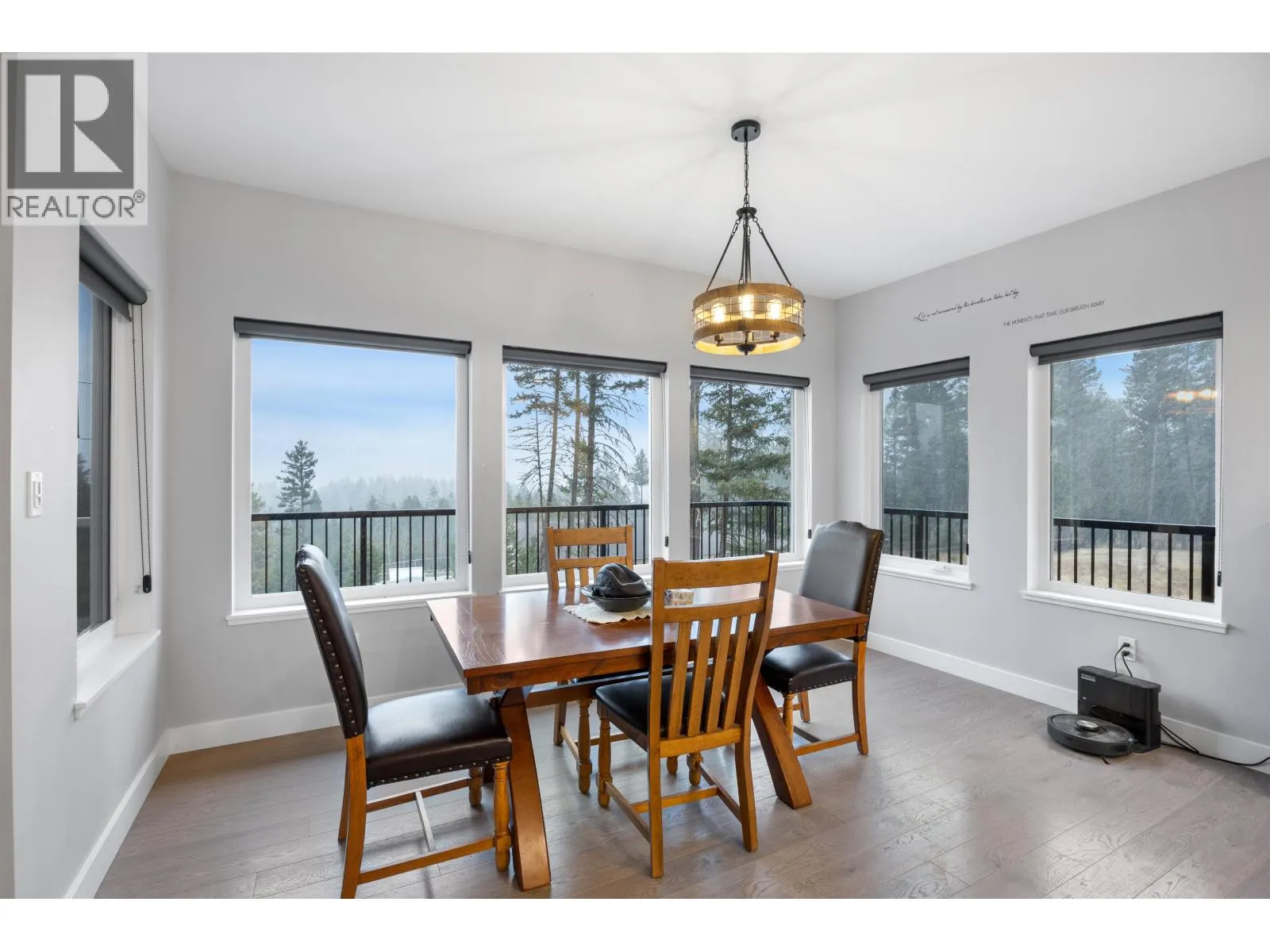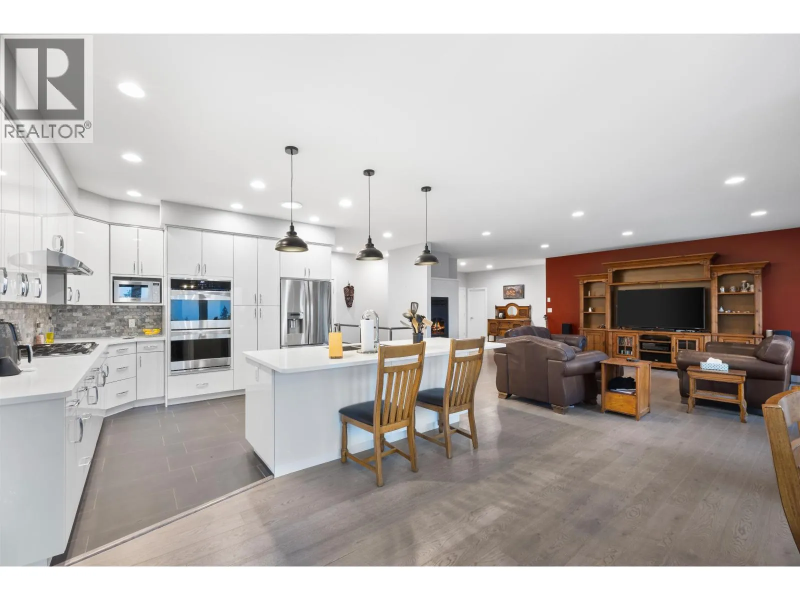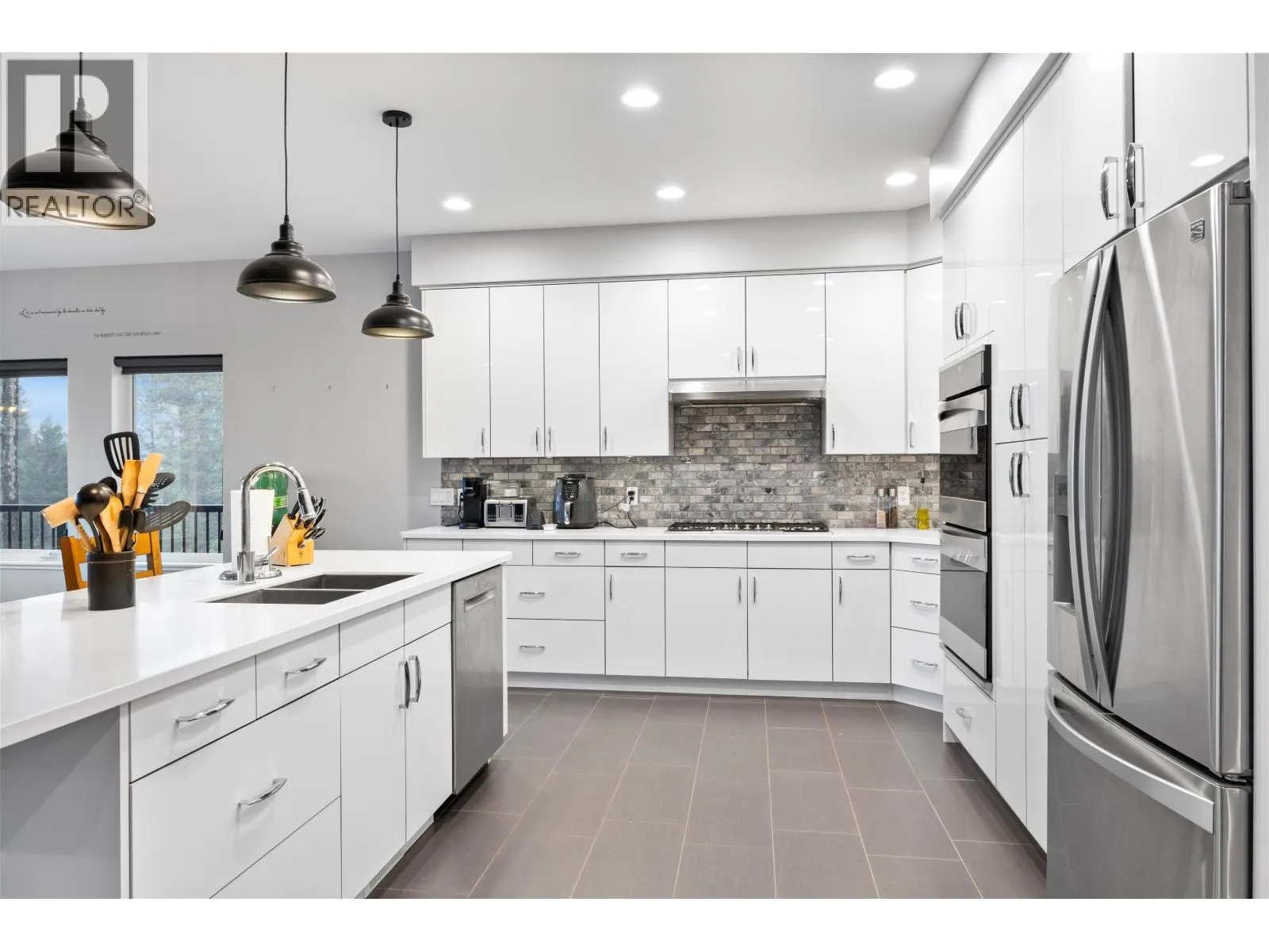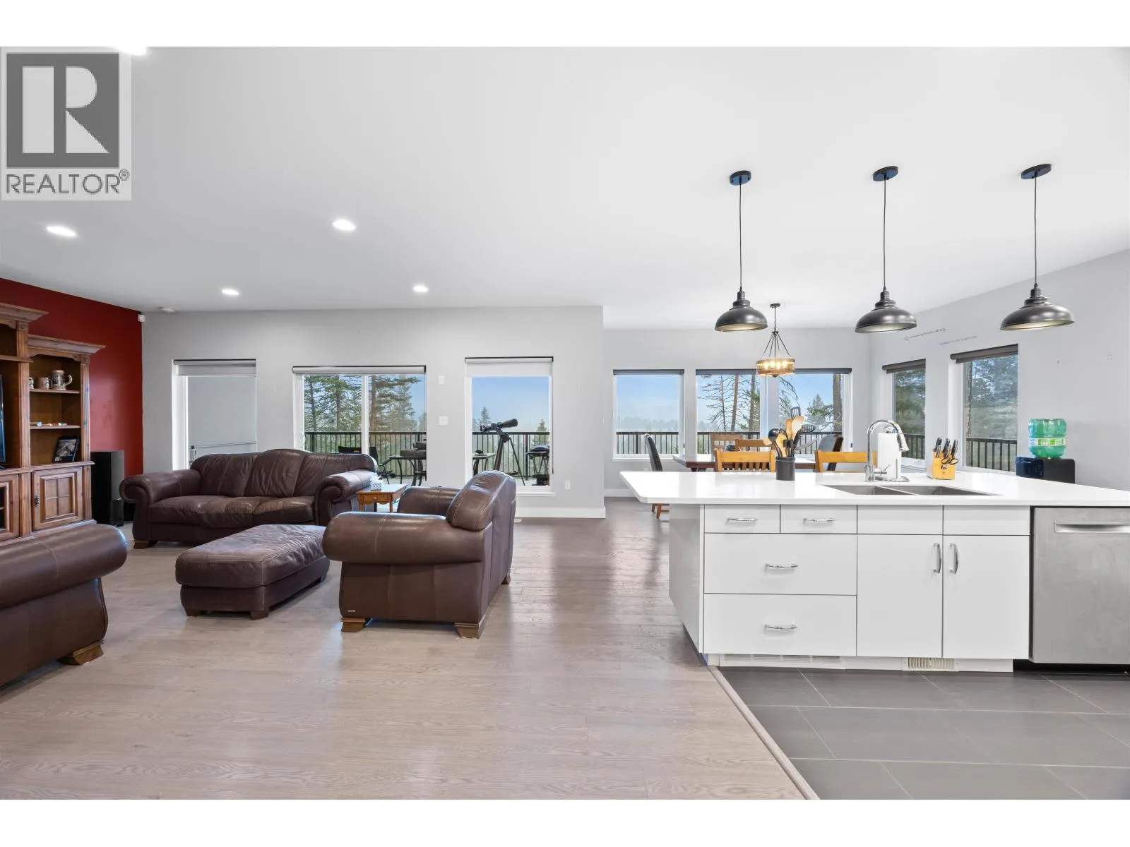 Welcome to our contemporary walk-out rancher in the peaceful community of 108 Mile Ranch. This 4-bedroom, 4-bath home combines comfort, elegance, and functionality with a bright, open layout ideal for relaxing or entertaining. The sunlit living area features an airtight wood-burning fireplace, while the gourmet kitchen offers a large island, dual ovens, 36â gas cooktop, and abundant cabinetry. The main-floor primary suite includes a 5-piece ensuite and walk-out closet. The lower level provides three additional bedrooms, two baths, a spacious rec room, and storage. Outside, enjoy landscaped grounds, serene outdoor spaces, and captivating views. Thoughtful design and quality craftsmanship create a sophisticated lifestyle surrounded by natural beauty. All interior photos are virtually staged. (id:27476)