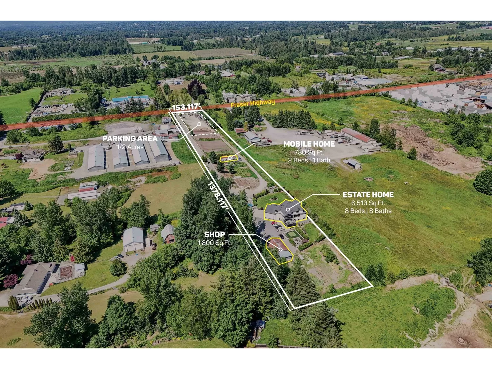 4.79 ACRES WITH 2 HOUSES AND HIGH EXPOSURE! The estate home sits at the rear of the property, offering total privacy along with stunning mountain and valley views. The custom-built 6,513 SQ/FT residence features 8 Bedrooms and 8 Bathrooms, ideal for multigenerational living. Includes 4 Master Bedrooms with en-suites and walk-in closets, plus a spacious legal 2-bedroom suite. A 1,800 SQ/FT Workshop and 0.5 Acre of parking area provide excellent business potential near Fraser Highway, with high traffic and visibility-perfect for an agri-business. The Mobile Home is 780 SQ/FT with 2 Bedrooms and 1 Bathroom. Conveniently located near all amenities with easy access to Fraser Highway, Highway #1, and the USA Border. (id:27476)