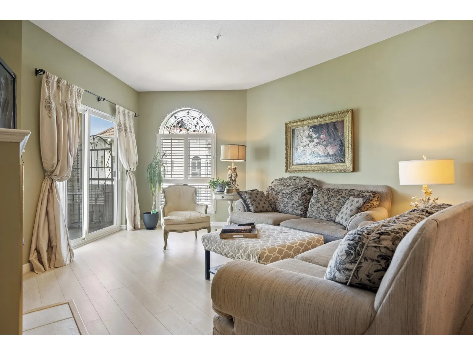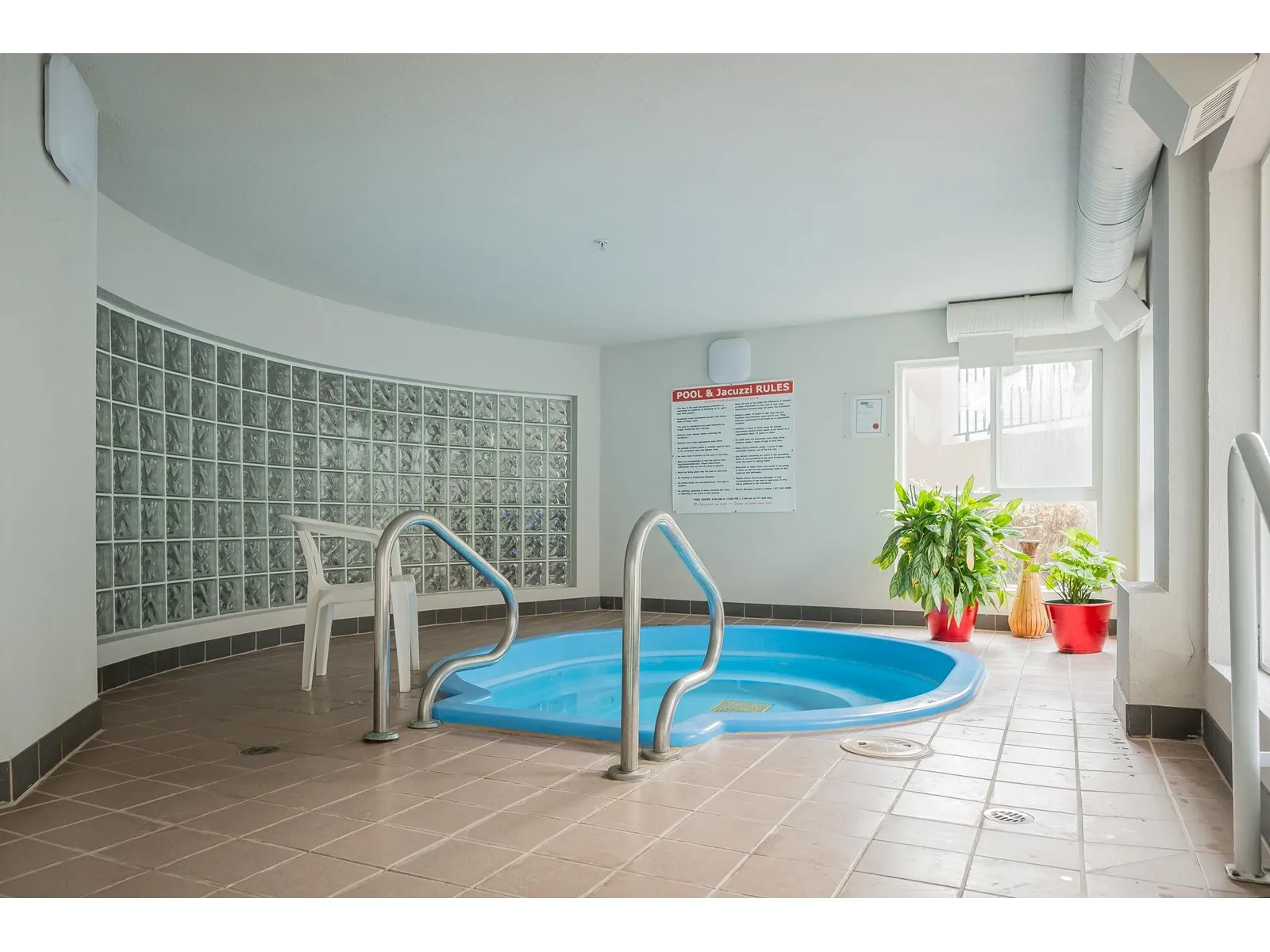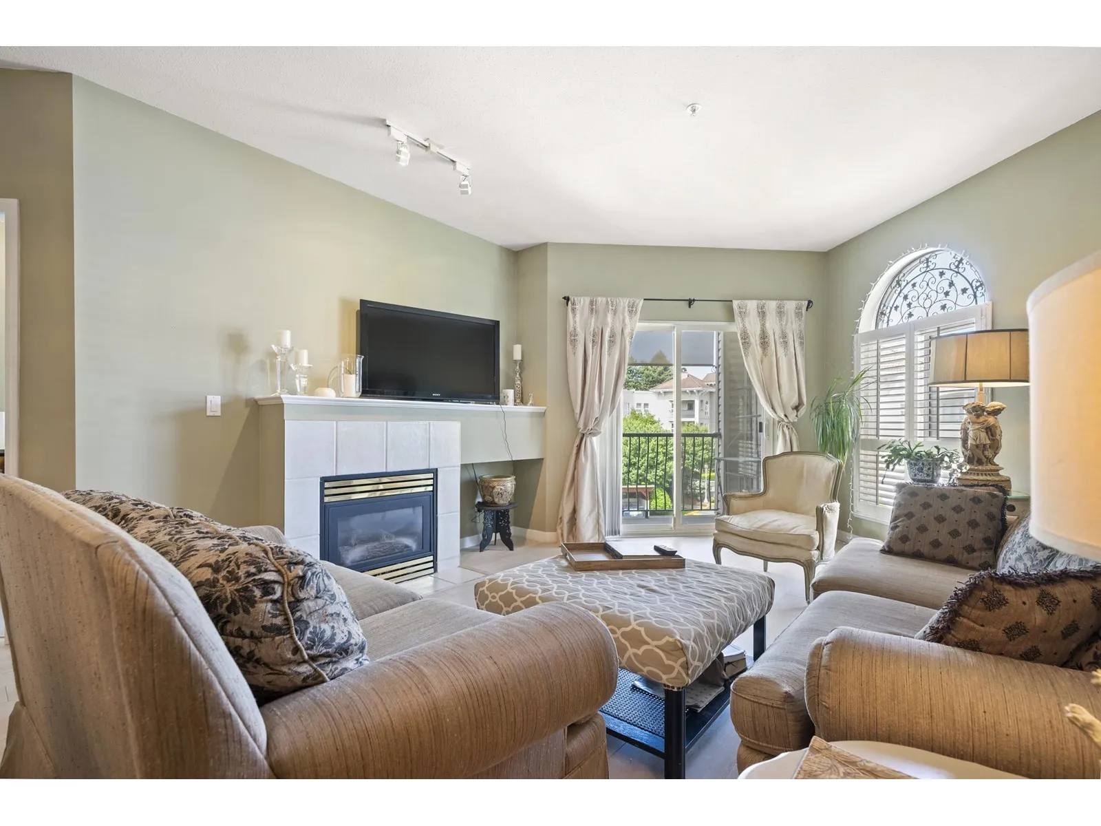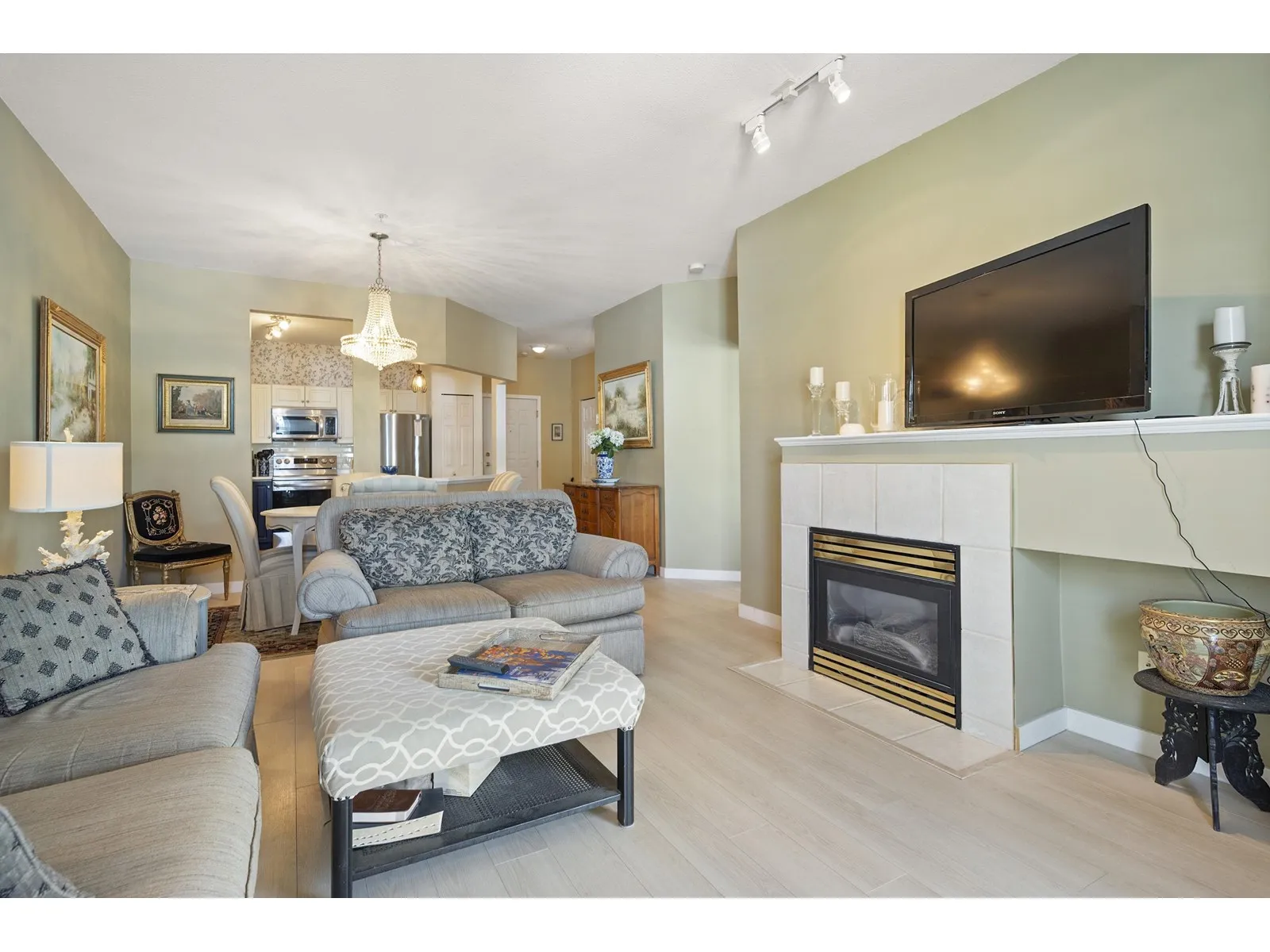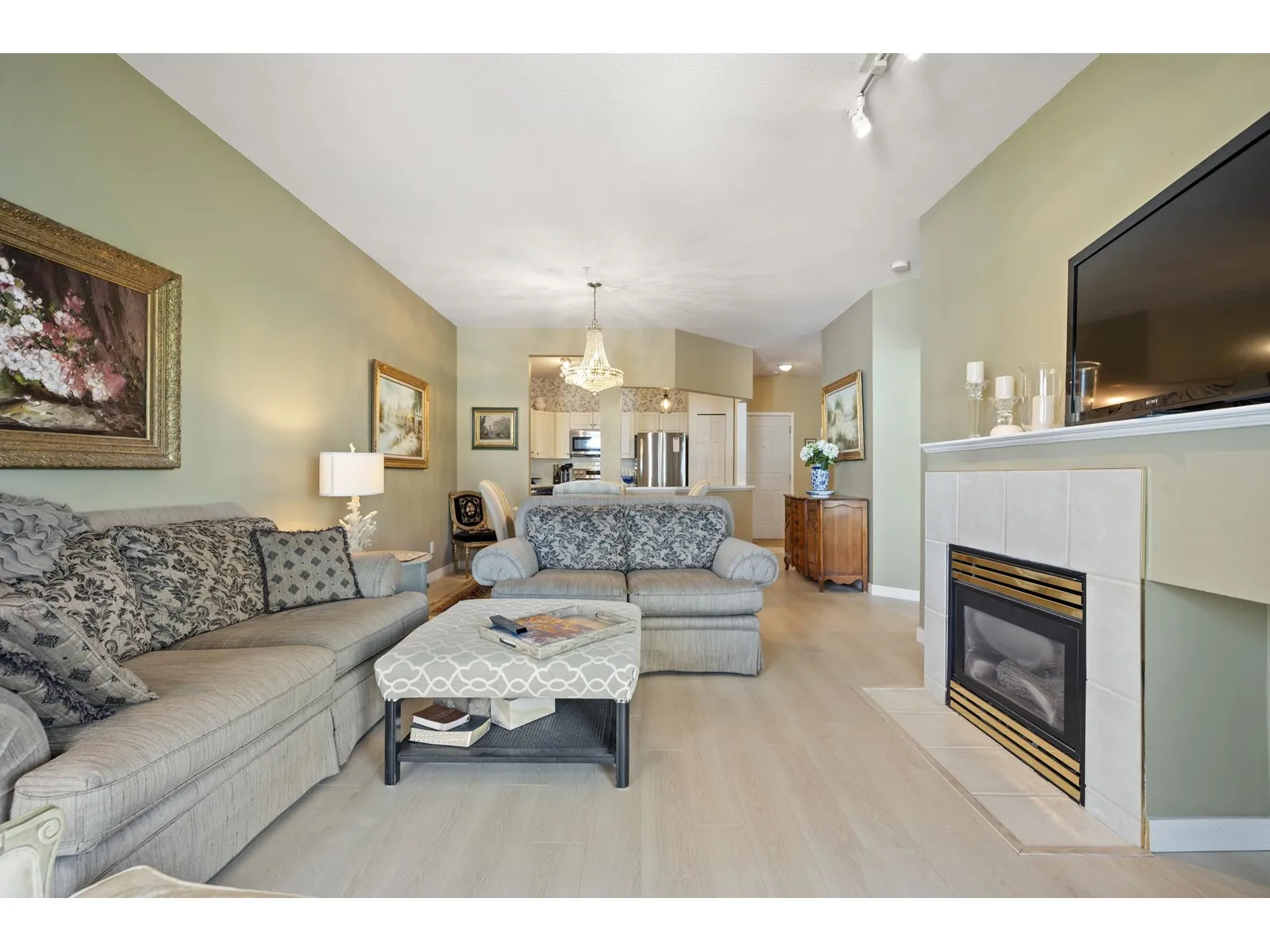 WELCOME HOME to this open floorplan with 9' ceilings! Your 2-bed, 2-bath home is a TOP FLOOR unit featuring laminate flooring, newer stainless steel appliances and beautiful quartz counters in the kitchen which overlooks the dining/living room. Cozy up in front of your gas fireplace or sip coffee from the deck off your living room. This home has a larger primary bedroom, a spacious laundry room, lots of storage and amenities that will wow you! Swimming pool and hot tub, guest suites, workshop, bike storage room, a clubhouse with kitchen, a gym and more. 1 dog permitted. Call today and make this your new home! (id:27476)