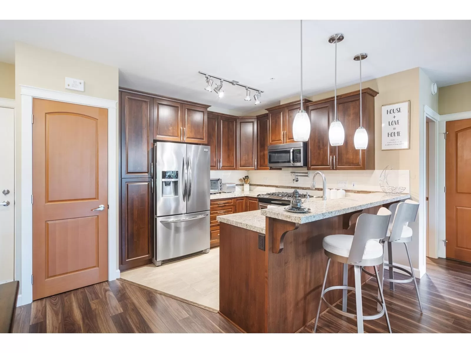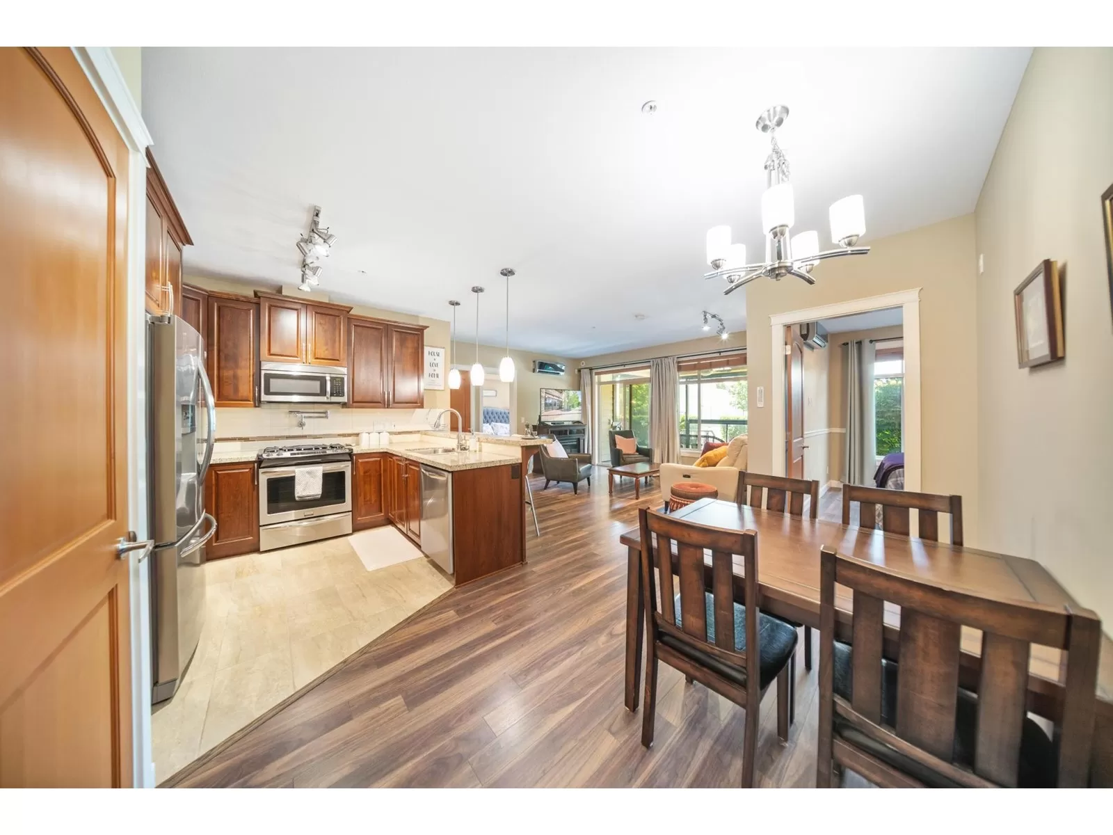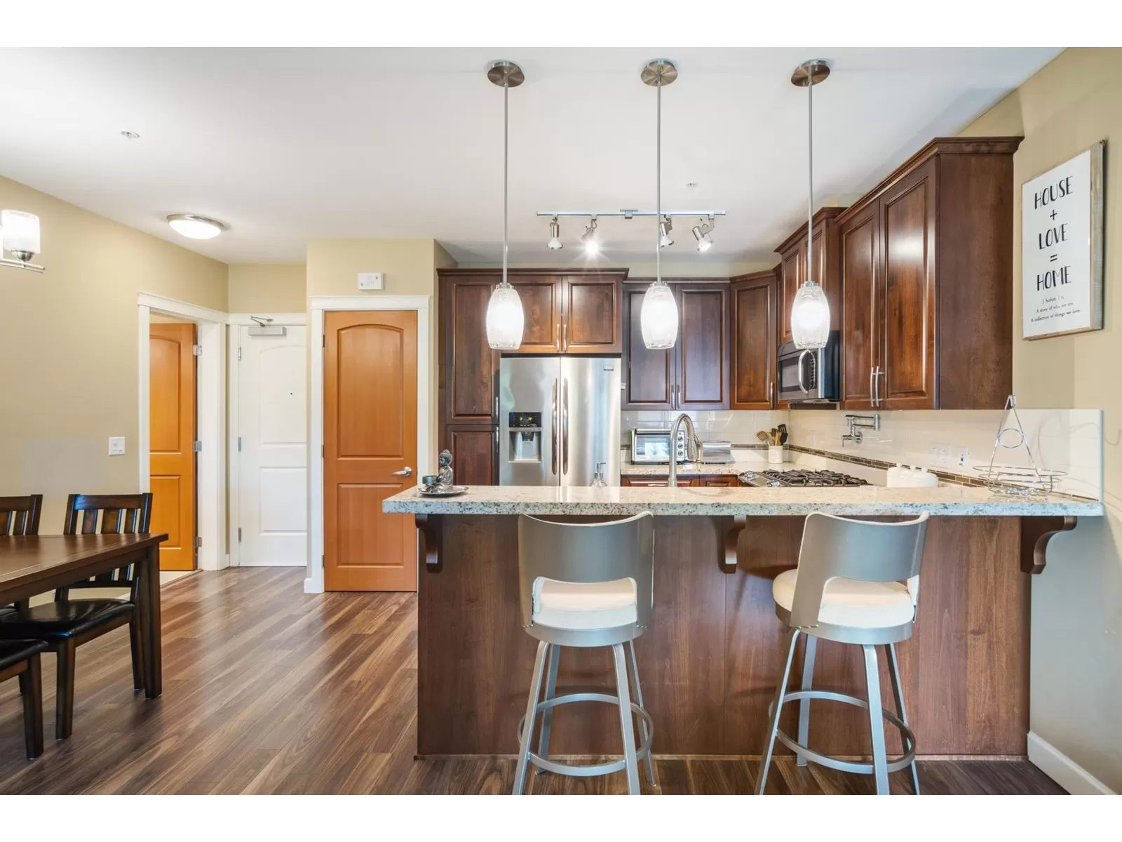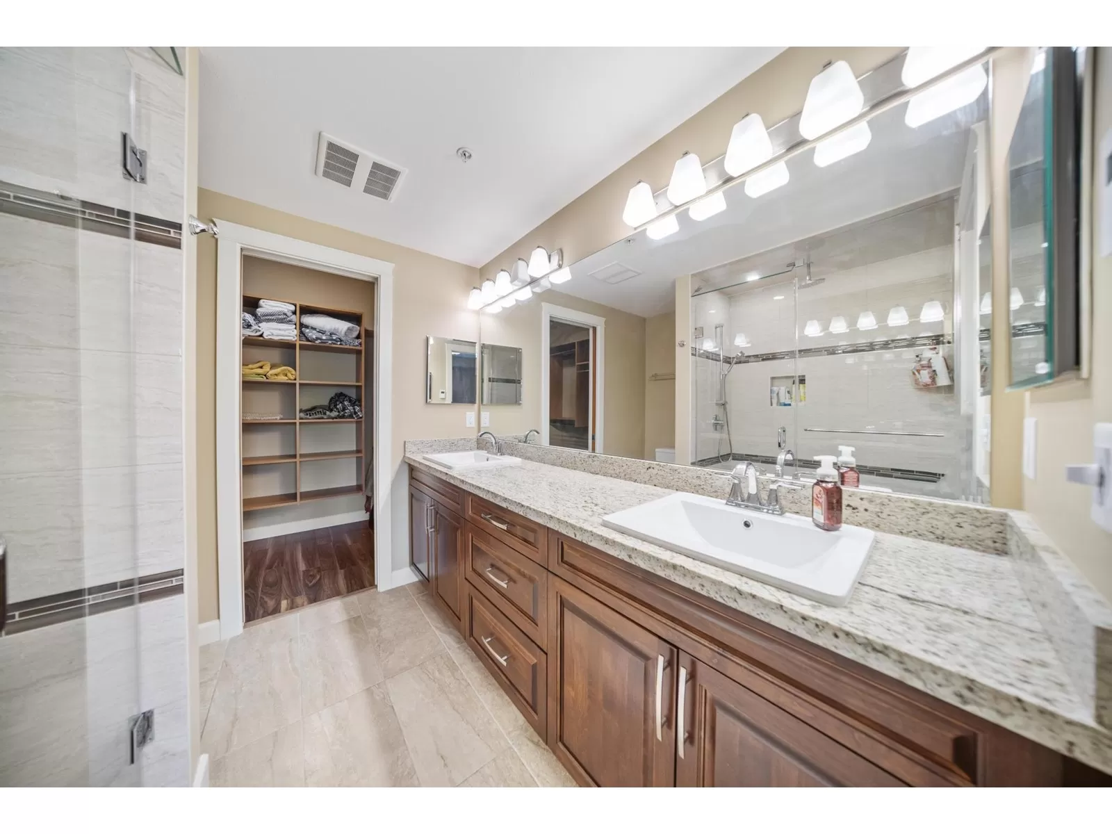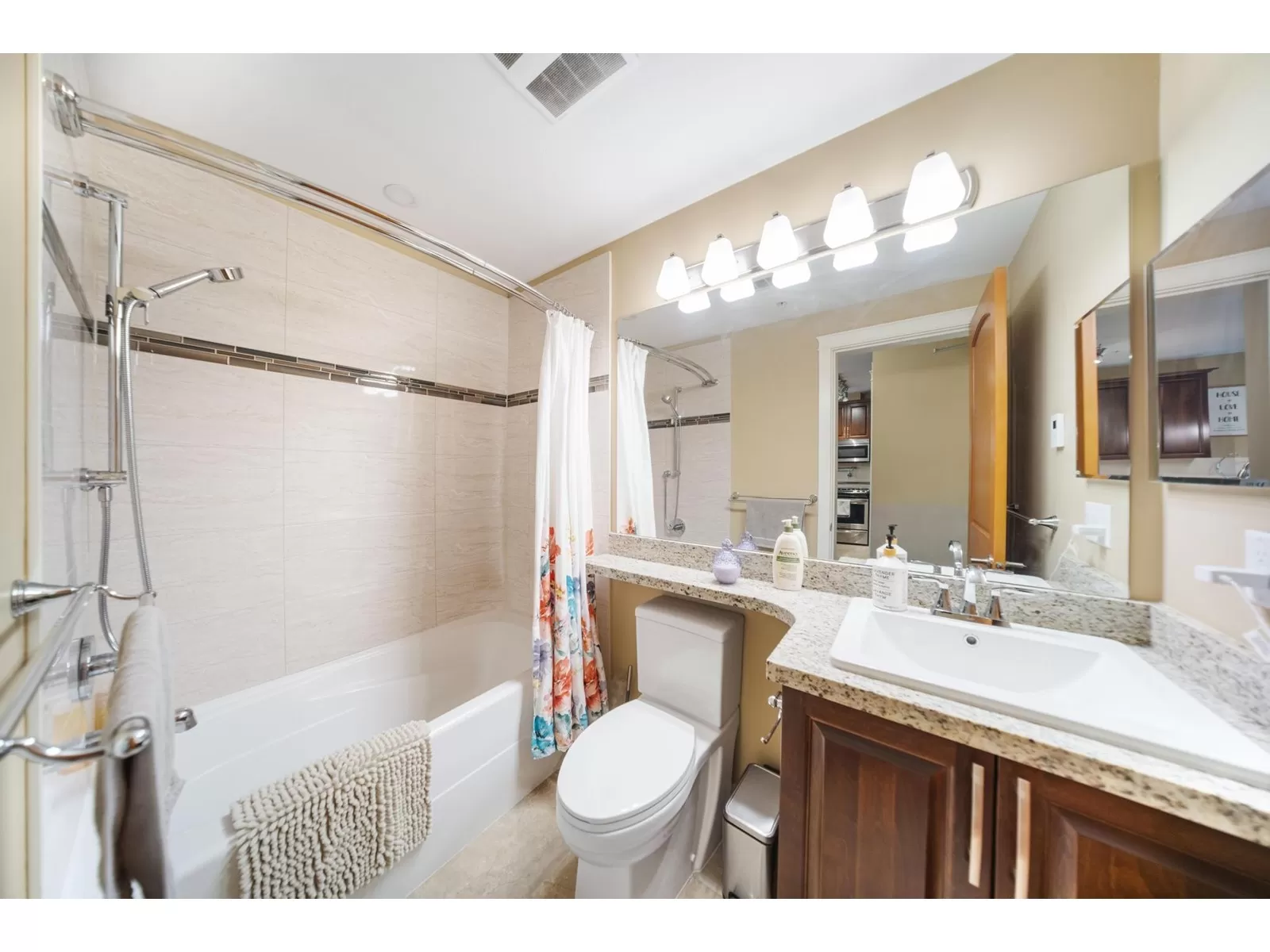 Welcome to this stunning Ground Floor A unit at La Galleria, offering a house-like feel with direct access to the sidewalk. Perfect for dog walks, this 2-bedroom + den, 2-bathroom home features heated floors, fog-free mirrors, and a gourmet kitchen with quartz countertops, ample cabinets, and stainless steel appliances. The spacious master ensuite boasts double sinks and a large shower. Enjoy the solarium, with glass panels that open for fresh air or close for year-round comfort. Includes 2 parking stalls, storage unit, and a prime location near shopping, Lifelabs, police station, library, and recreation center. Your new home awaits! (id:27476)