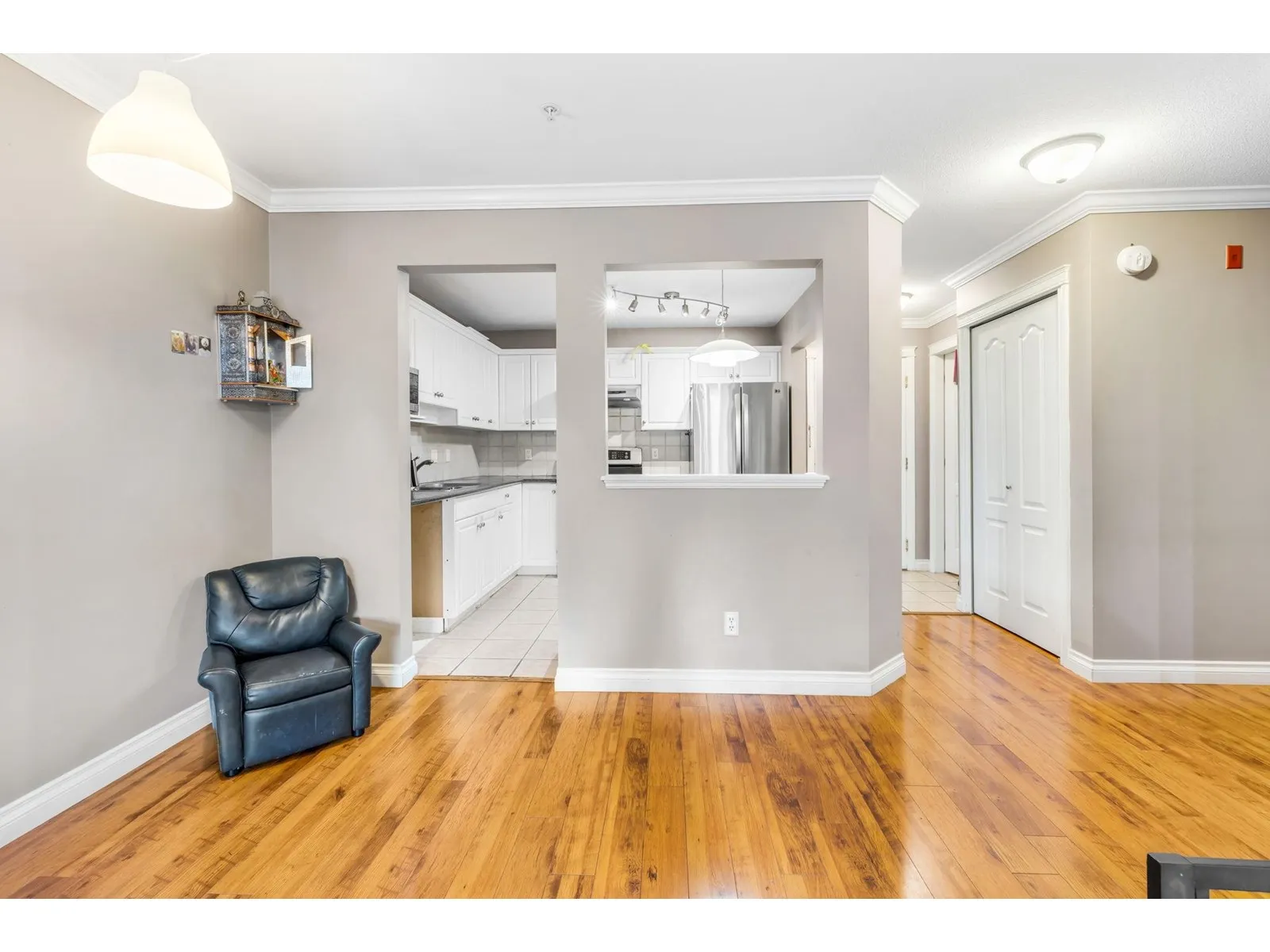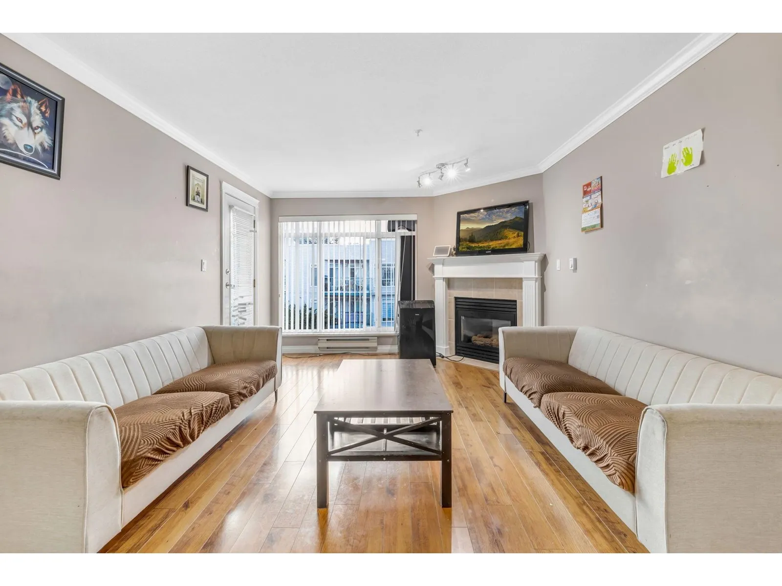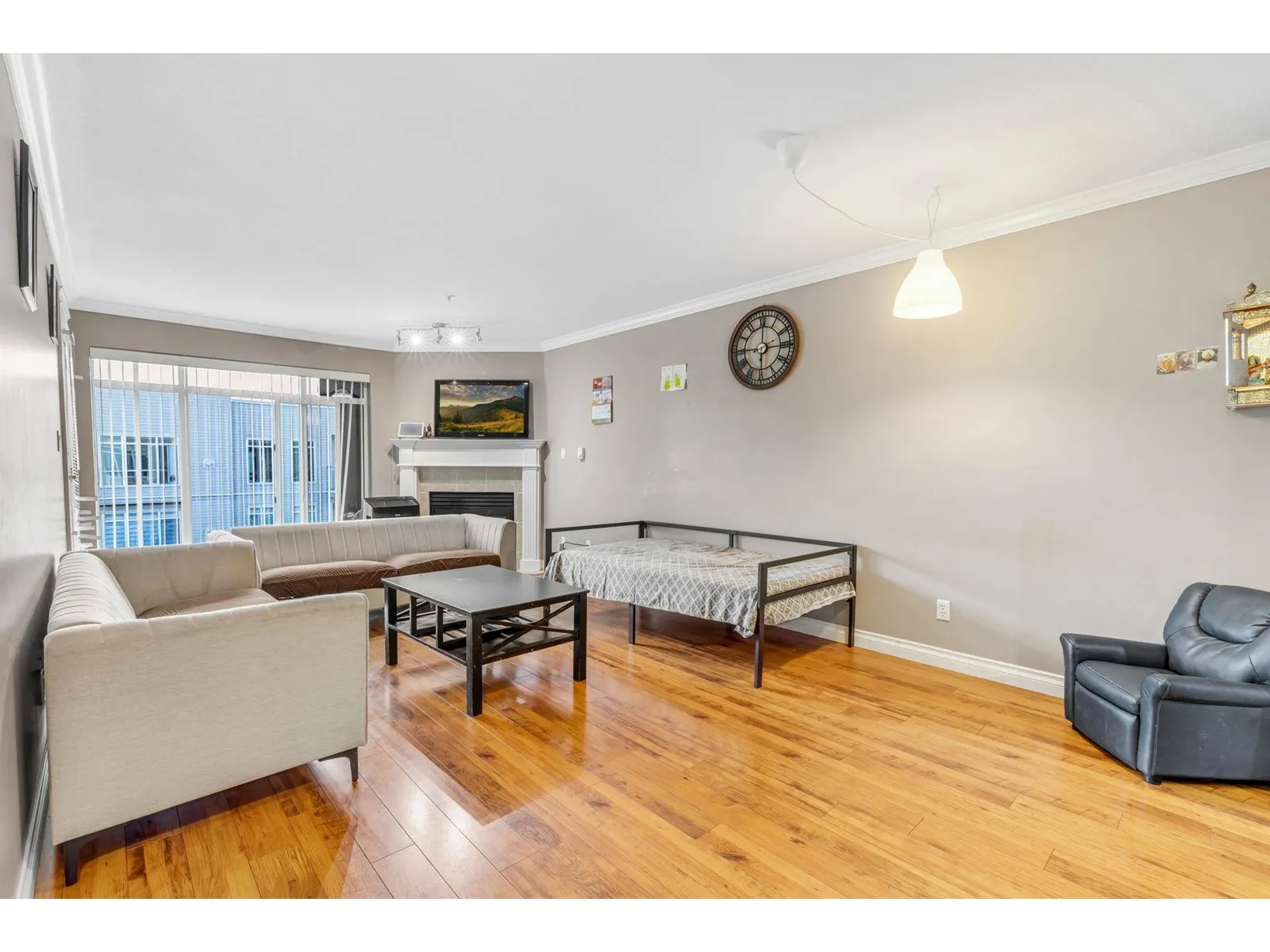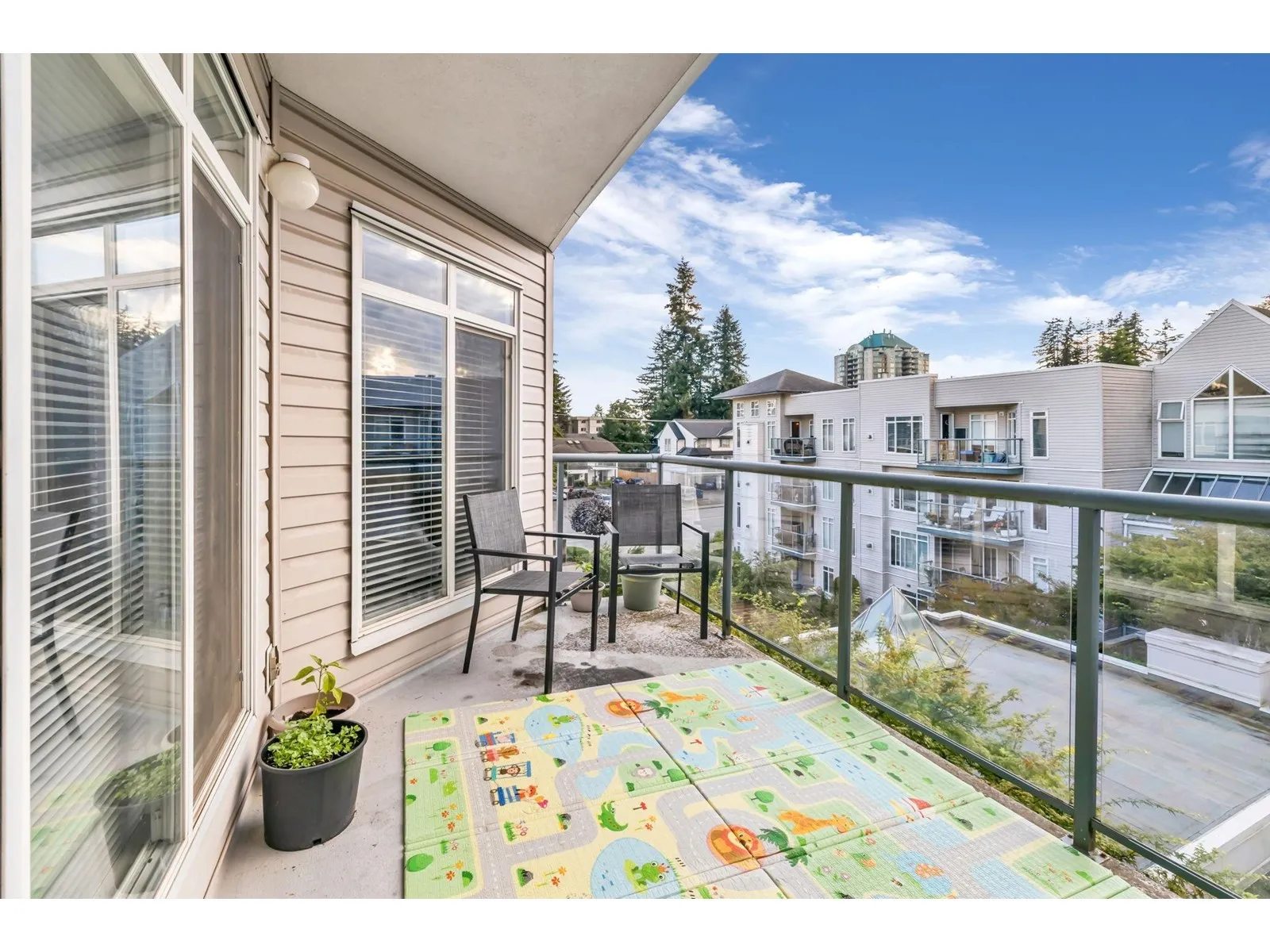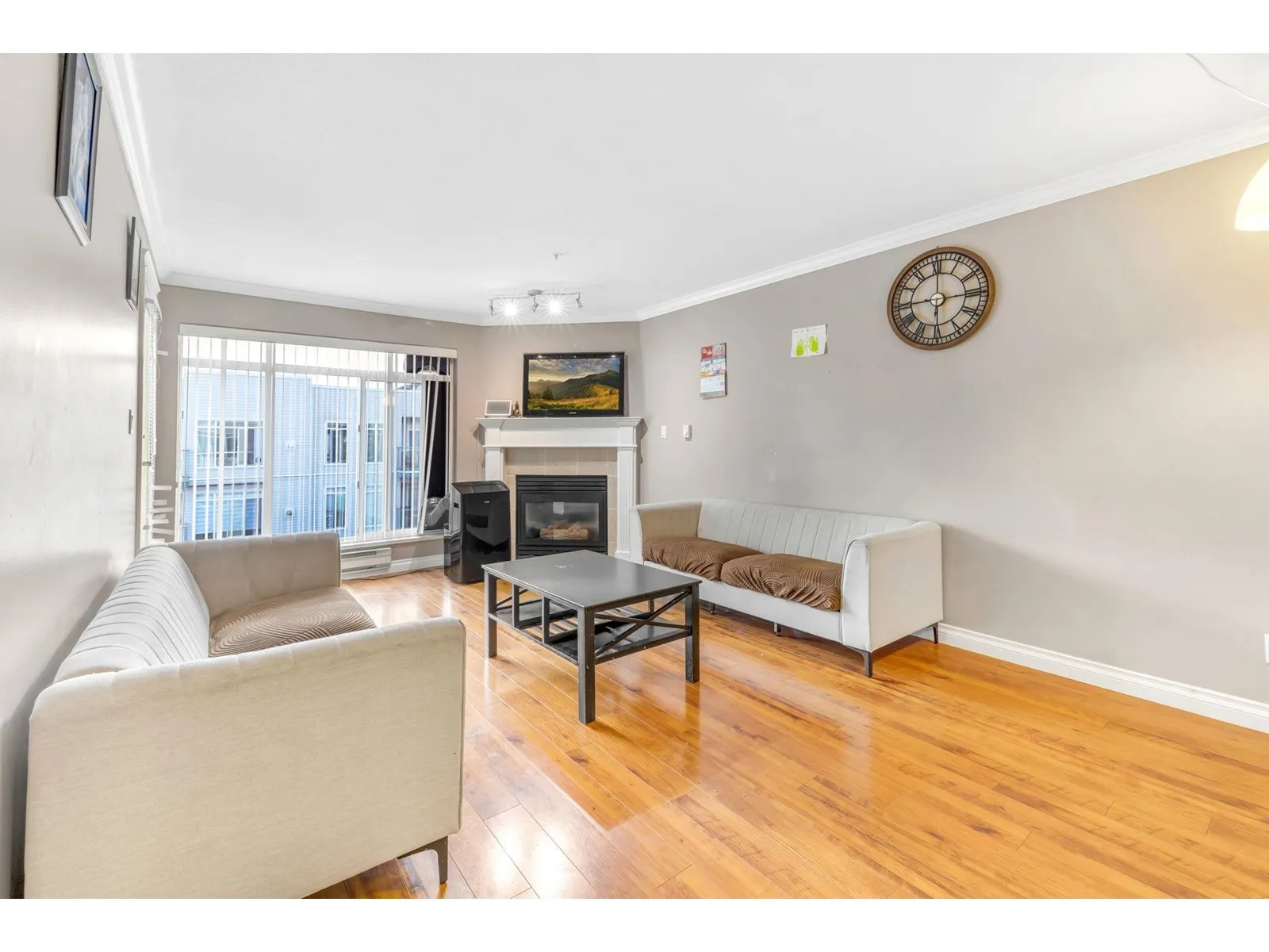 This top-floor, bright, and spacious unit at Arbour Court offers over 1,000 sqft of thoughtfully designed living space with 2 bedrooms, 2 bathrooms and 2 Parking. The open layout features a cozy gas fireplace, elegant laminate flooring, and a modern white kitchen with stainless steel appliances. Crown moulding adds sophistication, and large windows showcase views of the inner courtyard and North Shore Mountains. The primary bedroom has an ensuite, plus a second bedroom with a shared bath. Enjoy in-suite laundry, additional storage, and proximity to transit, shopping, recreation, and John MacLure School. (id:27476)