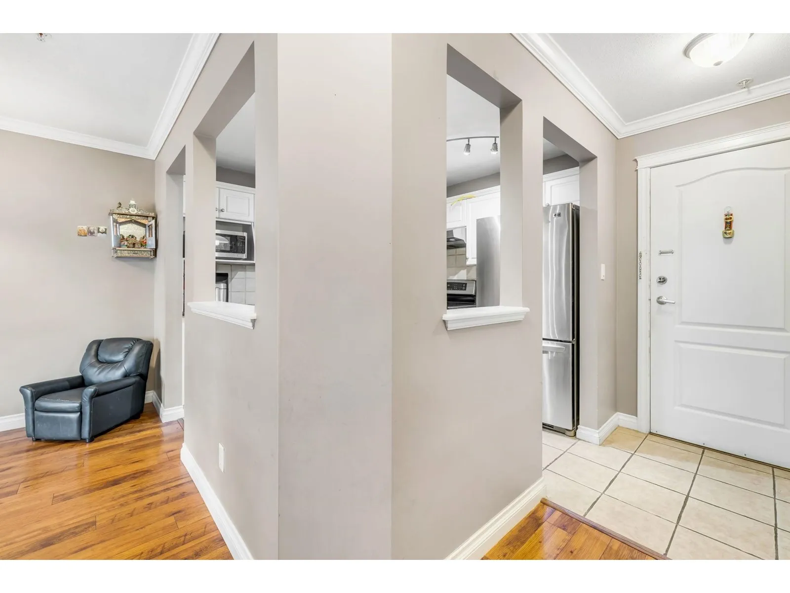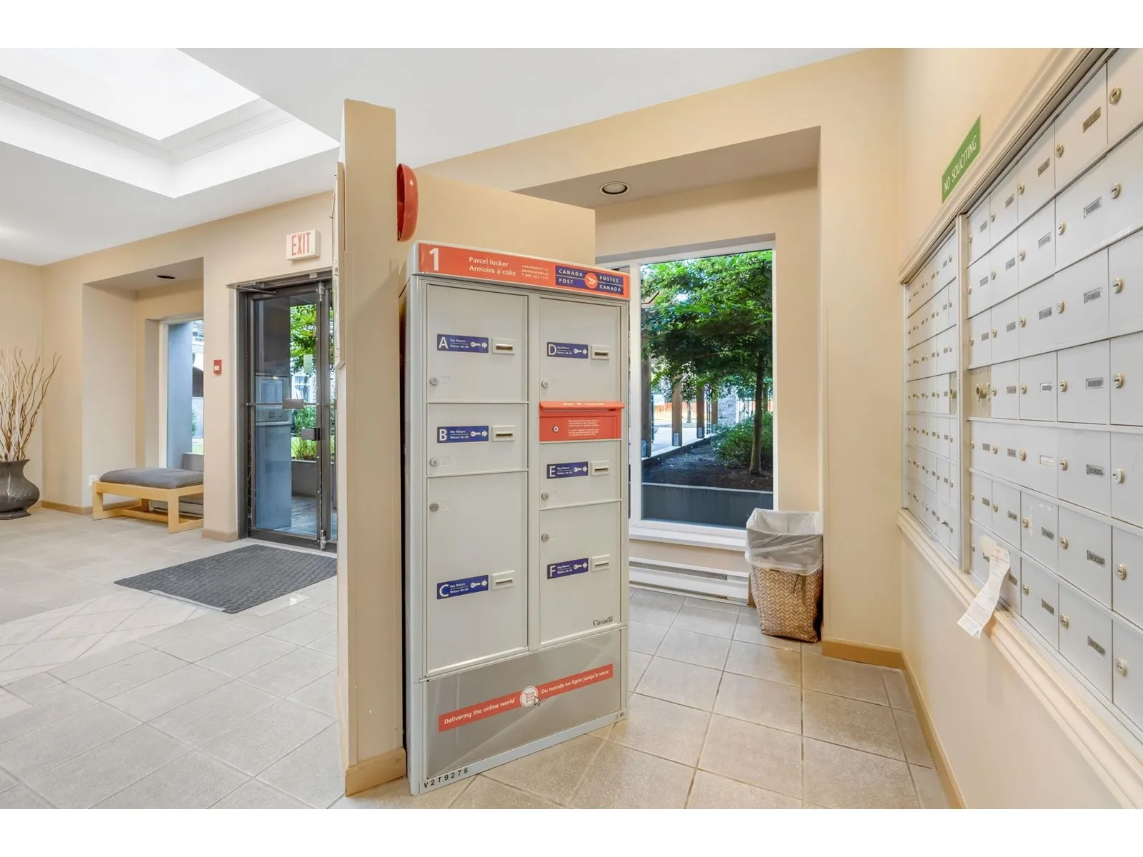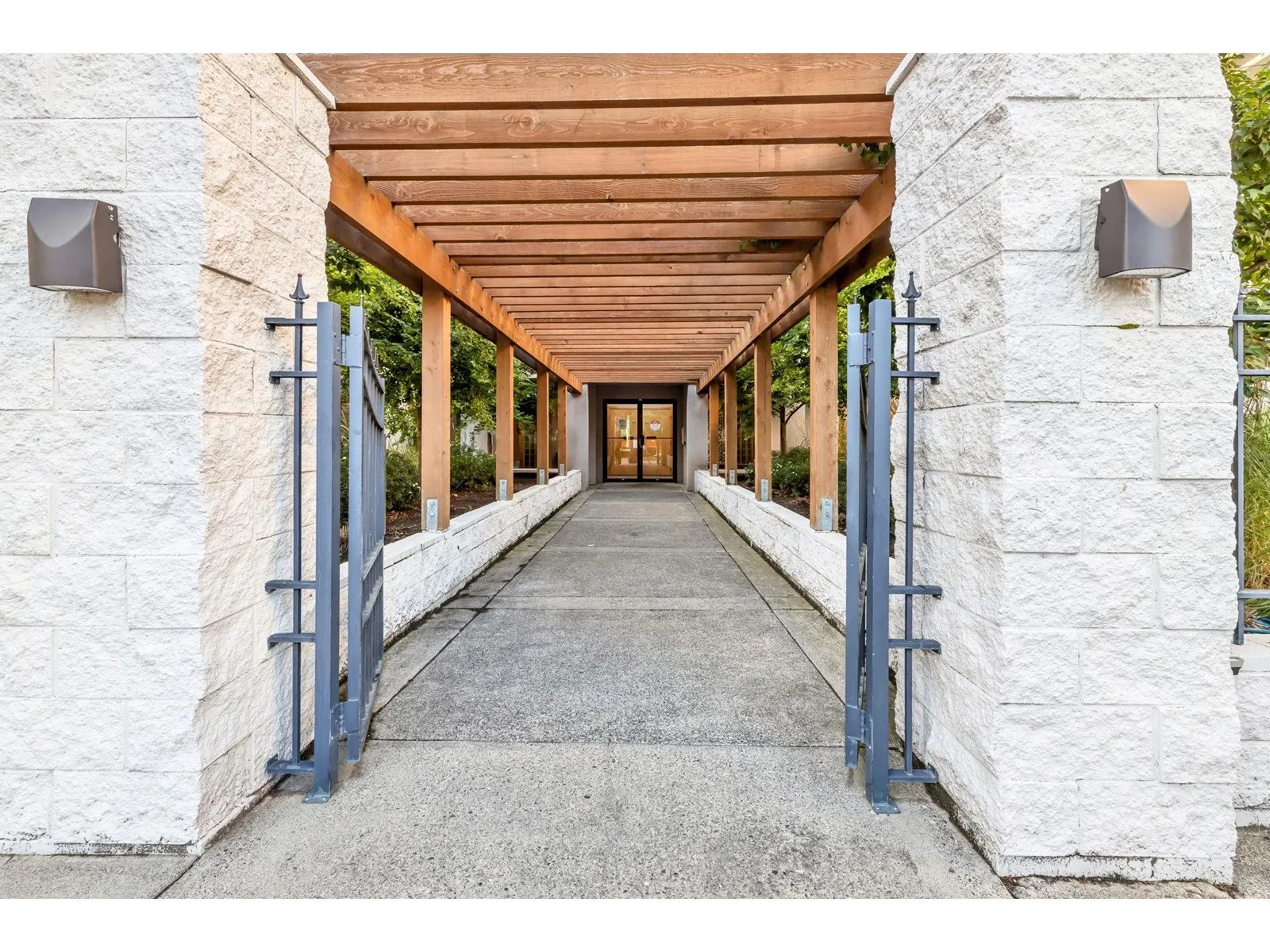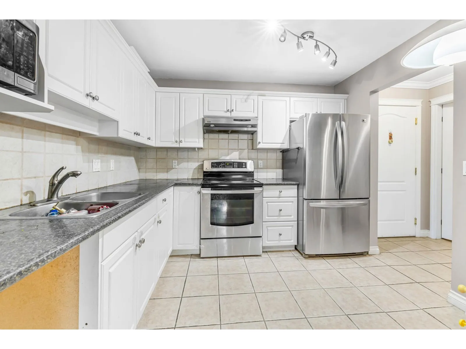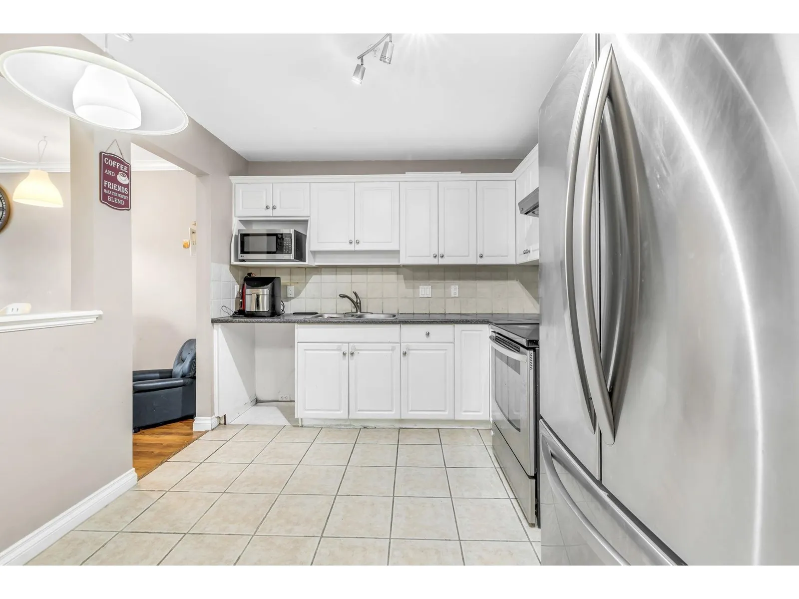 This top-floor, bright, and spacious unit at Arbour Court offers over 1,000 sqft of thoughtfully designed living space with 2 bedrooms, 2 bathrooms and 2 Parking. The open layout features a cozy gas fireplace, elegant laminate flooring, and a modern white kitchen with stainless steel appliances. Crown moulding adds sophistication, and large windows showcase views of the inner courtyard and North Shore Mountains. The primary bedroom has an ensuite, plus a second bedroom with a shared bath. Enjoy in-suite laundry, additional storage, and proximity to transit, shopping, recreation, and John MacLure School. (id:27476)