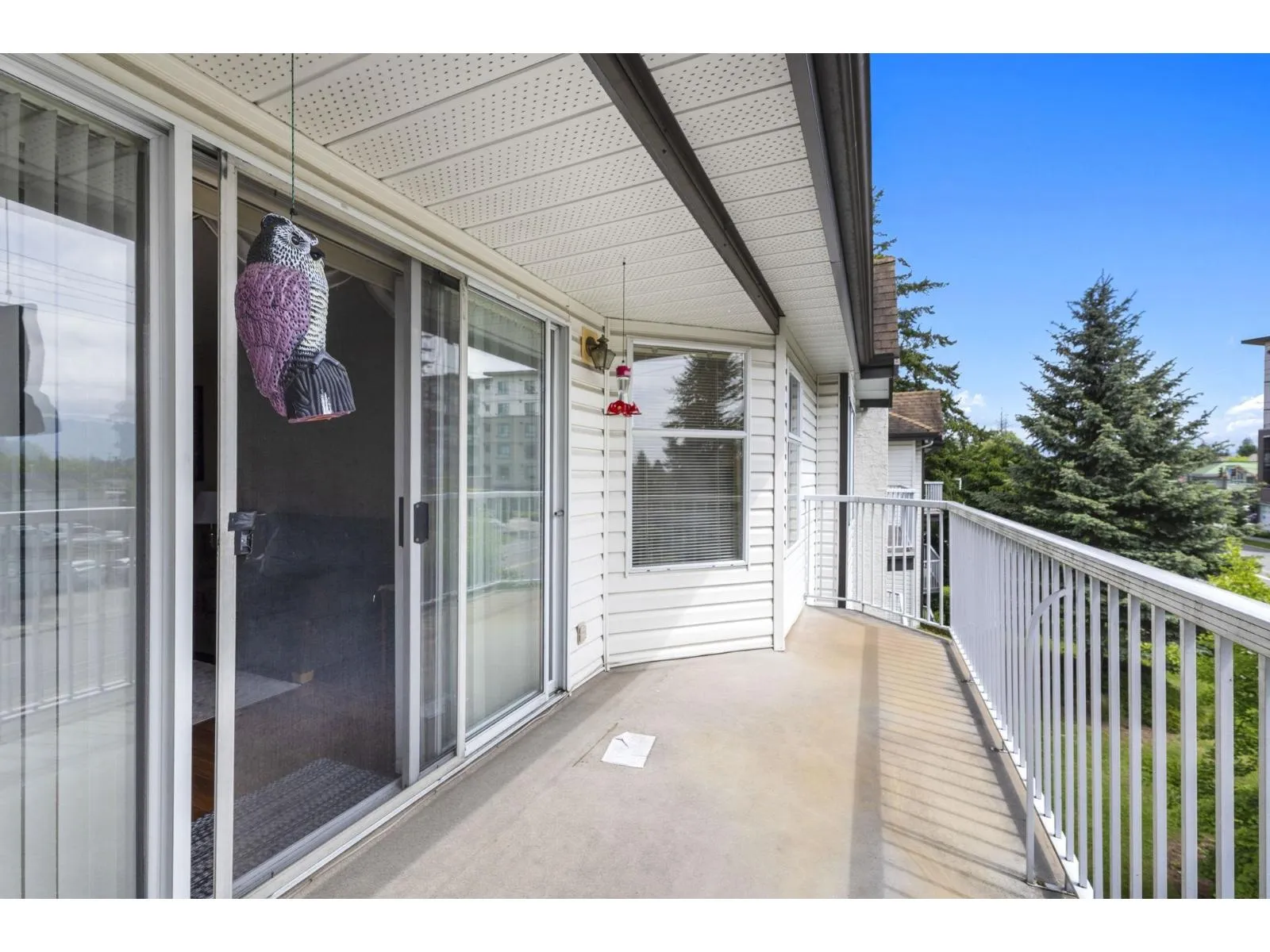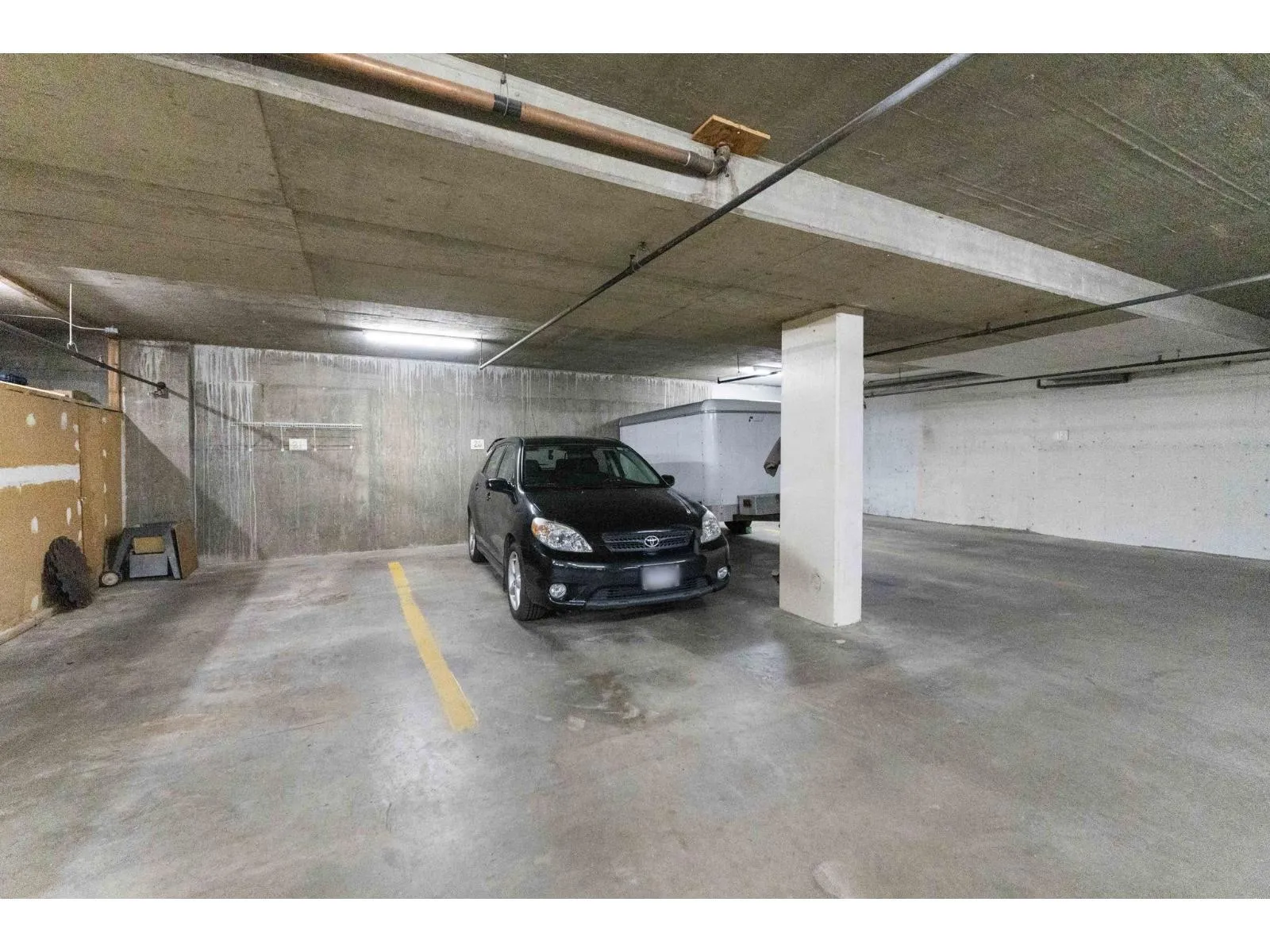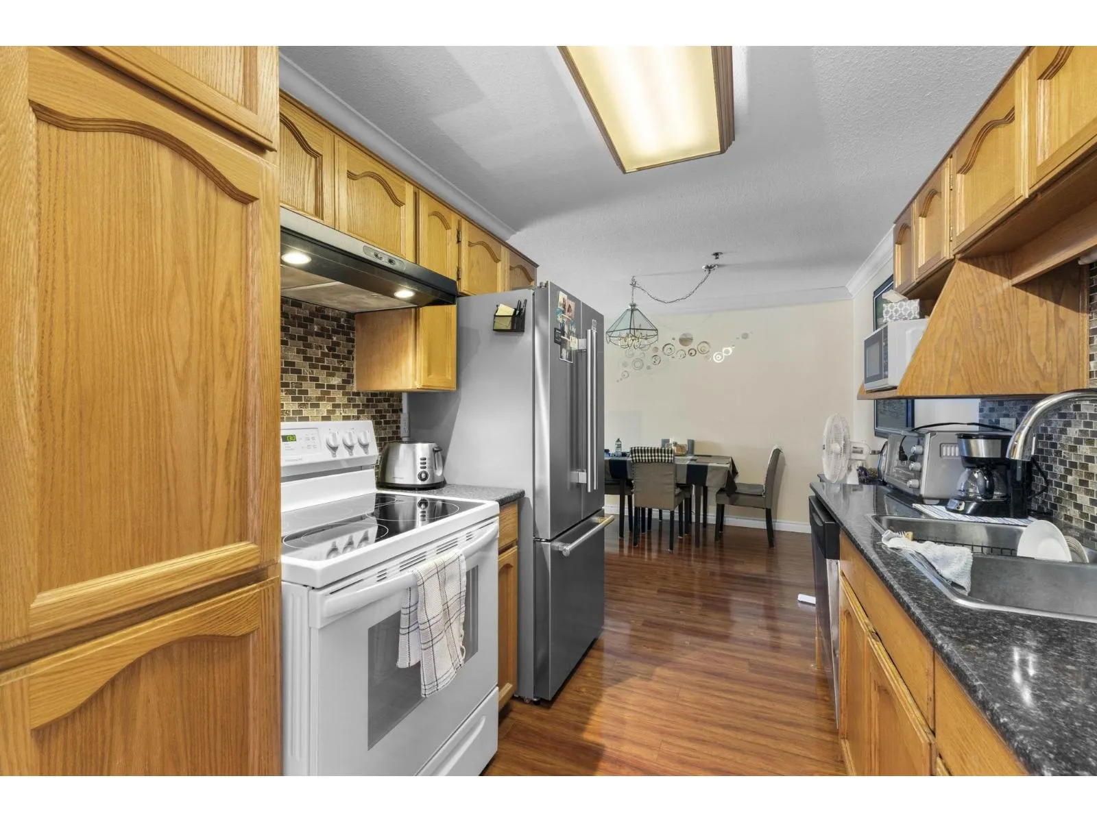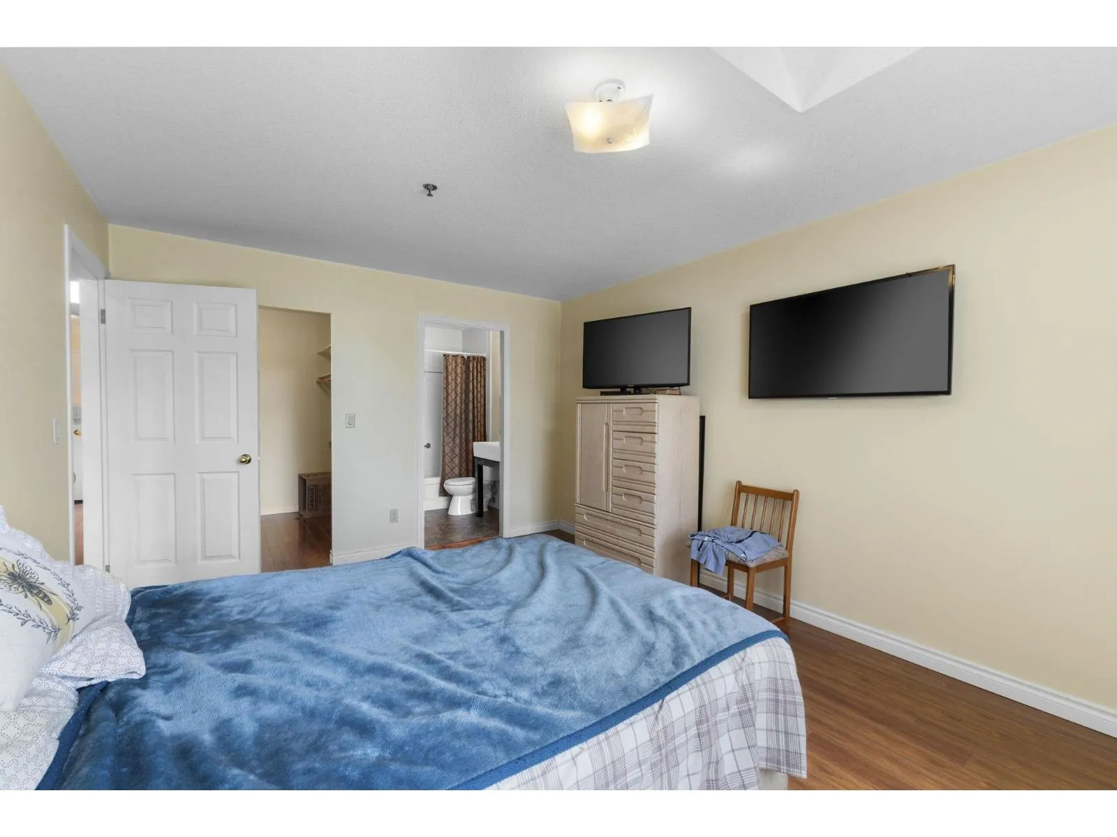 Top-floor charm in Central Heights Manor! This bright 2 bed, 2 bath condo welcomes you with a skylit foyer and stylish laminate floors throughout. Enjoy formal living and dining spaces with elegant crown moulding, rich draperies, and a cozy wall-mounted electric fireplace. Step into the sunny south-facing deck through sliding glass doors. The galley kitchen features sleek stainless steel appliances. Relax in the spacious primary bedroom with vaulted ceilings, walk-in closet, and 4-piece ensuite. The second bedroom is ideal as a guest room, office, or den. In-suite laundry with extra storage, 2 storage lockers, and a secure underground parking stall, and great amenities that include a gym, games room, workshop, art room, coffee area, guest suites, BBQ pit, and a community piano! (id:27476)