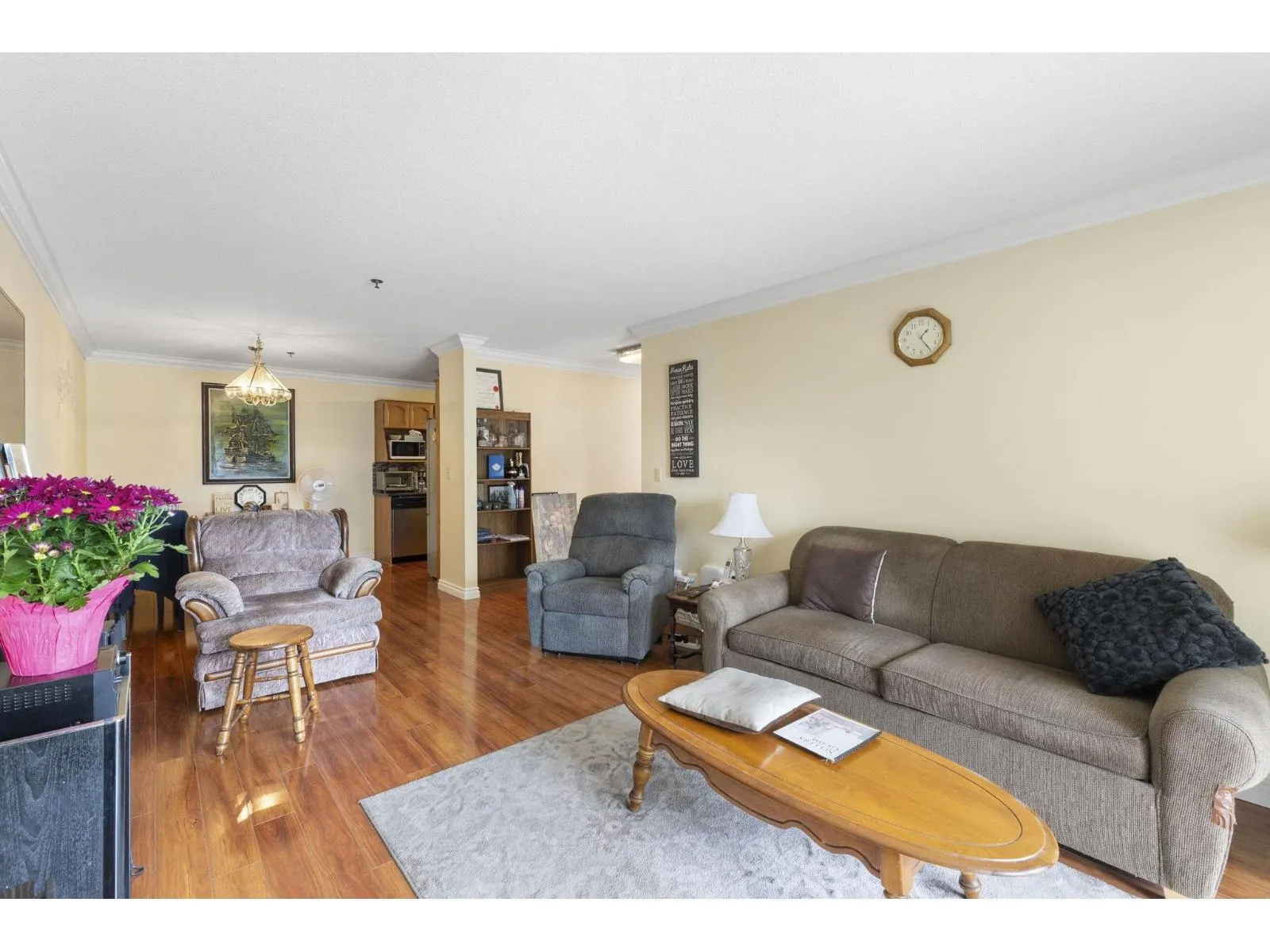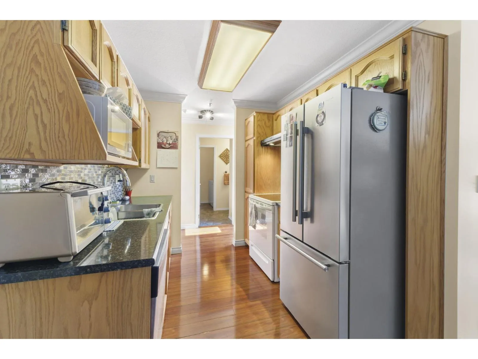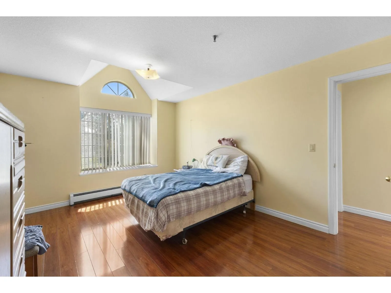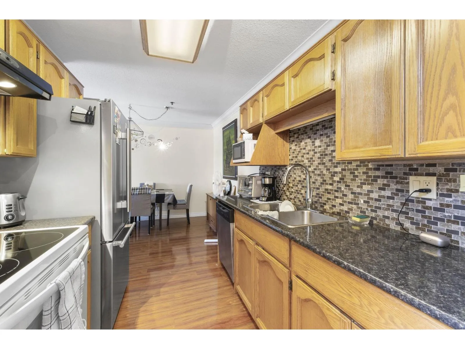 Top-floor charm in Central Heights Manor! This bright 2 bed, 2 bath condo welcomes you with a skylit foyer and stylish laminate floors throughout. Enjoy formal living and dining spaces with elegant crown moulding, rich draperies, and a cozy wall-mounted electric fireplace. Step into the sunny south-facing deck through sliding glass doors. The galley kitchen features sleek stainless steel appliances. Relax in the spacious primary bedroom with vaulted ceilings, walk-in closet, and 4-piece ensuite. The second bedroom is ideal as a guest room, office, or den. In-suite laundry with extra storage, 2 storage lockers, and a secure underground parking stall, and great amenities that include a gym, games room, workshop, art room, coffee area, guest suites, BBQ pit, and a community piano! (id:27476)