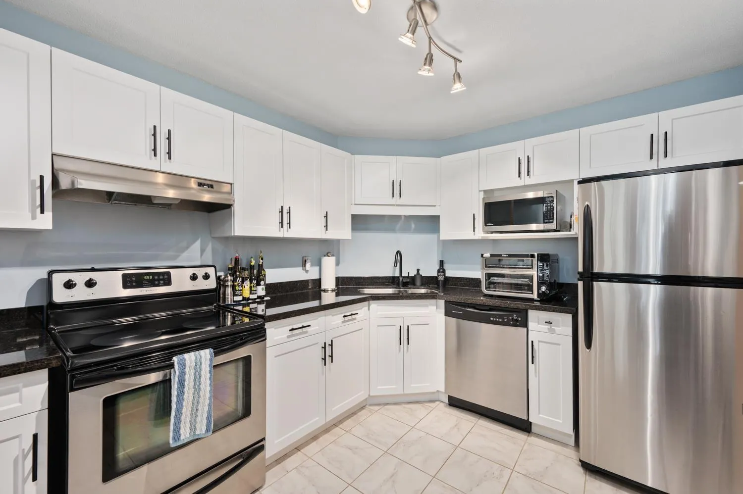 Welcome to Emerald Springs, one of Abbotsford's most desirable communities! This stunning top-floor 2-bedroom, 2-bath condo offers peaceful south-facing views of the greenbelt, filling the home with natural light. Featuring vaulted ceilings, two balconies, and an open-concept layout, it's perfect for modern living. Beautifully renovated with a brand-new kitchen, granite countertops, stainless steel appliances, updated lighting, new flooring, ceiling sprinklers, and fresh paint-this home is truly move-in ready. Enjoy access to fantastic amenities, including a gym, clubhouse, fibre optic internet, and cellphone intercom. Ideally located within walking distance to shopping, Mill Lake, schools, library, pool, and transit, with quick access to Hwy 1 and the hospital. A rare opportunity to own a top-floor gem surrounded by nature and convenience-don't miss it! (id:27476)