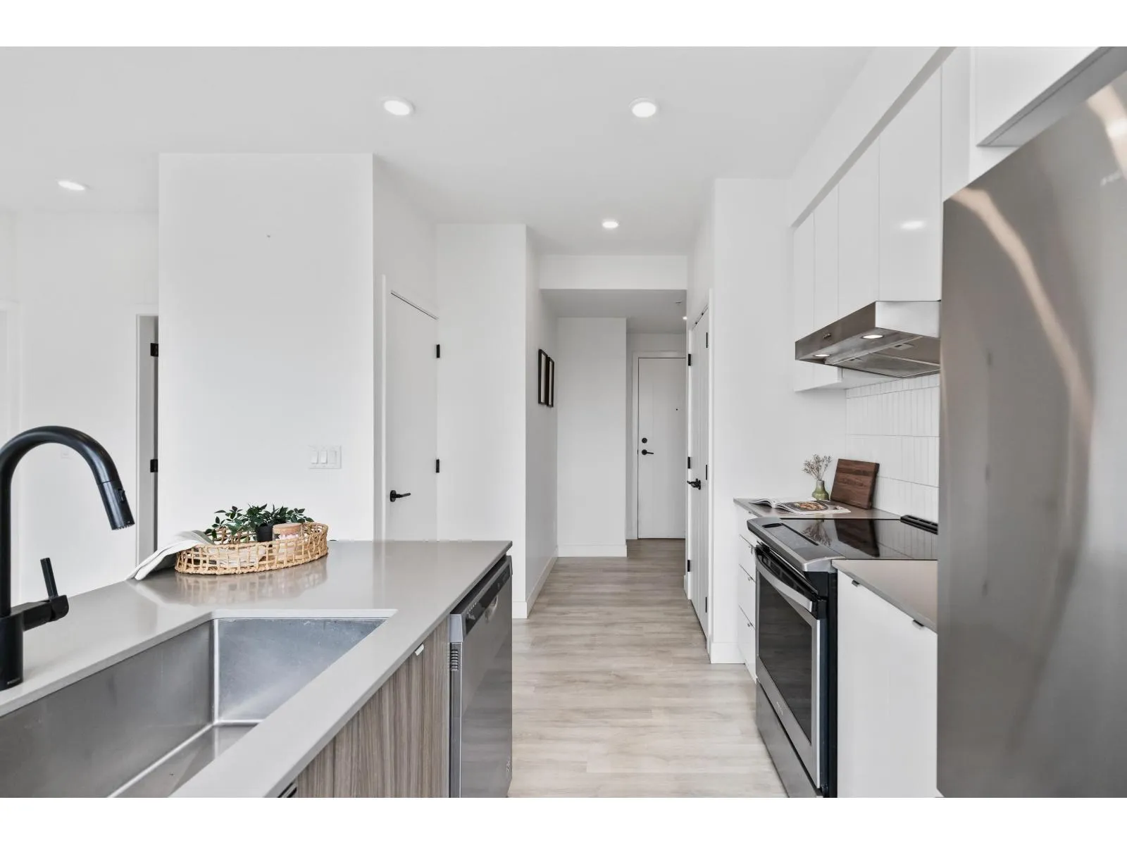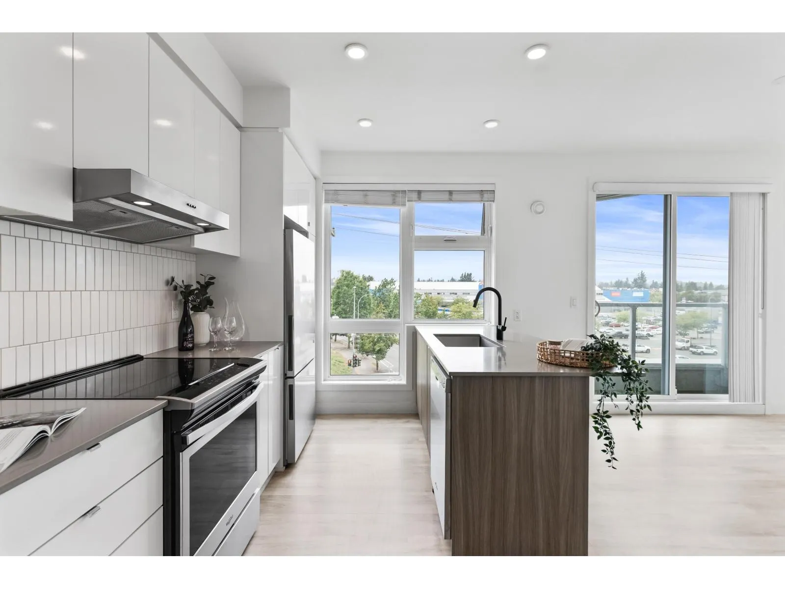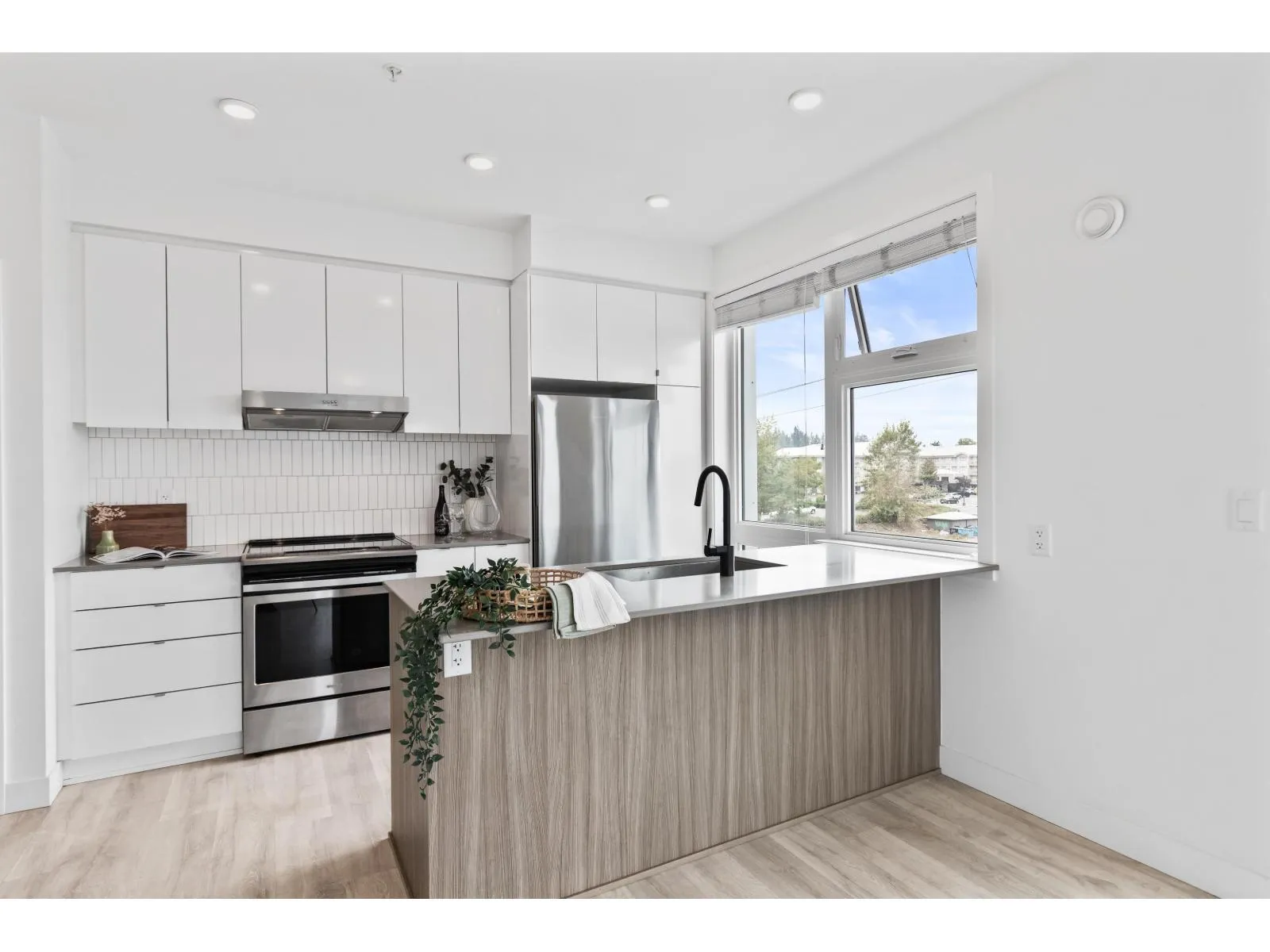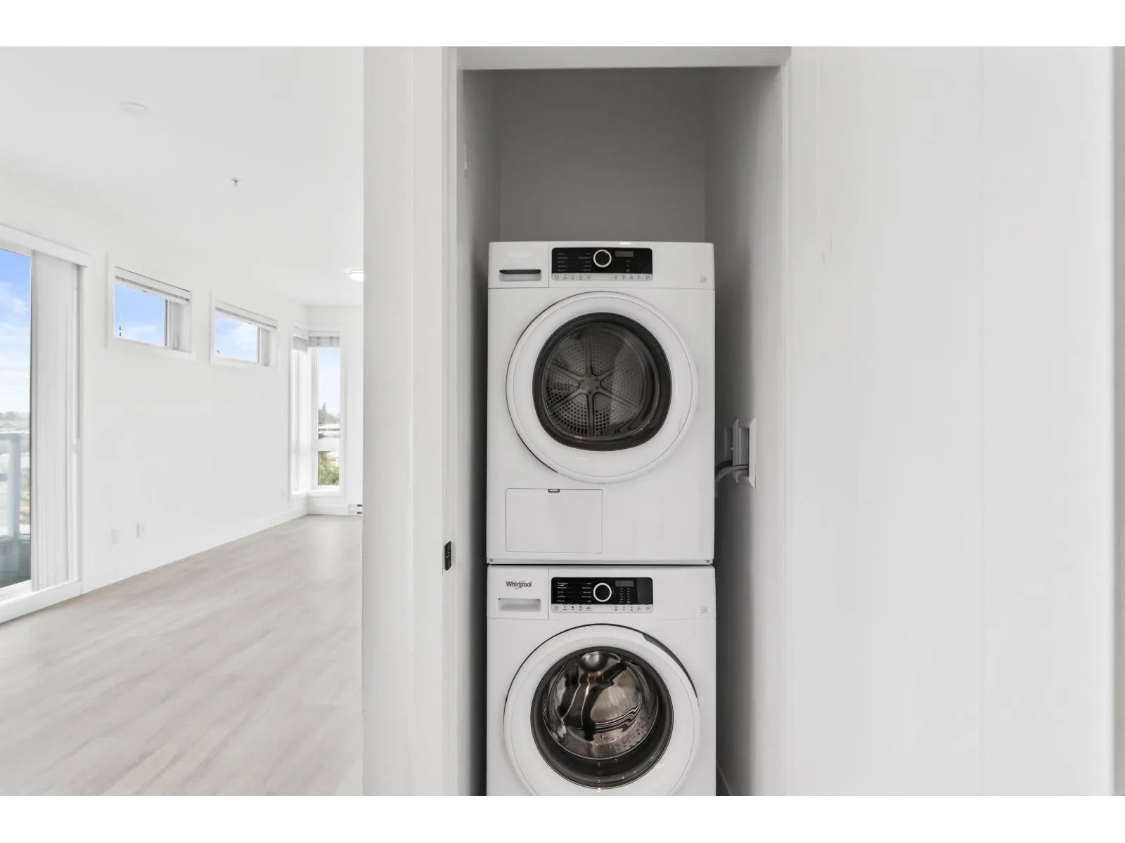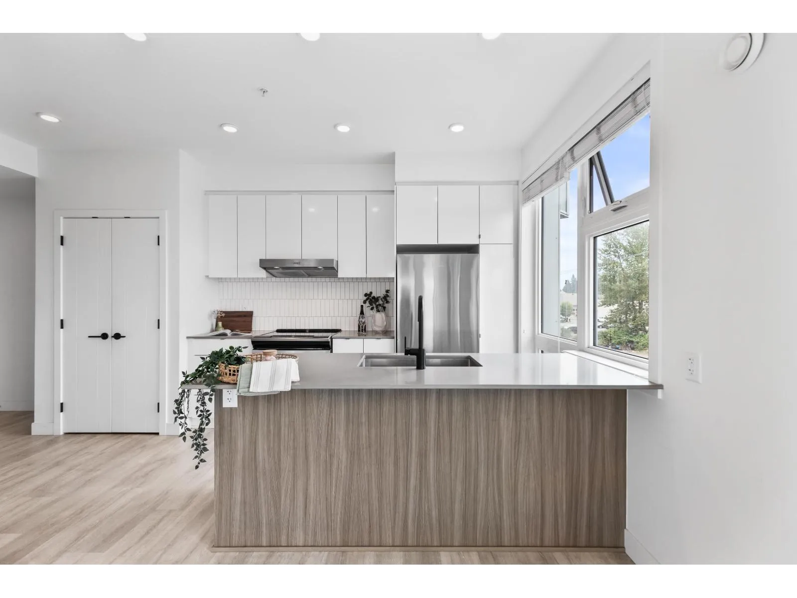 Light-filled and stylish, this Scandinavian-inspired corner condo pairs contemporary design with a prime location. Wide-plank floors and large windows flood the space with natural light, while a Juliette balcony adds fresh air. The kitchen shines with Fisher & Paykel + Whirlpool appliances, quartz counters, and an eating bar. Enjoy in-suite laundry, a versatile pantry/closet, spacious entry, and a quality primary closet organizer. COURT WEST allows 2 pets and offers a massive courtyard with movie nights, shared EV chargers, secure bike room, 1 parking stall, and a large locker-steps to Seven Oaks Mall, Superstore, Trading Post Brewing, Cora's, transit, and minutes to Mill Lake Park. QUICK COMPLETION POSSIBLE (id:27476)
