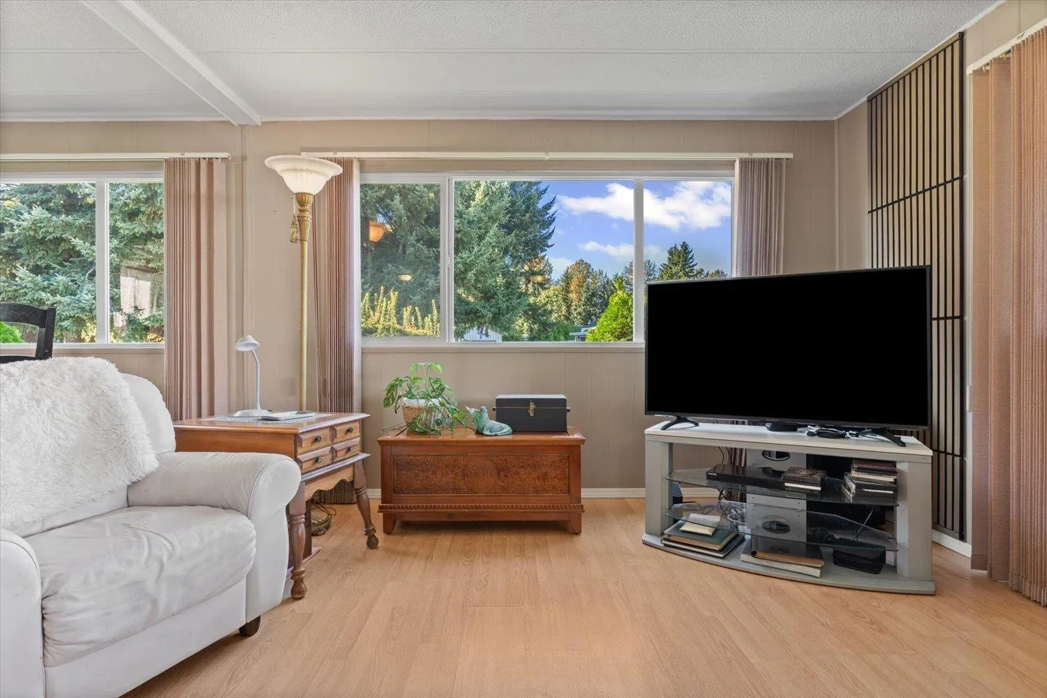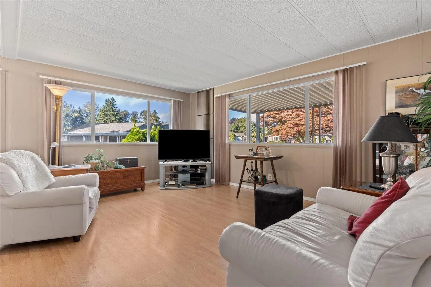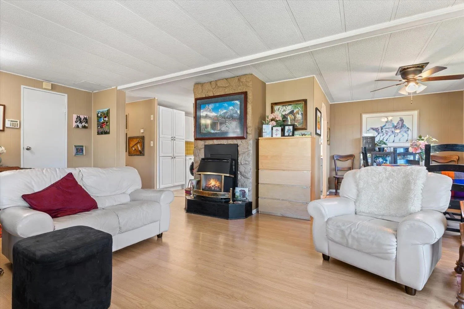 Welcome to Paradise Park! One of Abbotsford's most friendly and secure 55+ communities. This well-cared-for double-wide home offers 2 bedrooms, 2 bathrooms, and a bright, inviting layout filled with natural light and warmth. Enjoy peace of mind with numerous exterior updates and the charm of a cozy, functional floor plan. The enclosed patio opens to a spacious backyard with two storage sheds and room for your garden or outdoor retreat. Manicured grounds, wonderful neighbors, and the bonus of one small pet allowed make this community truly special. Attractively priced for a senior budget, this home is a must-see! (id:27476)