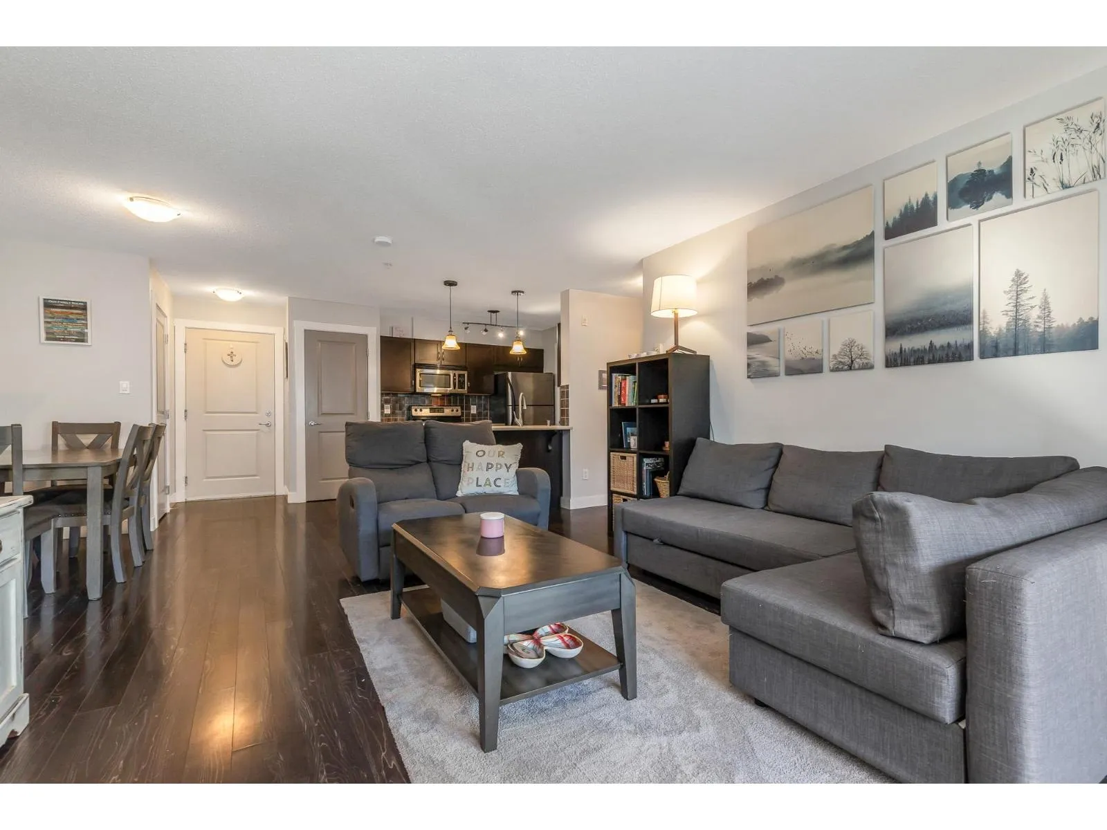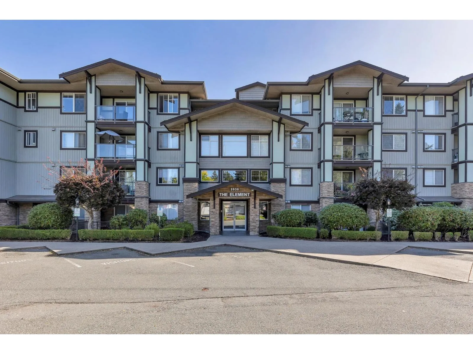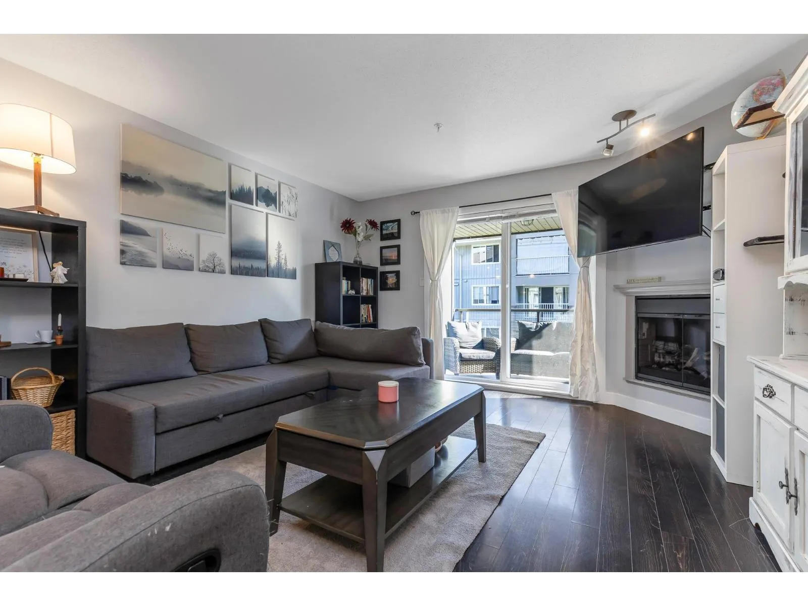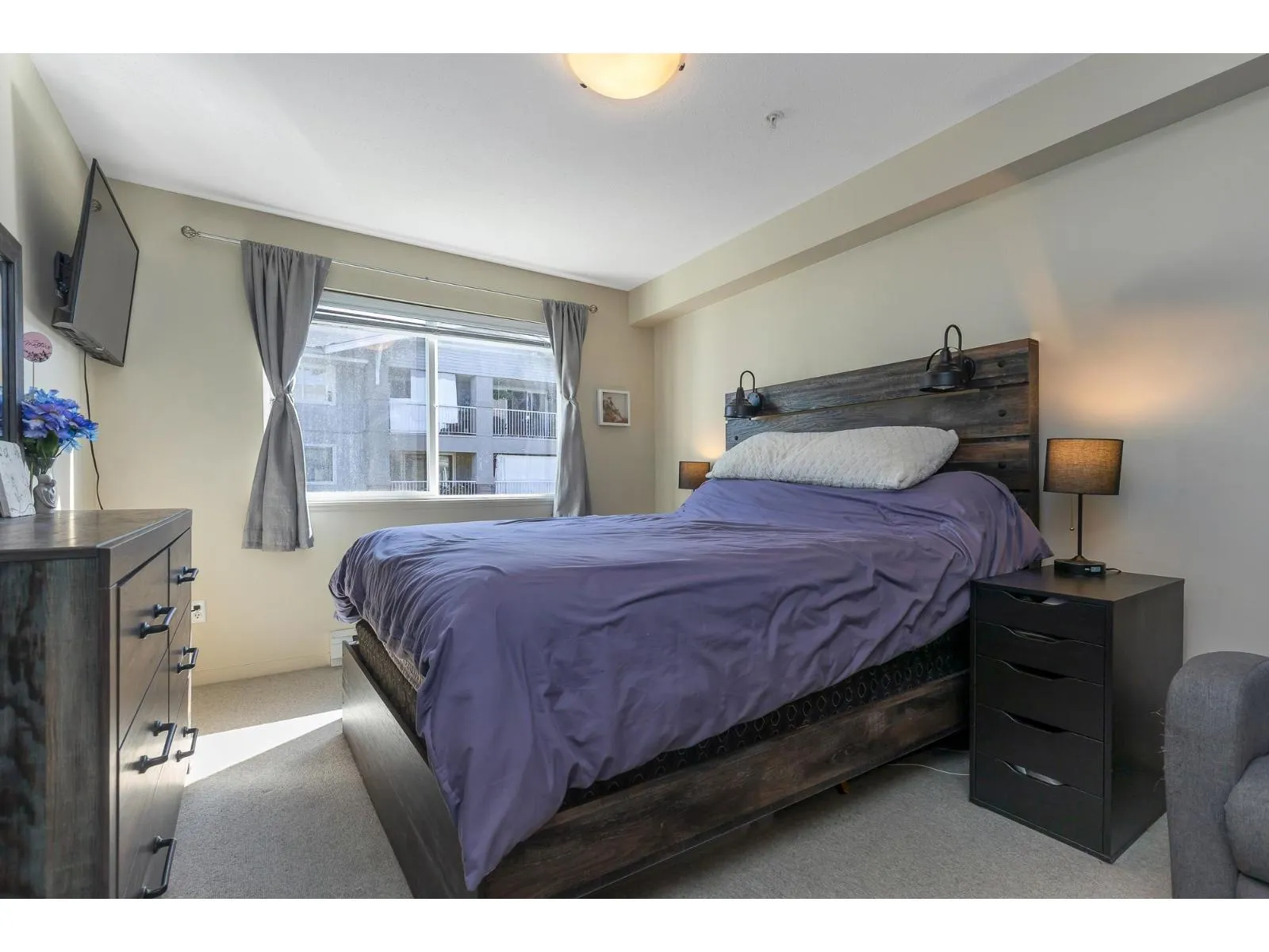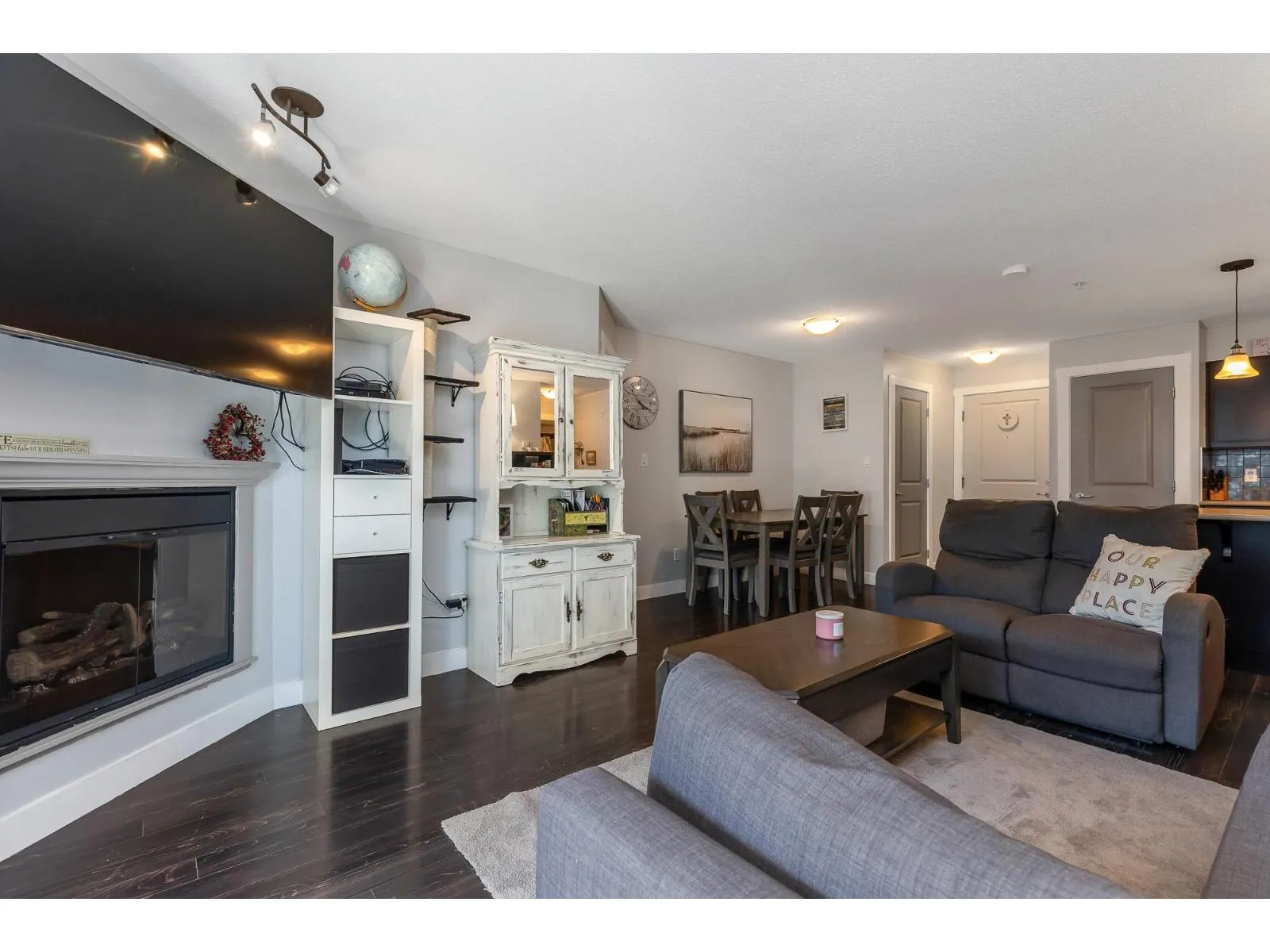 Welcome to The Element! This bright 3rd floor 2-bed, 2-bath home offers an inviting & functional layout in a well maintained complex. Enjoy a spacious living area w/ room for both dining & relaxing, a well-equipped kitchen, good-sized bedrooms, & ample storage. Features incl: a cozy electric fireplace, laminate floorings, S/S appliances and a great room feel, perfect for hosting. The covered east-facing deck is perfect for morning coffee or unwinding in the evening. Located on a quiet street with easy building access & plenty of visitor parking, it includes one underground parking stall & a separate storage locker. Excellent location for commuters and students alike with quick freeway access, and within walking distance to UFV. Rentals allowed, and one small dog or cat is welcome! (id:27476)