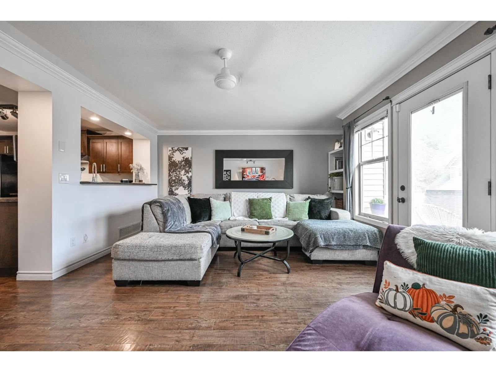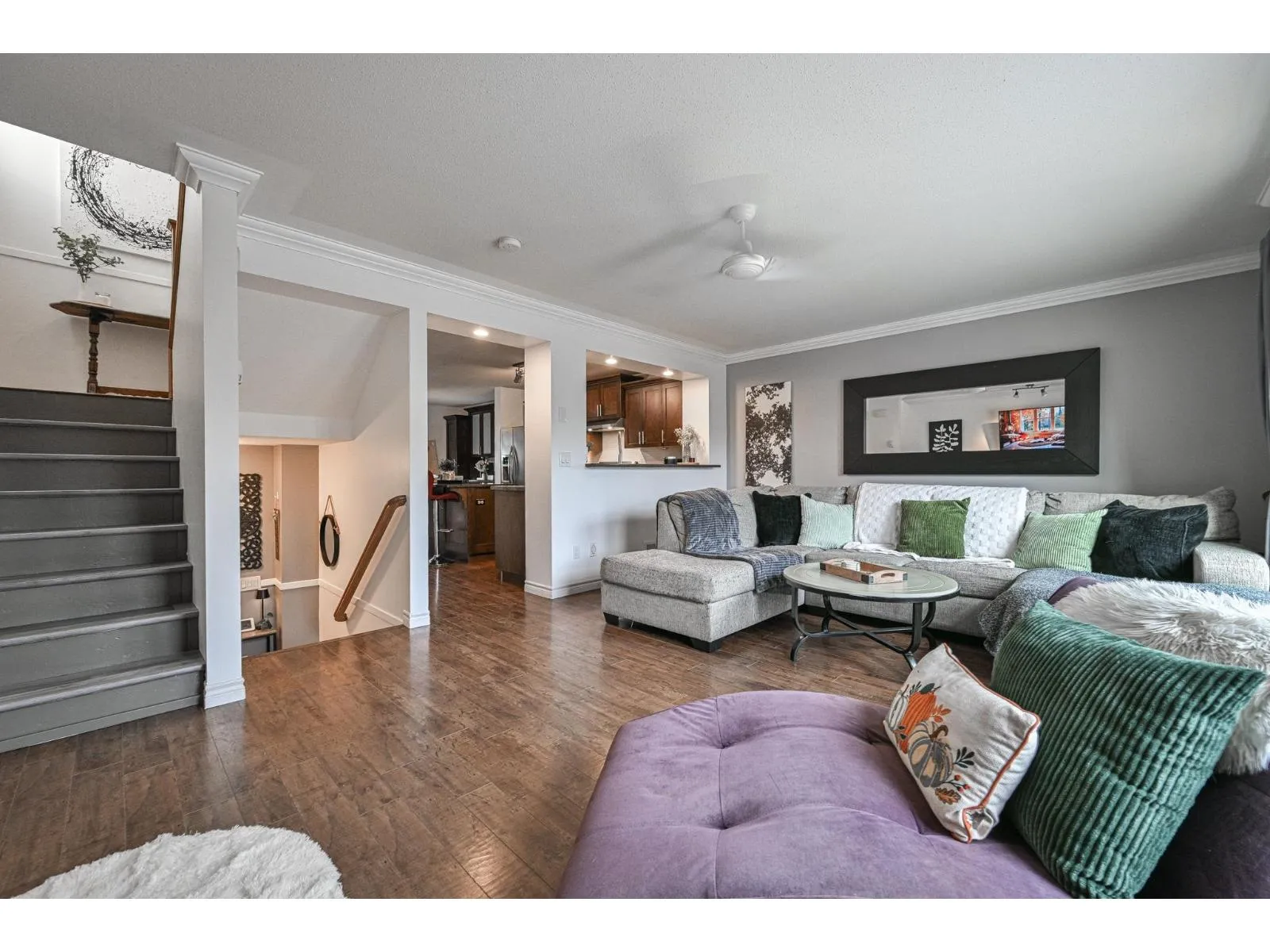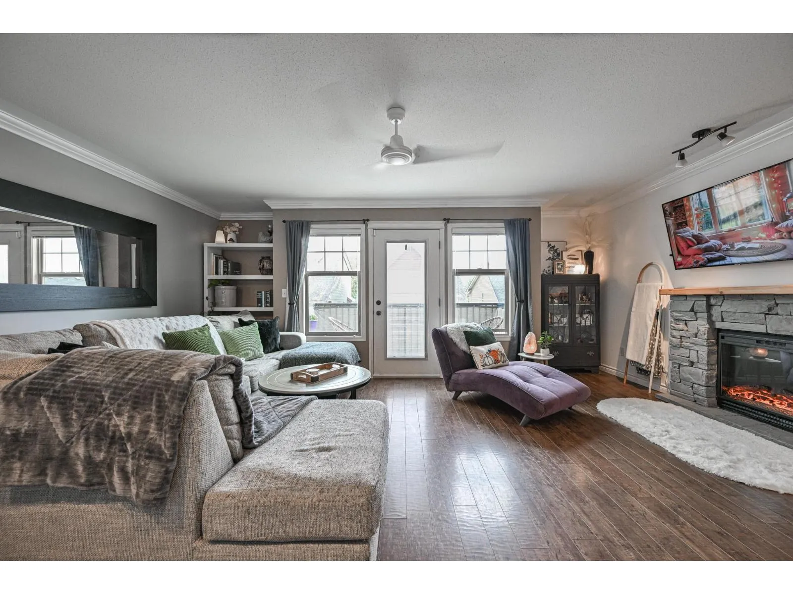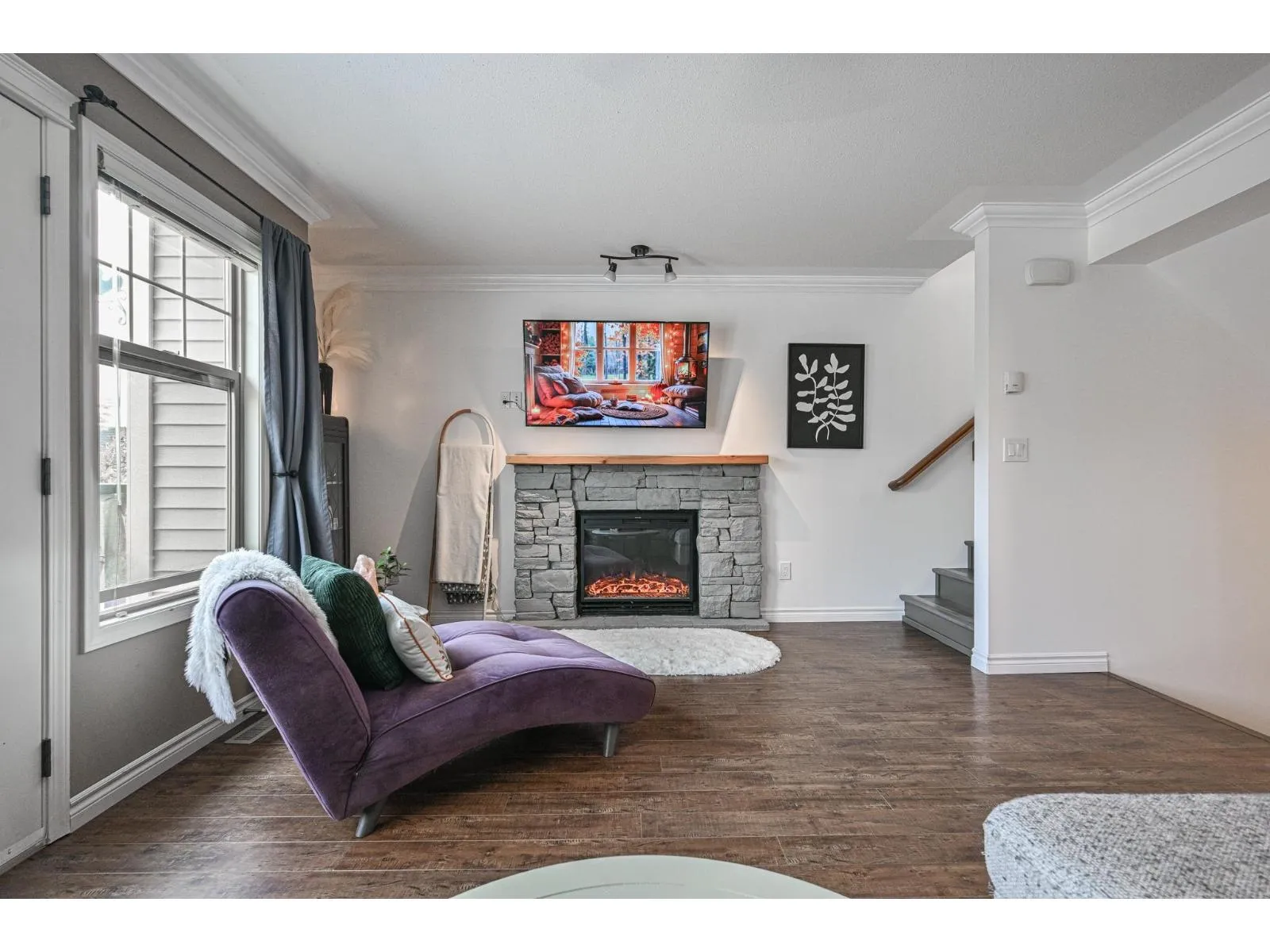 Welcome to Junction Creek! This FULLY DETACHED Whistler chalet-style townhome blends house-like space with strata ease. Bright open main floor boasts high ceilings, laminate floors, updated S/S kitchen appliances, shaker-style cabinets, centre island, stone elec fireplace, built-in hutch, den/small bedroom, dining area, walkout patio & front balcony. Upstairs: 2 generous spare beds, 4-pc shared bath, spacious laundry w/cabinetry, & large primary w/walk-in closet & 3 pc ensuite bath. Basement rec room ideal for movies or play. Upgrades: A/C, paint, flooring, light fixtures, & more. Side-by-side double garage + 2 driveway spots, & visitor parking avail. Pet-friendly! Prime spot near Hwy 1, shops, restaurants, schools (Prince Charles Elem, Clayburn Middle). Unbeatable value-see it today! (id:27476)