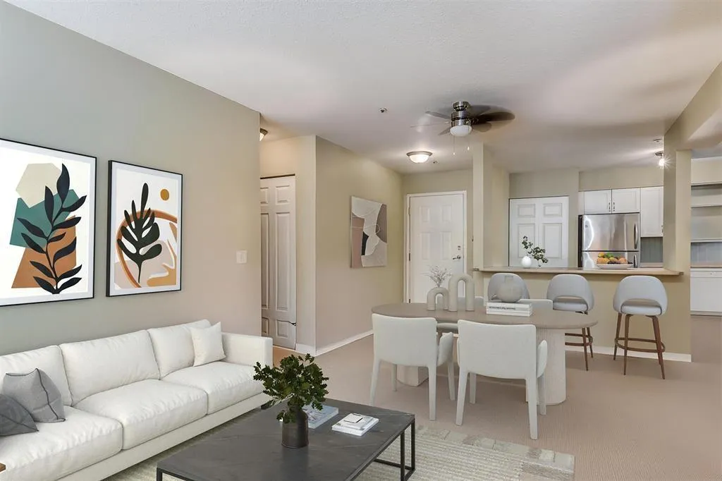 Welcome to The Seasons - the best location in Abbotsford! This stylish and affordable corner condo is perfect for first-time buyers or investors. Thoughtfully designed with 2 bedrooms on opposite ends for privacy, including a walk-through closet to ensuite. The open floor plan offers a bright, spacious living and dining area with plenty of natural light. Large pantry off kitchen with tons of space. Bonus is a lovely balcony to sit and relax. Enjoy tranquil, park-like grounds with arbours and a peaceful water fountain. Walk to shops and restaurants. The building features new balconies, doors, windows, and paint. Pet and rental friendly. Includes 1 parking, 1 storage locker, fitness room, rec room, visitor parking, and heat & hot water included in a maintenance fees. A great find! 24 hour notice. (id:27476)
